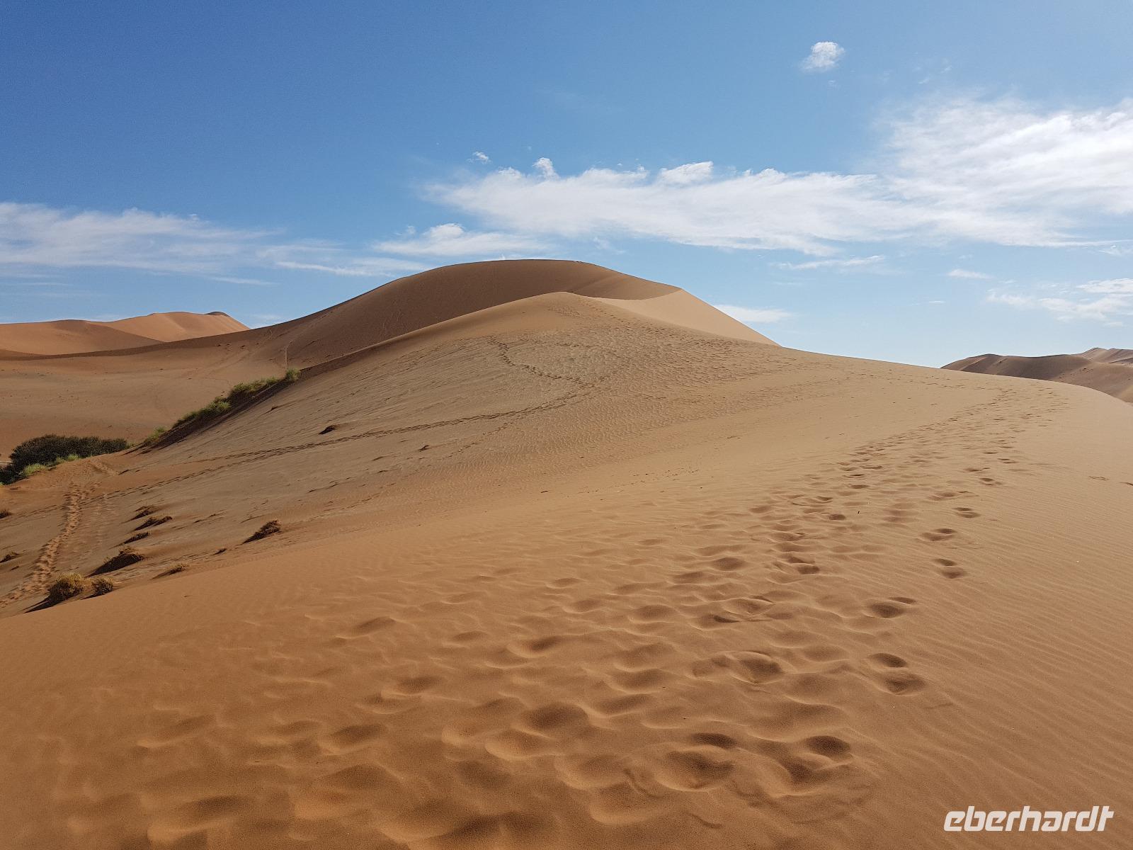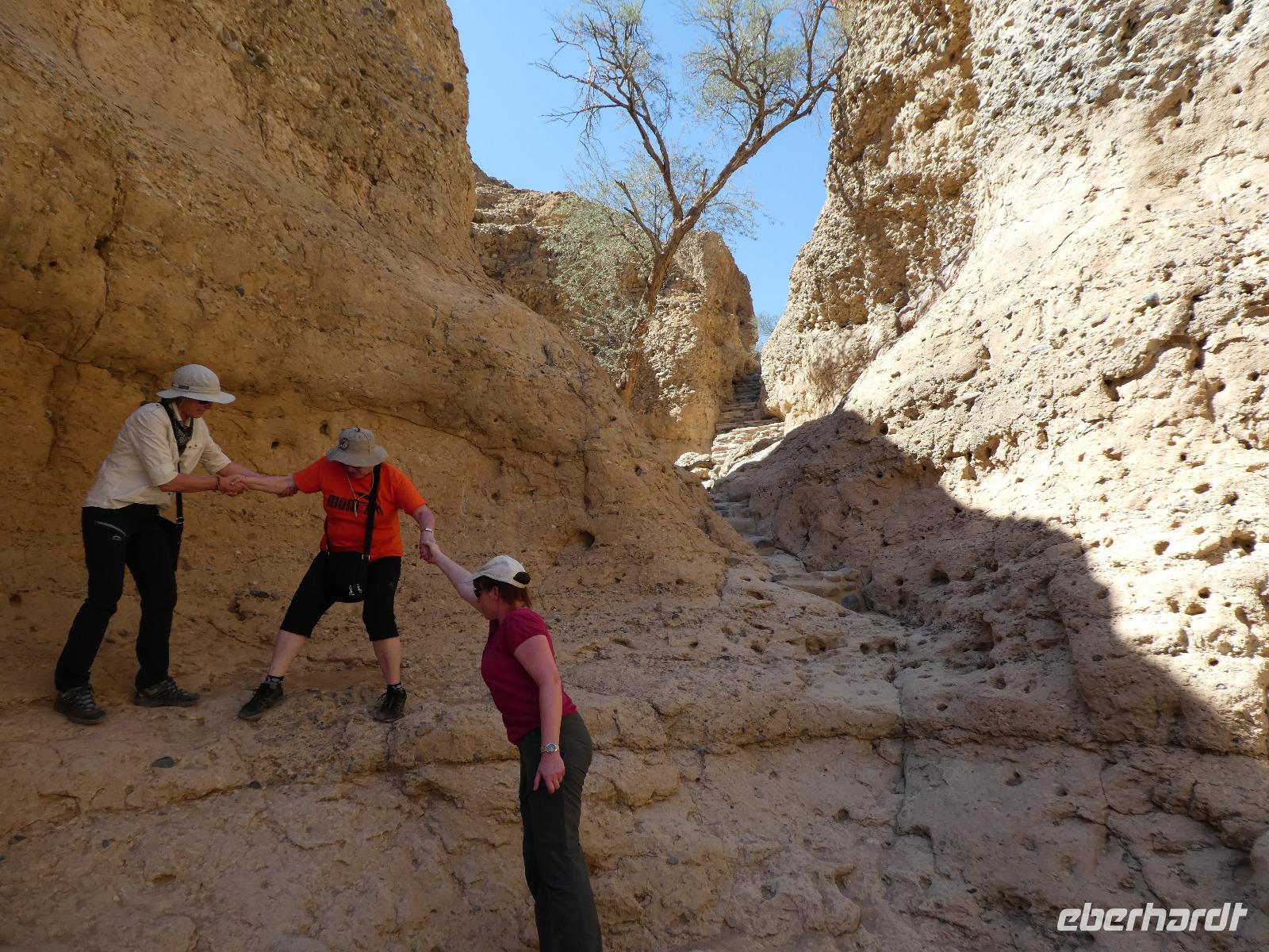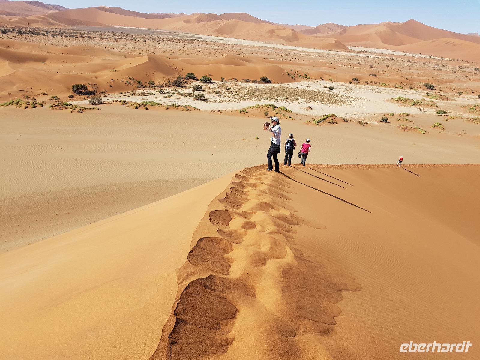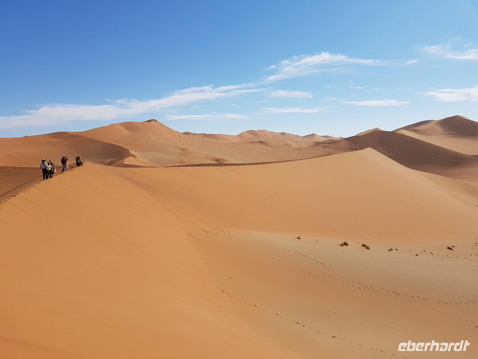 Heute stand ein ganz besonderes Erlebnis auf dem Programm und da mussten wir sehr früh starten. Wir tranken nur einen Kaffee und nahmen unsere Frühstückspakete mit. Noch vor Sonnenaufgang erreichten wir das Tor zum Sossusviel Nationalpark. Eine lange Schlange von Fahrzeugen wartete. Aber das Tor öffnete erst bei Sonnenaufgang. Deshalb machten wir noch eine Pause und Barbara bestellte für den Nachmittag Sandwiches. Wir fuhren hinein und machten viele Fotostopp an den Dünen. Barbara zeigte uns verschiedene Spuren im Sand und berichtete über die Tiere. Noch ein Gruppen Foto im roten Sand und dann hielten wir an der berühmten Düne 45. Wir stiegen ein Stück hinauf und machten wieder viele Fotos. Dann ging's mit unserem Truck zum 4x4 Parkplatz und weiter in offenen Jeeps ins Sossusvlie zur Mamadüne. Wir hatten genügend Zeit, um ganz hinauf zu gehen. Es war schweisstreibend - 2 Schritte vor und einer zurück tief im Sand. Die Mühe hatte sich aber gelohnt und wir hatten traumhafte Ausblicke in alle Richtungen. Wieder unten war die Gruppe vereint und zurück fuhren wir wieder erst mit den Jeeps und weiter mit unserem Truck bis zum Eingang in den Sesriemcanyon. Wir stiegen hinab in den Canyon und liefen unten durch die Felsen - ein unvergessliches Bild. Wieder oben gab es Wein und Datteln, denn heute war unser Bergfest und leider die Hälfte der Reise vorbei. Noch einmal übernachteten wir in der Hammerstein Lodge.