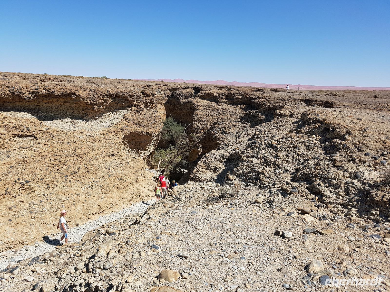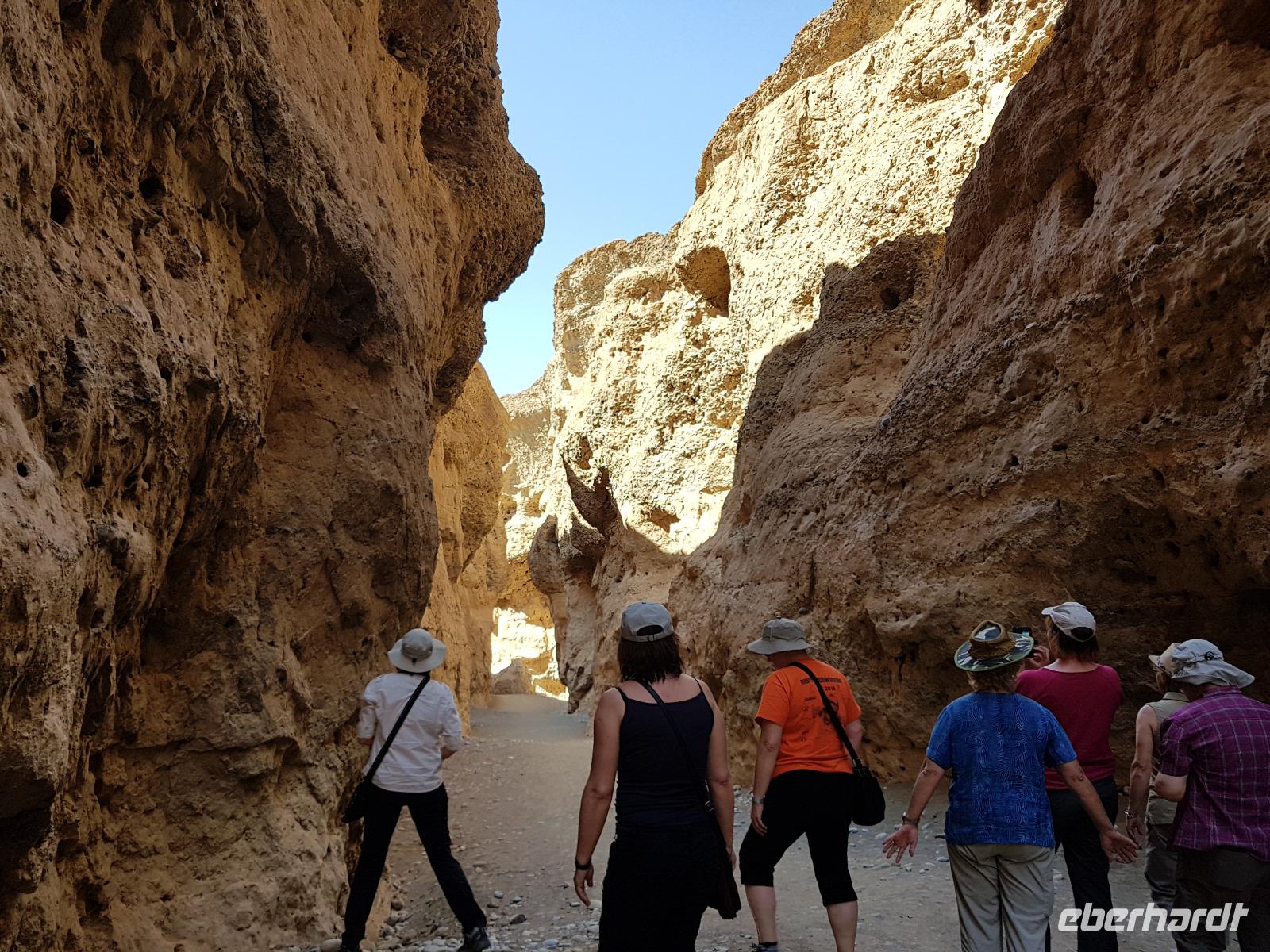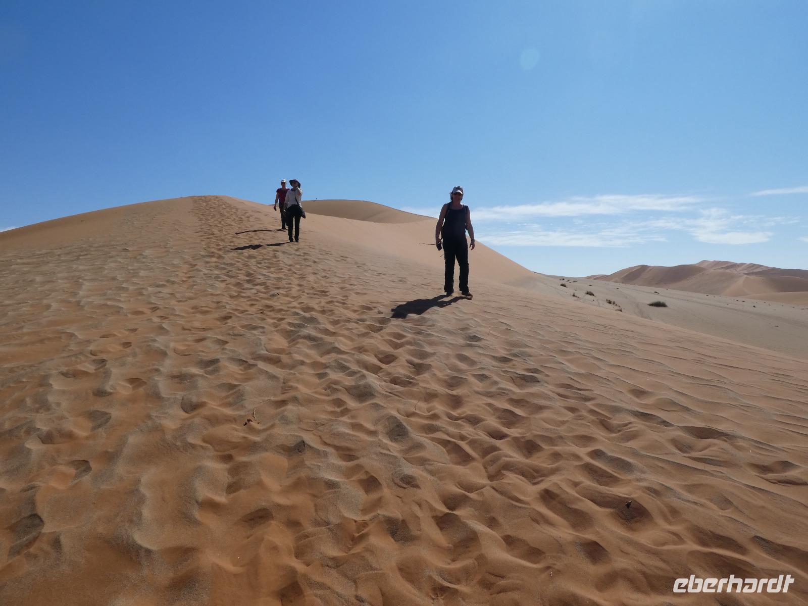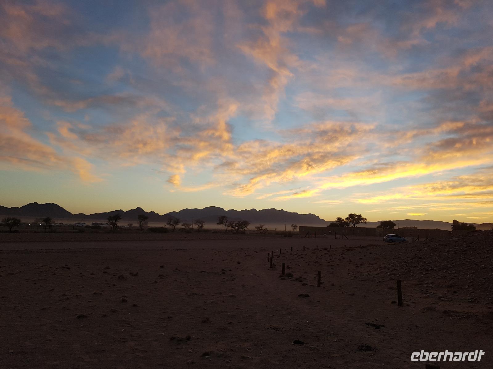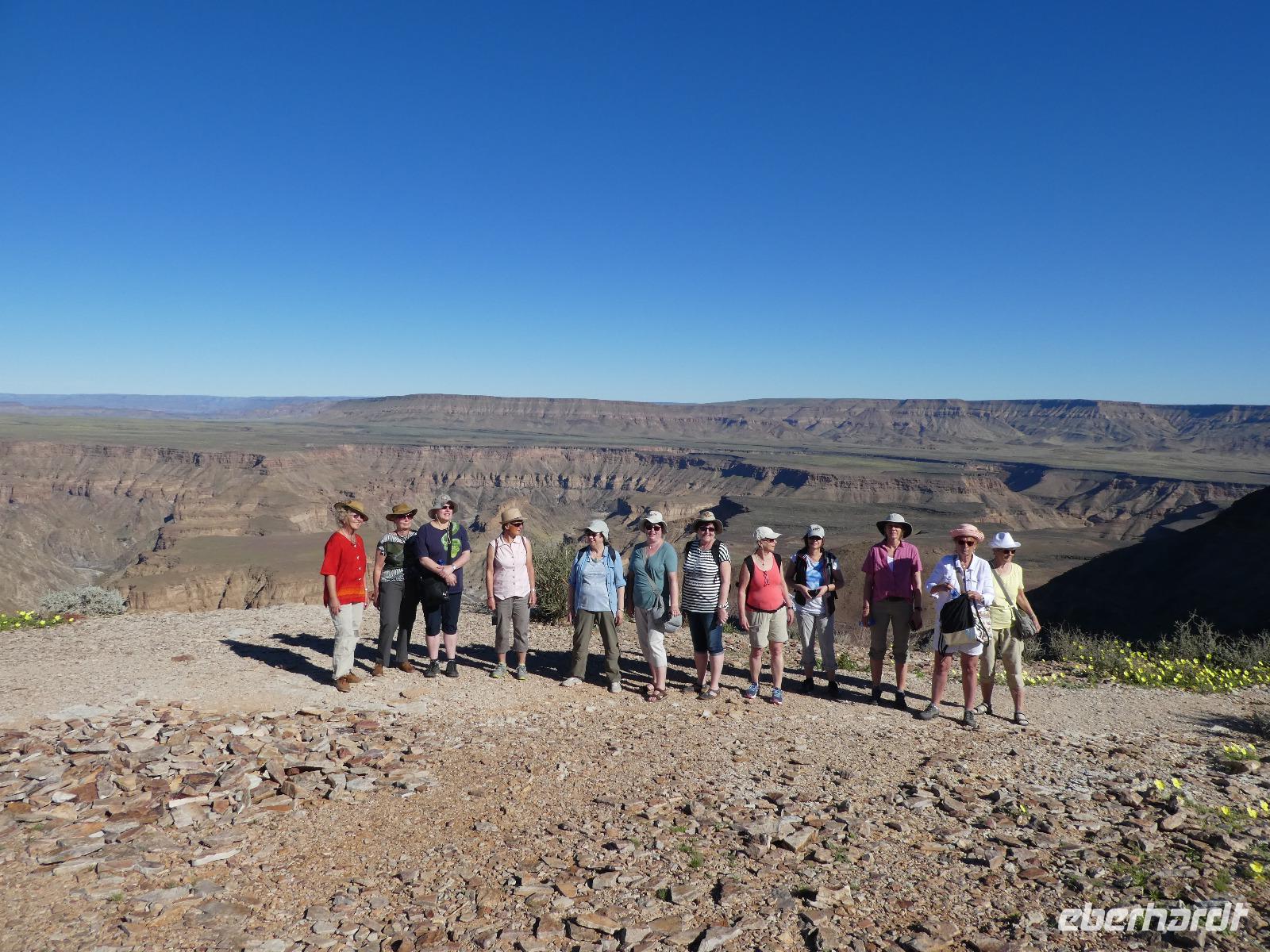 Heute stand ein ganz besonderes Erlebnis auf dem Programm und da mussten wir sehr früh starten. Wir tranken nur einen Kaffee und nahmen unsere Frühstückspakete mit. Noch vor Sonnenaufgang erreichten wir das Tor zum Sossusviel Nationalpark. Eine lange Schlange von Fahrzeugen wartete. Aber das Tor öffnete erst bei Sonnenaufgang. Deshalb machten wir noch eine Pause und Barbara bestellte für den Nachmittag Sandwiches. Wir fuhren hinein und machten viele Fotostopp an den Dünen. Barbara zeigte uns verschiedene Spuren im Sand und berichtete über die Tiere. Noch ein Gruppen Foto im roten Sand und dann hielten wir an der berühmten Düne 45. Wir stiegen ein Stück hinauf und machten wieder viele Fotos. Dann ging's mit unserem Truck zum 4x4 Parkplatz und weiter in offenen Jeeps ins Sossusvlie zur Mamadüne. Wir hatten genügend Zeit, um ganz hinauf zu gehen. Es war schweisstreibend - 2 Schritte vor und einer zurück tief im Sand. Die Mühe hatte sich aber gelohnt und wir hatten traumhafte Ausblicke in alle Richtungen. Wieder unten war die Gruppe vereint und zurück fuhren wir wieder erst mit den Jeeps und weiter mit unserem Truck bis zum Eingang in den Sesriemcanyon. Wir stiegen hinab in den Canyon und liefen unten durch die Felsen - ein unvergessliches Bild. Wieder oben gab es Wein und Datteln, denn heute war unser Bergfest und leider die Hälfte der Reise vorbei. Noch einmal übernachteten wir in der Hammerstein Lodge.