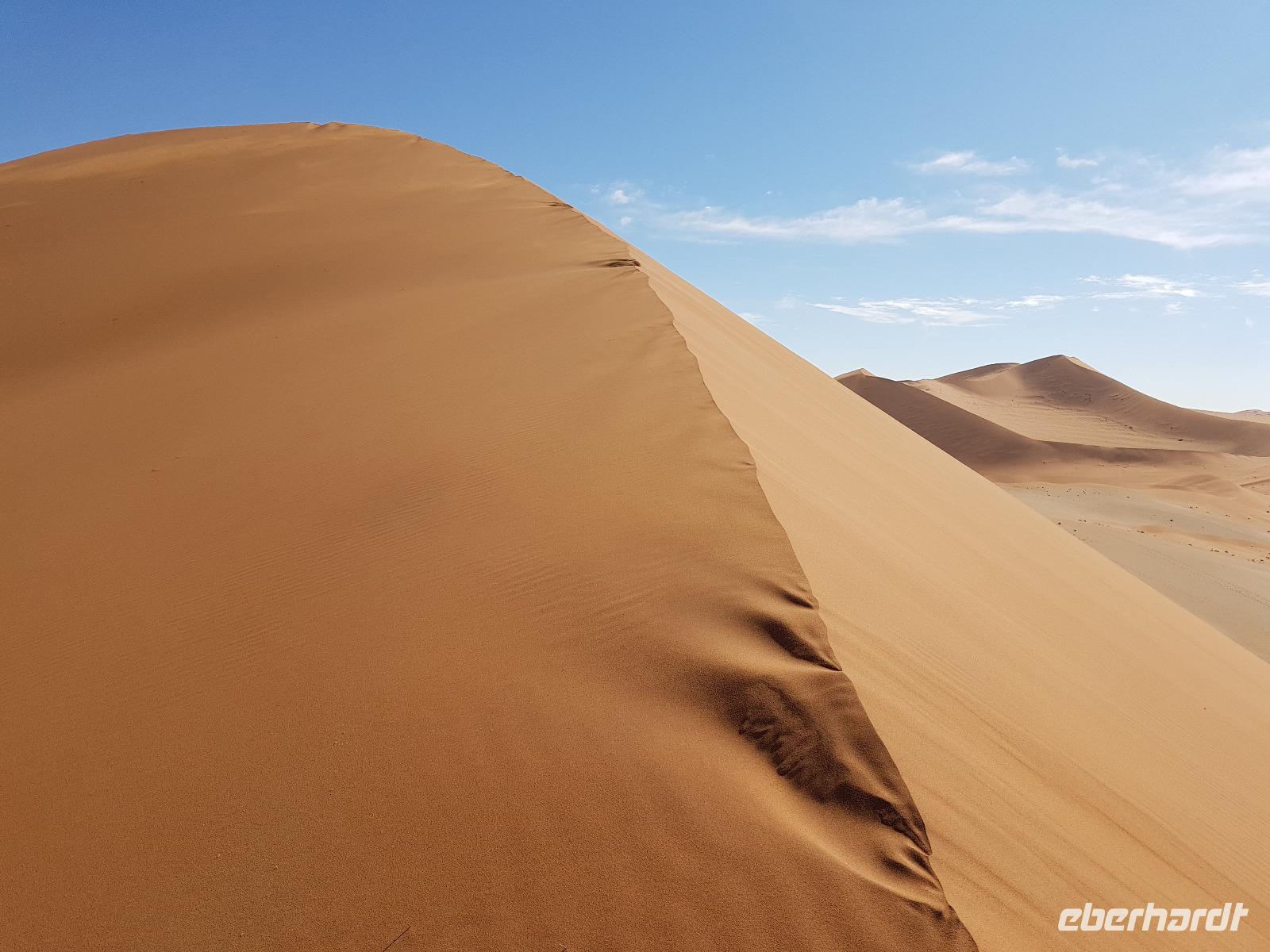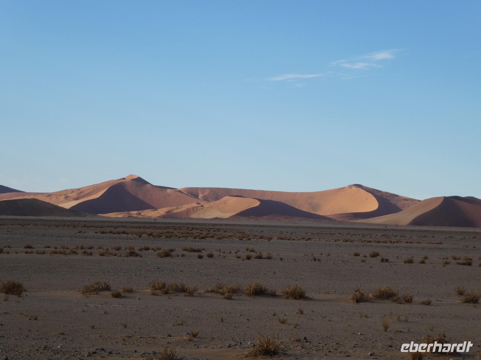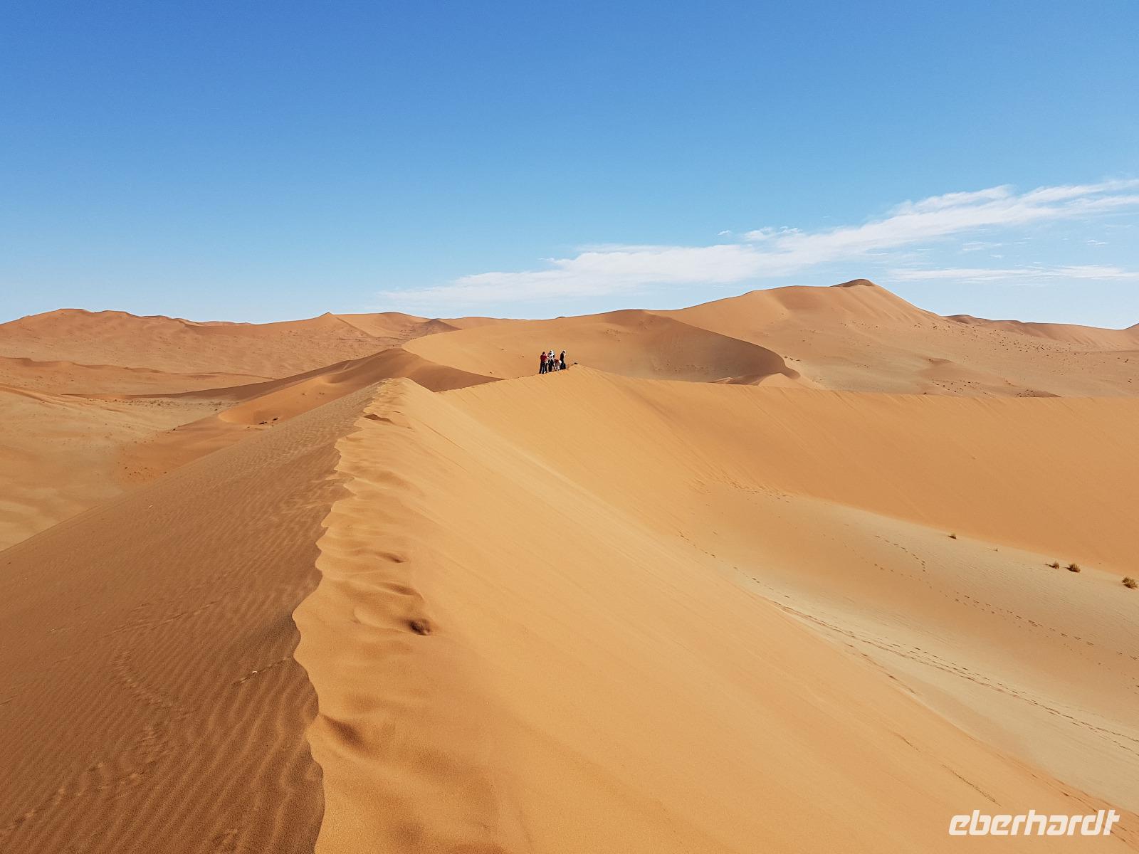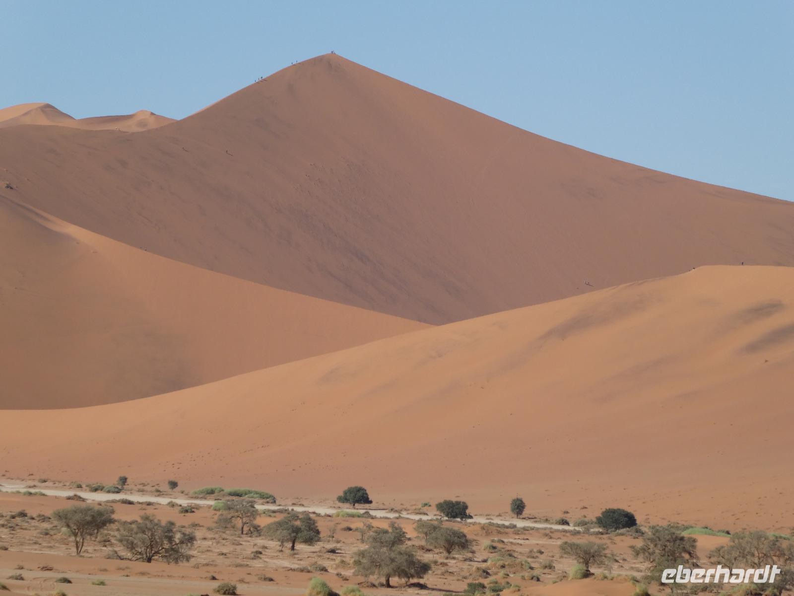 Heute stand ein ganz besonderes Erlebnis auf dem Programm und da mussten wir sehr früh starten. Wir tranken nur einen Kaffee und nahmen unsere Frühstückspakete mit. Noch vor Sonnenaufgang erreichten wir das Tor zum Sossusviel Nationalpark. Eine lange Schlange von Fahrzeugen wartete. Aber das Tor öffnete erst bei Sonnenaufgang. Deshalb machten wir noch eine Pause und Barbara bestellte für den Nachmittag Sandwiches. Wir fuhren hinein und machten viele Fotostopp an den Dünen. Barbara zeigte uns verschiedene Spuren im Sand und berichtete über die Tiere. Noch ein Gruppen Foto im roten Sand und dann hielten wir an der berühmten Düne 45. Wir stiegen ein Stück hinauf und machten wieder viele Fotos. Dann ging's mit unserem Truck zum 4x4 Parkplatz und weiter in offenen Jeeps ins Sossusvlie zur Mamadüne. Wir hatten genügend Zeit, um ganz hinauf zu gehen. Es war schweisstreibend - 2 Schritte vor und einer zurück tief im Sand. Die Mühe hatte sich aber gelohnt und wir hatten traumhafte Ausblicke in alle Richtungen. Wieder unten war die Gruppe vereint und zurück fuhren wir wieder erst mit den Jeeps und weiter mit unserem Truck bis zum Eingang in den Sesriemcanyon. Wir stiegen hinab in den Canyon und liefen unten durch die Felsen - ein unvergessliches Bild. Wieder oben gab es Wein und Datteln, denn heute war unser Bergfest und leider die Hälfte der Reise vorbei. Noch einmal übernachteten wir in der Hammerstein Lodge.