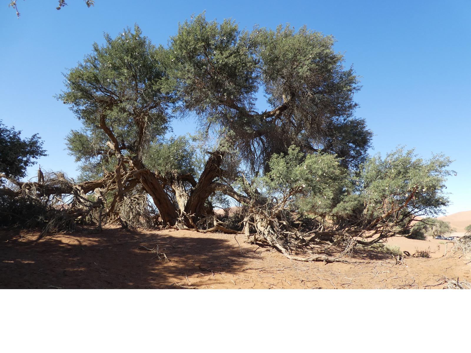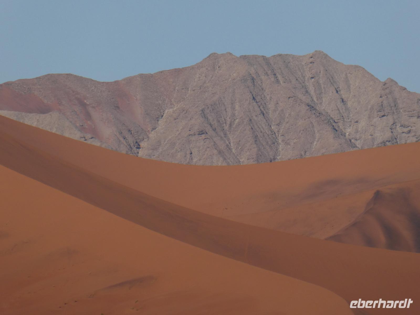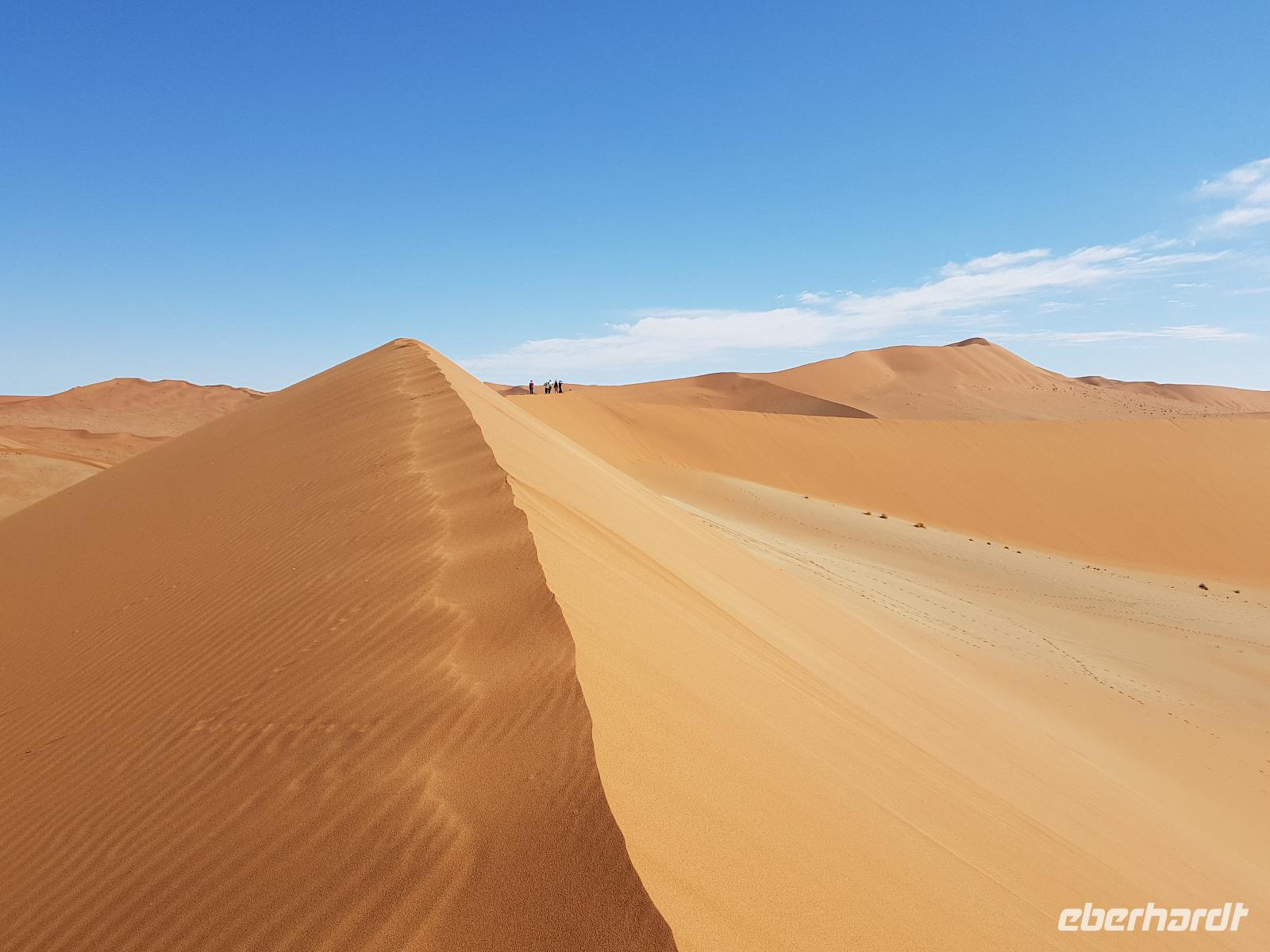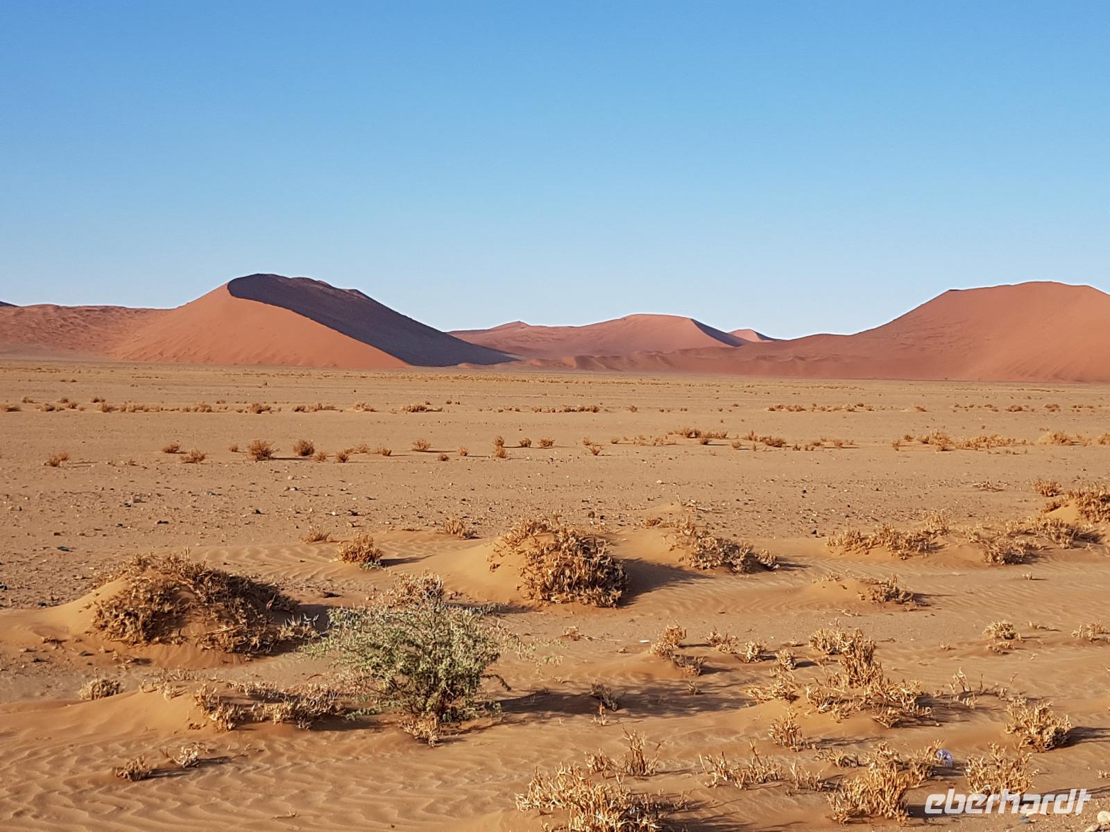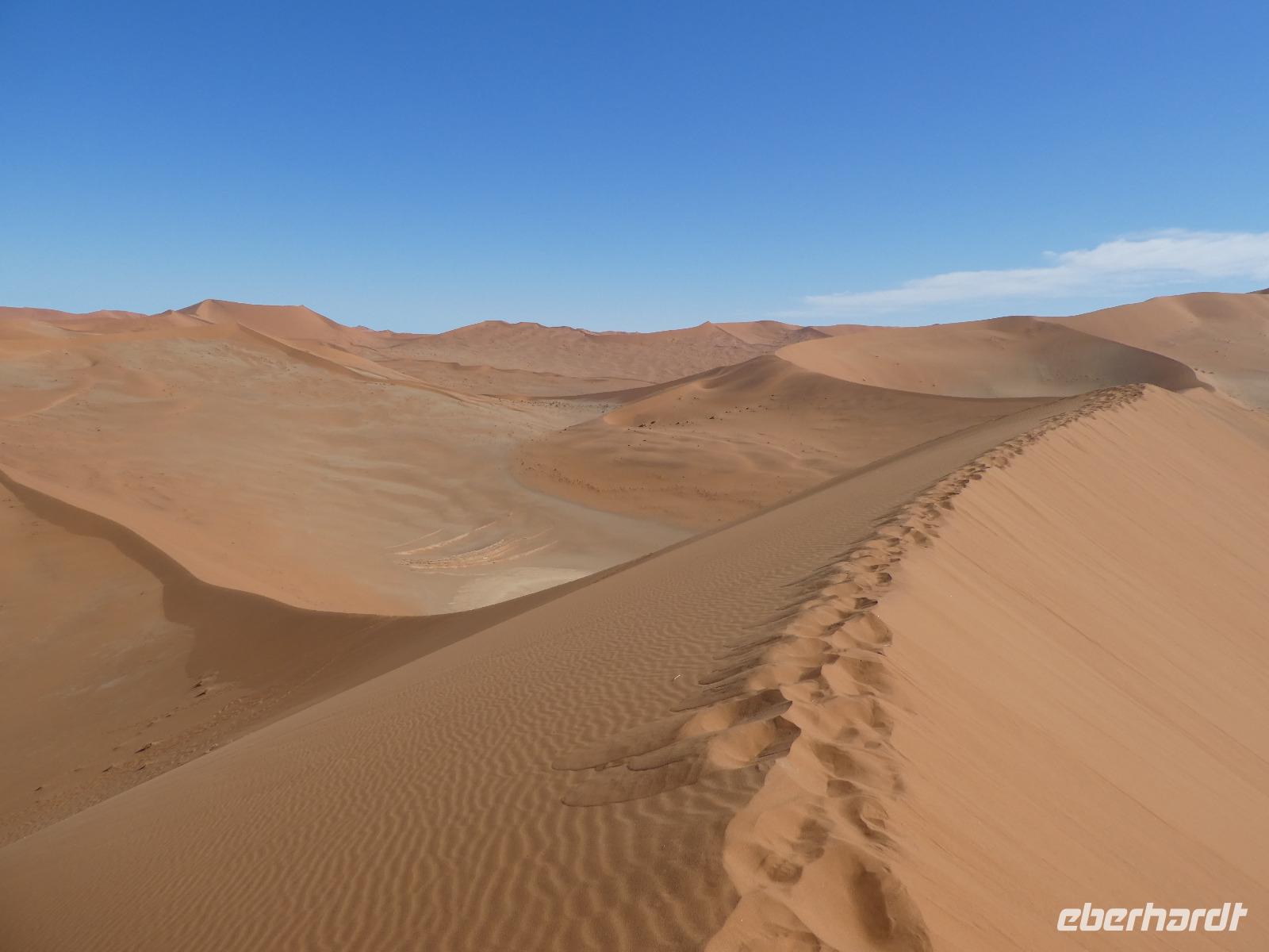 Heute stand ein ganz besonderes Erlebnis auf dem Programm und da mussten wir sehr früh starten. Wir tranken nur einen Kaffee und nahmen unsere Frühstückspakete mit. Noch vor Sonnenaufgang erreichten wir das Tor zum Sossusviel Nationalpark. Eine lange Schlange von Fahrzeugen wartete. Aber das Tor öffnete erst bei Sonnenaufgang. Deshalb machten wir noch eine Pause und Barbara bestellte für den Nachmittag Sandwiches. Wir fuhren hinein und machten viele Fotostopp an den Dünen. Barbara zeigte uns verschiedene Spuren im Sand und berichtete über die Tiere. Noch ein Gruppen Foto im roten Sand und dann hielten wir an der berühmten Düne 45. Wir stiegen ein Stück hinauf und machten wieder viele Fotos. Dann ging's mit unserem Truck zum 4x4 Parkplatz und weiter in offenen Jeeps ins Sossusvlie zur Mamadüne. Wir hatten genügend Zeit, um ganz hinauf zu gehen. Es war schweisstreibend - 2 Schritte vor und einer zurück tief im Sand. Die Mühe hatte sich aber gelohnt und wir hatten traumhafte Ausblicke in alle Richtungen. Wieder unten war die Gruppe vereint und zurück fuhren wir wieder erst mit den Jeeps und weiter mit unserem Truck bis zum Eingang in den Sesriemcanyon. Wir stiegen hinab in den Canyon und liefen unten durch die Felsen - ein unvergessliches Bild. Wieder oben gab es Wein und Datteln, denn heute war unser Bergfest und leider die Hälfte der Reise vorbei. Noch einmal übernachteten wir in der Hammerstein Lodge.
