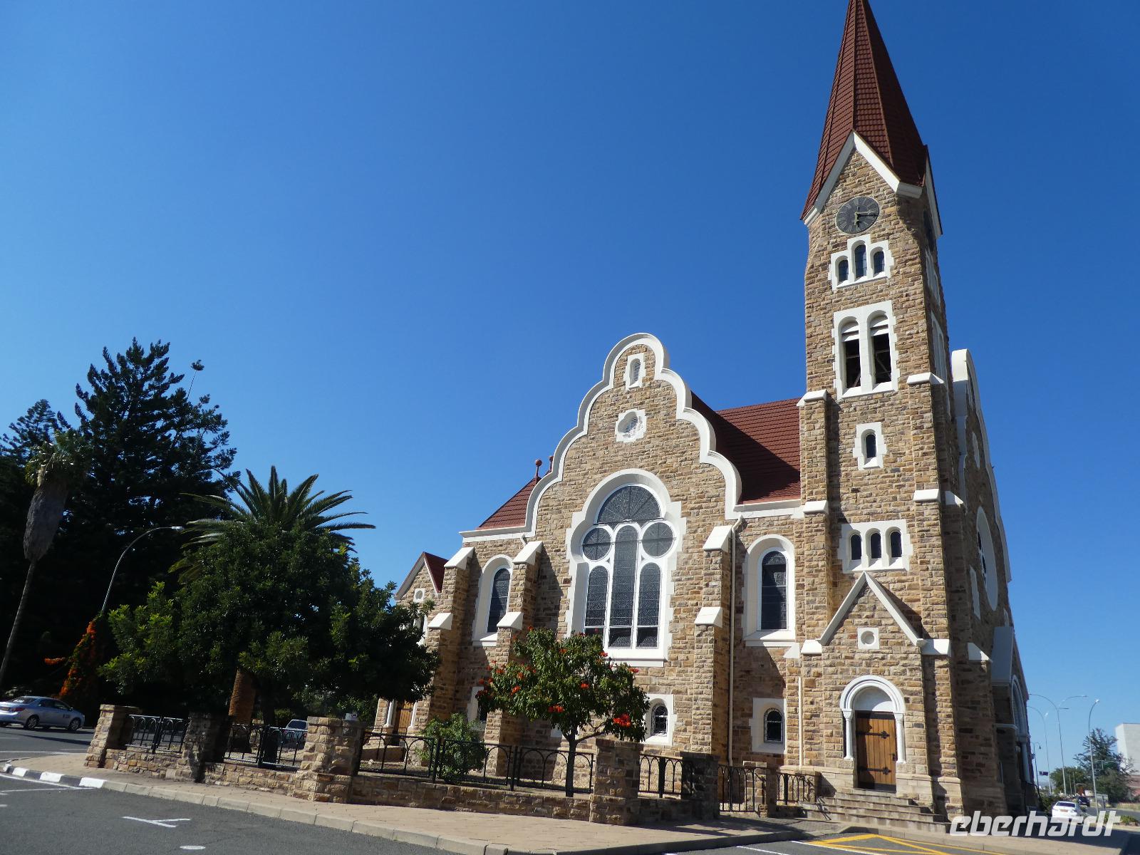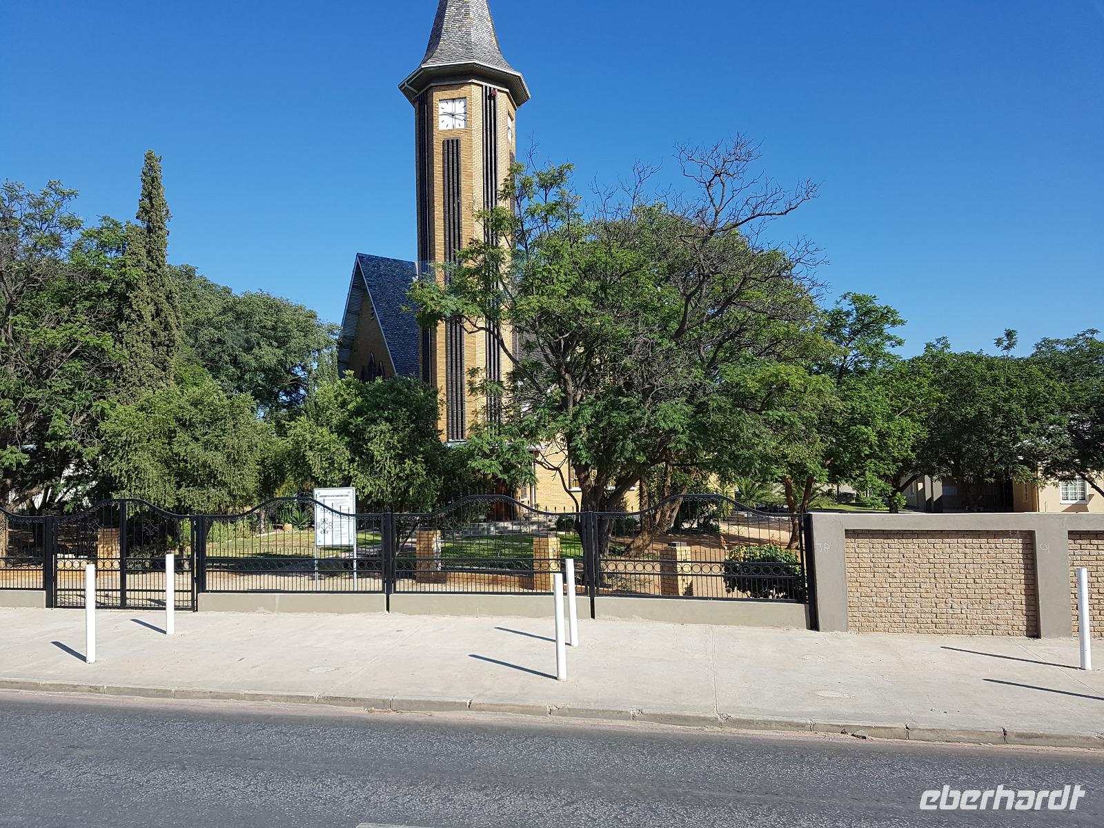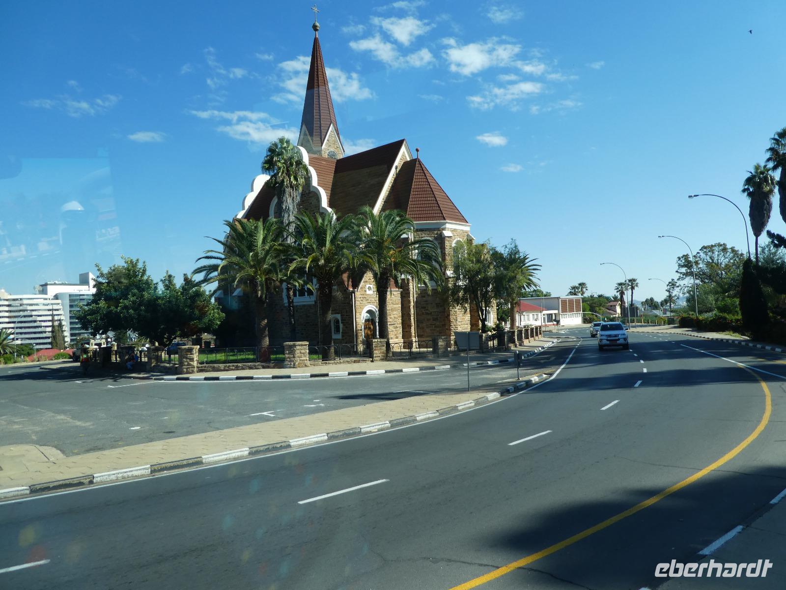 Das späte Frühstück im Hotel Thule genossen wir noch einmal und füllten danach in aller Ruhe unsere Ausreisekarten aus. Die Koffer wurden abgeholt und 10 Uhr begann dann unsere Stadtrundfahrt mit Barbara und Vivien. Es war Feiertag und die Strassen leer, so konnten wir problemlos anhalten und parken. Die Hauptstadt Windhoek hat geschätzte 240 Tausend Einwohner, denn ein Meldeamt gibt es nicht. Wir fuhren durch das Regierungsviertel und hielten beim "Tintenpalast" mit schönem Blick über den Park hin zur Kirche.