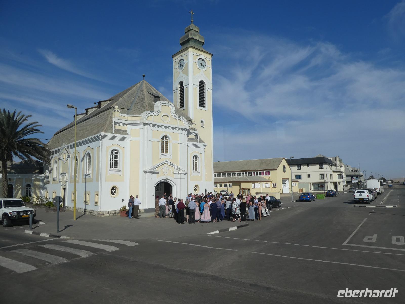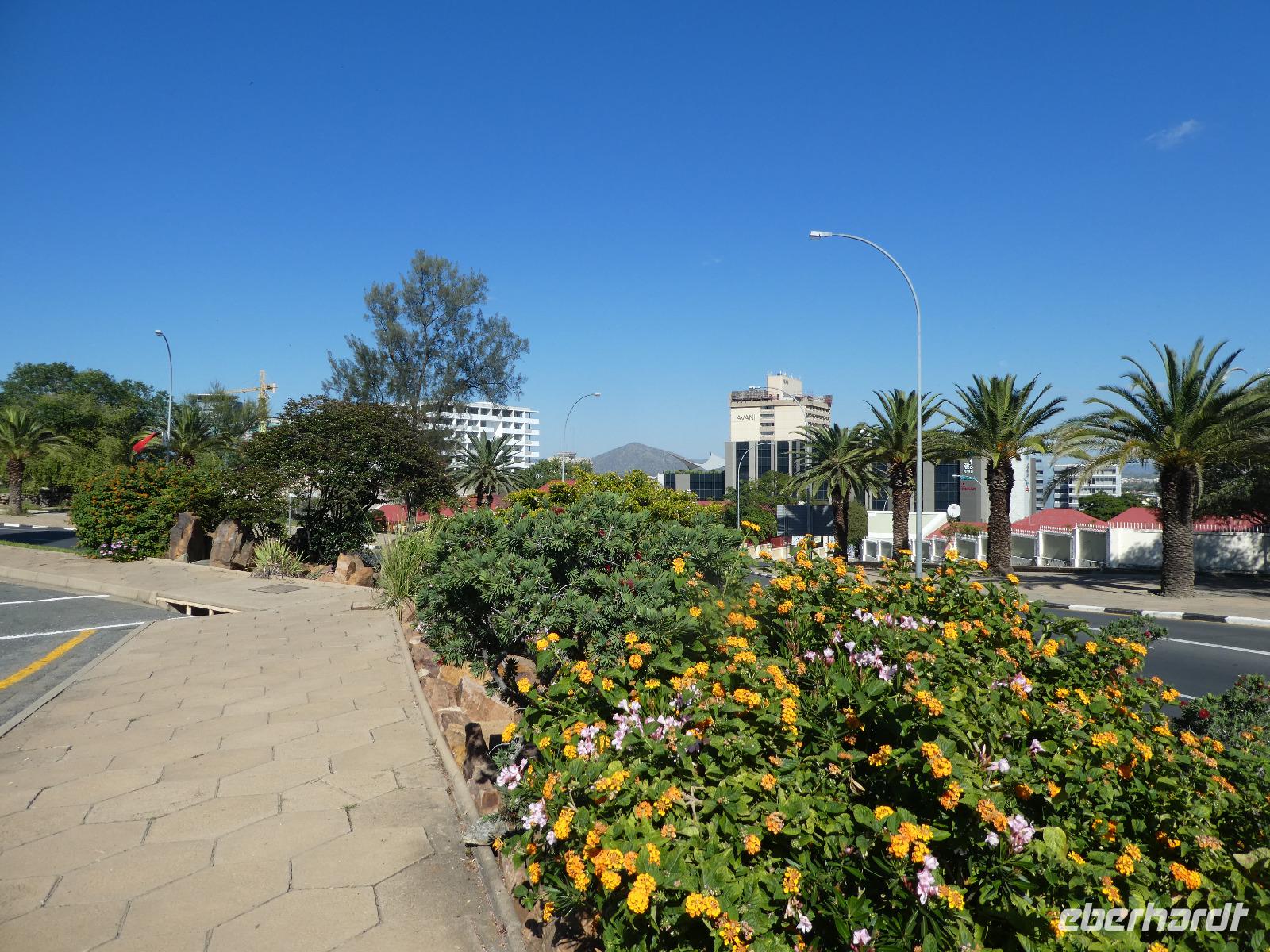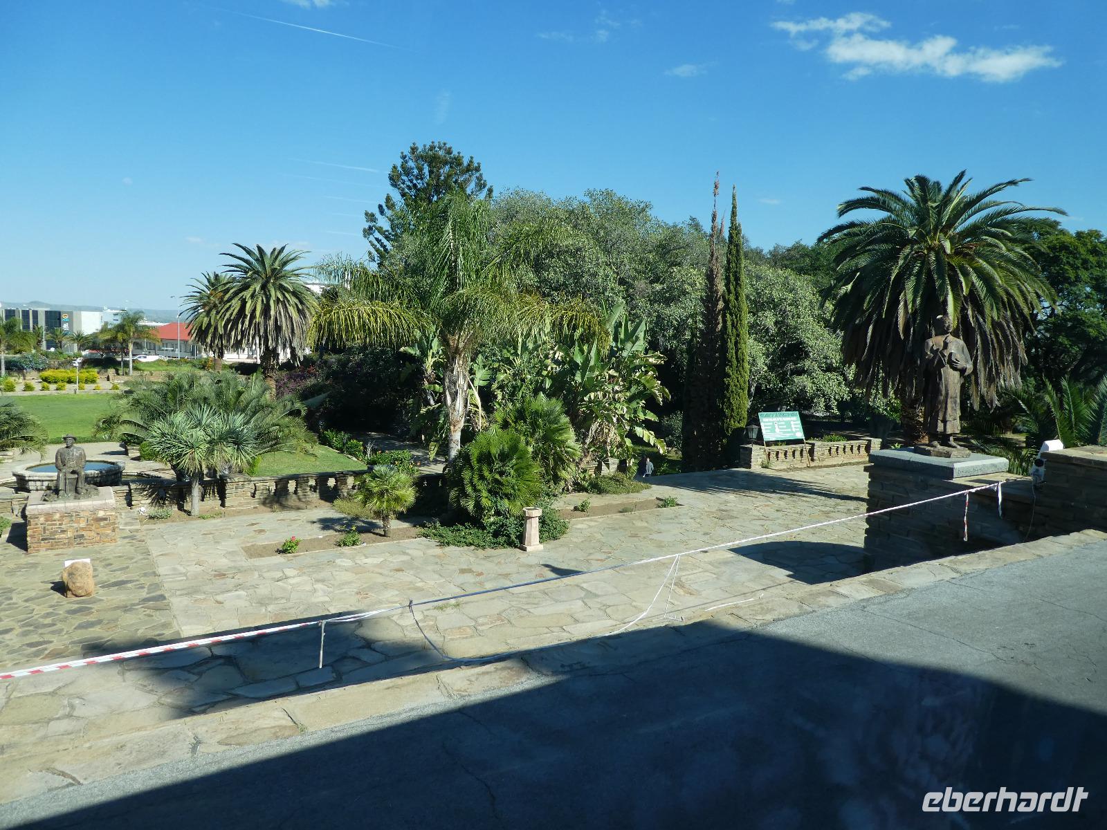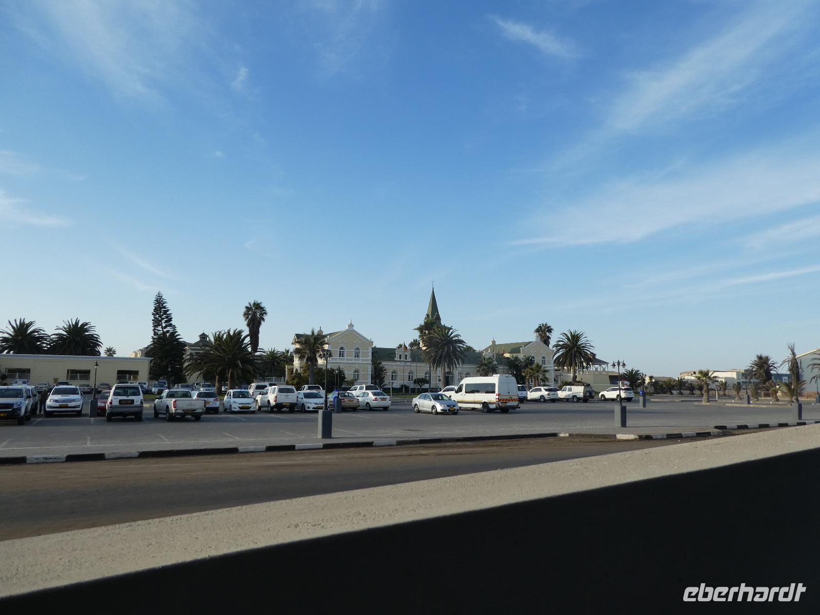 Das späte Frühstück im Hotel Thule genossen wir noch einmal und füllten danach in aller Ruhe unsere Ausreisekarten aus. Die Koffer wurden abgeholt und 10 Uhr begann dann unsere Stadtrundfahrt mit Barbara und Vivien. Es war Feiertag und die Strassen leer, so konnten wir problemlos anhalten und parken. Die Hauptstadt Windhoek hat geschätzte 240 Tausend Einwohner, denn ein Meldeamt gibt es nicht. Wir fuhren durch das Regierungsviertel und hielten beim "Tintenpalast" mit schönem Blick über den Park hin zur Kirche.