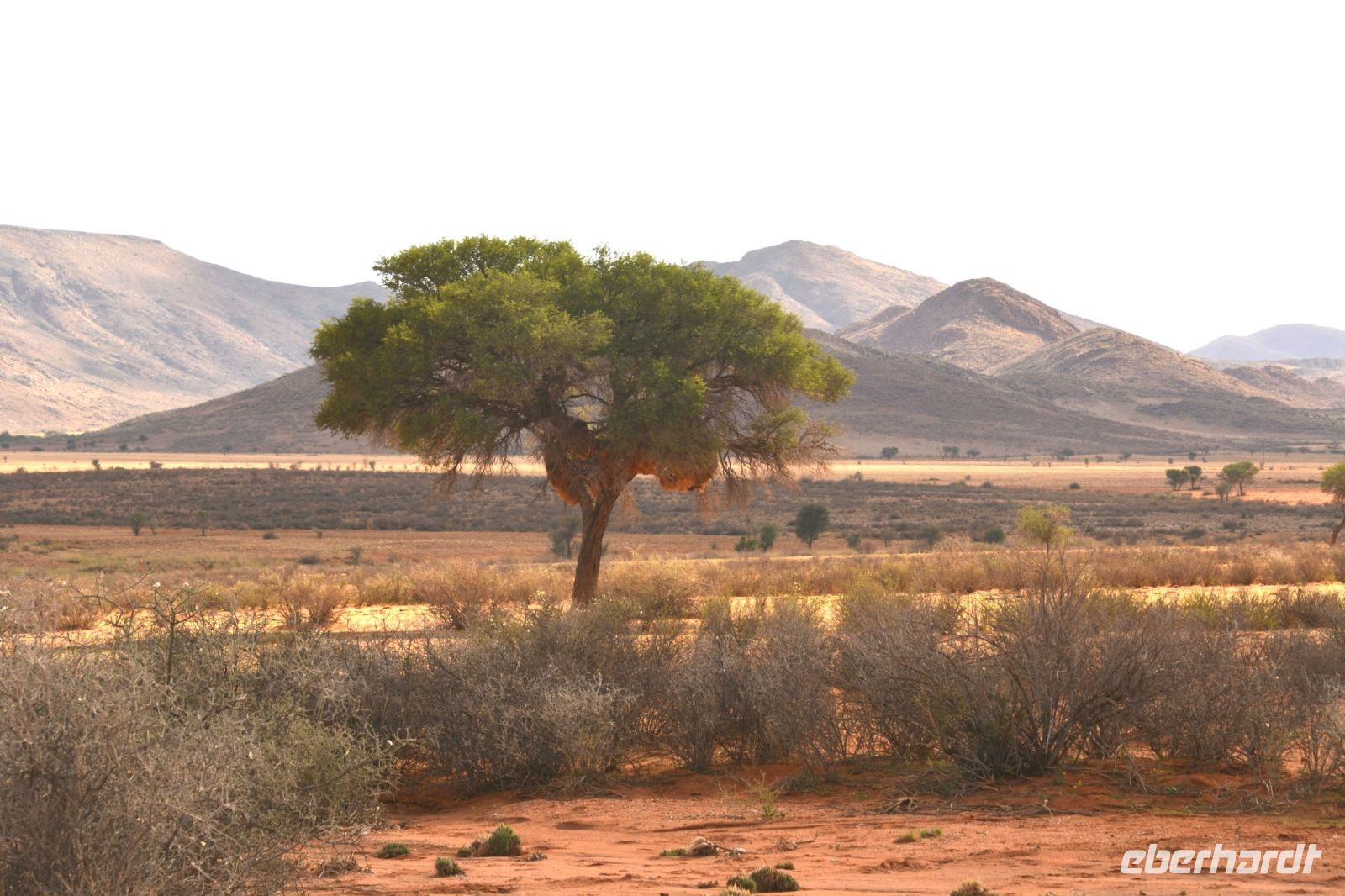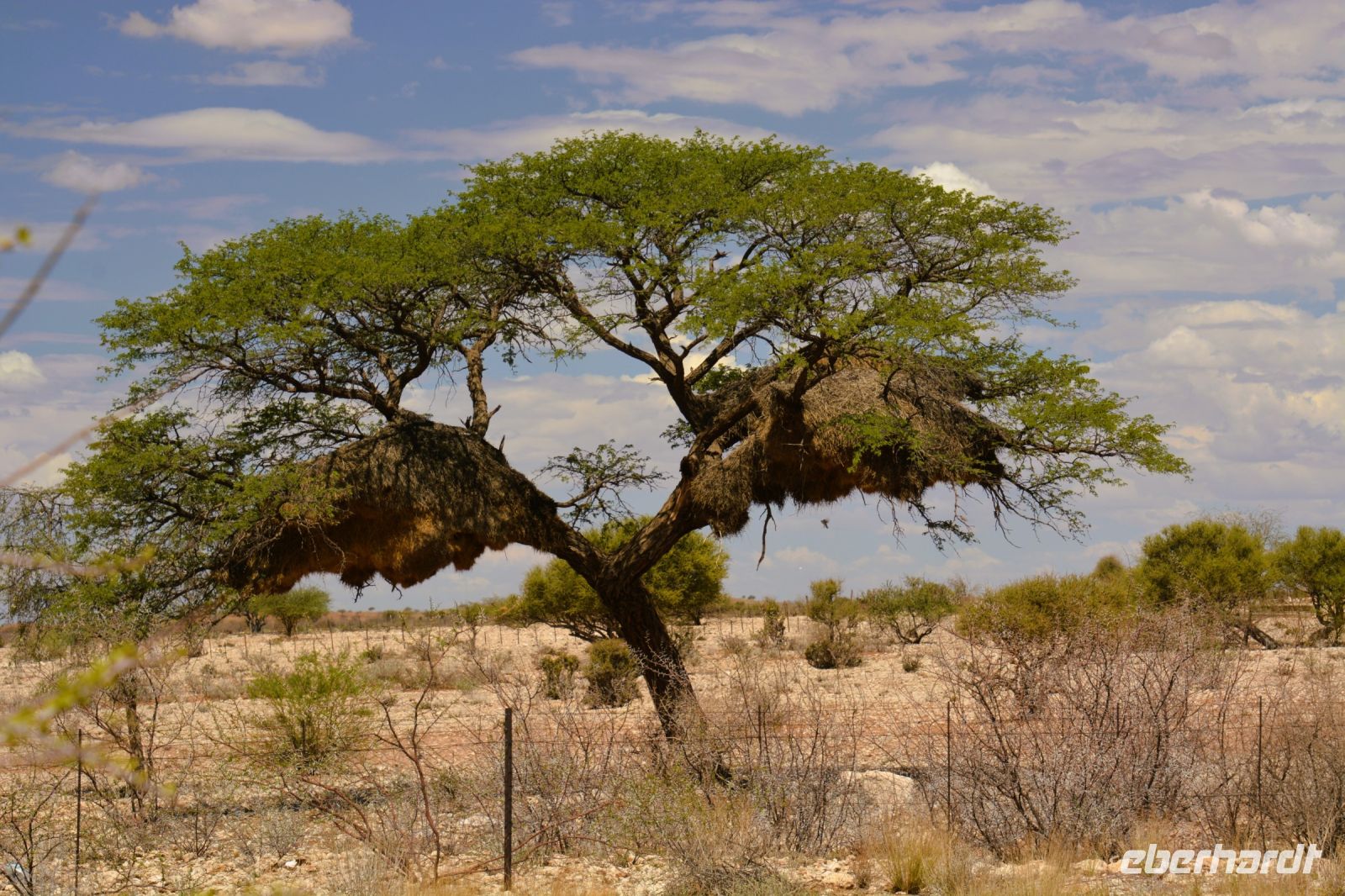 Wir haben noch eine gute Wegstrecke vor und. An einem Baum mit riesigen Webervogelnestern machen wir einen Fotostopp. Im Hintergrund der Farm steht eine der typischen Wasserpumpen. Genauso haben wir uns die Kalahari vorgestellt.