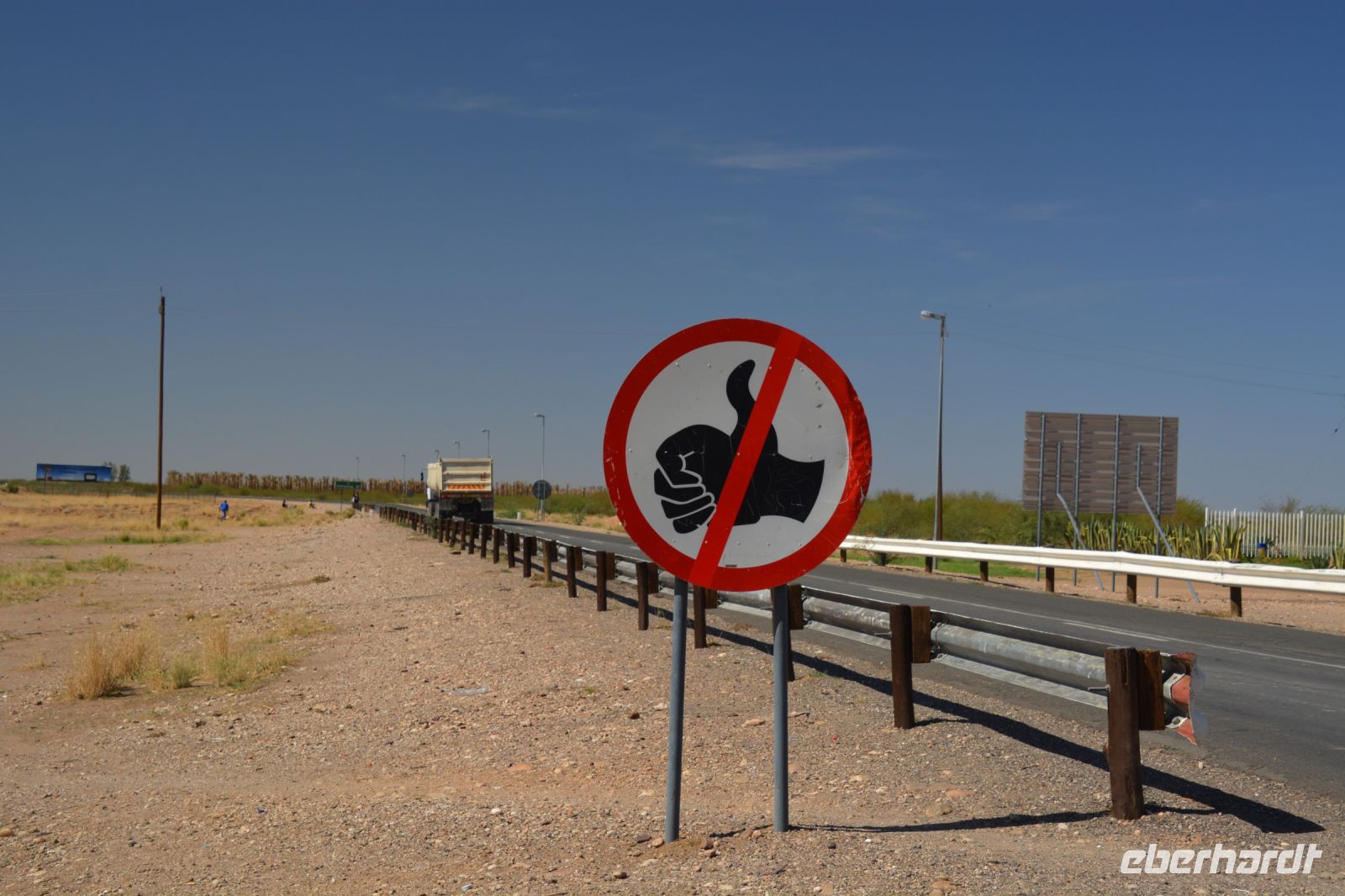 Sehr plakativ steht am Straßenrand ein mit Anhalter fahren verboten Schild.