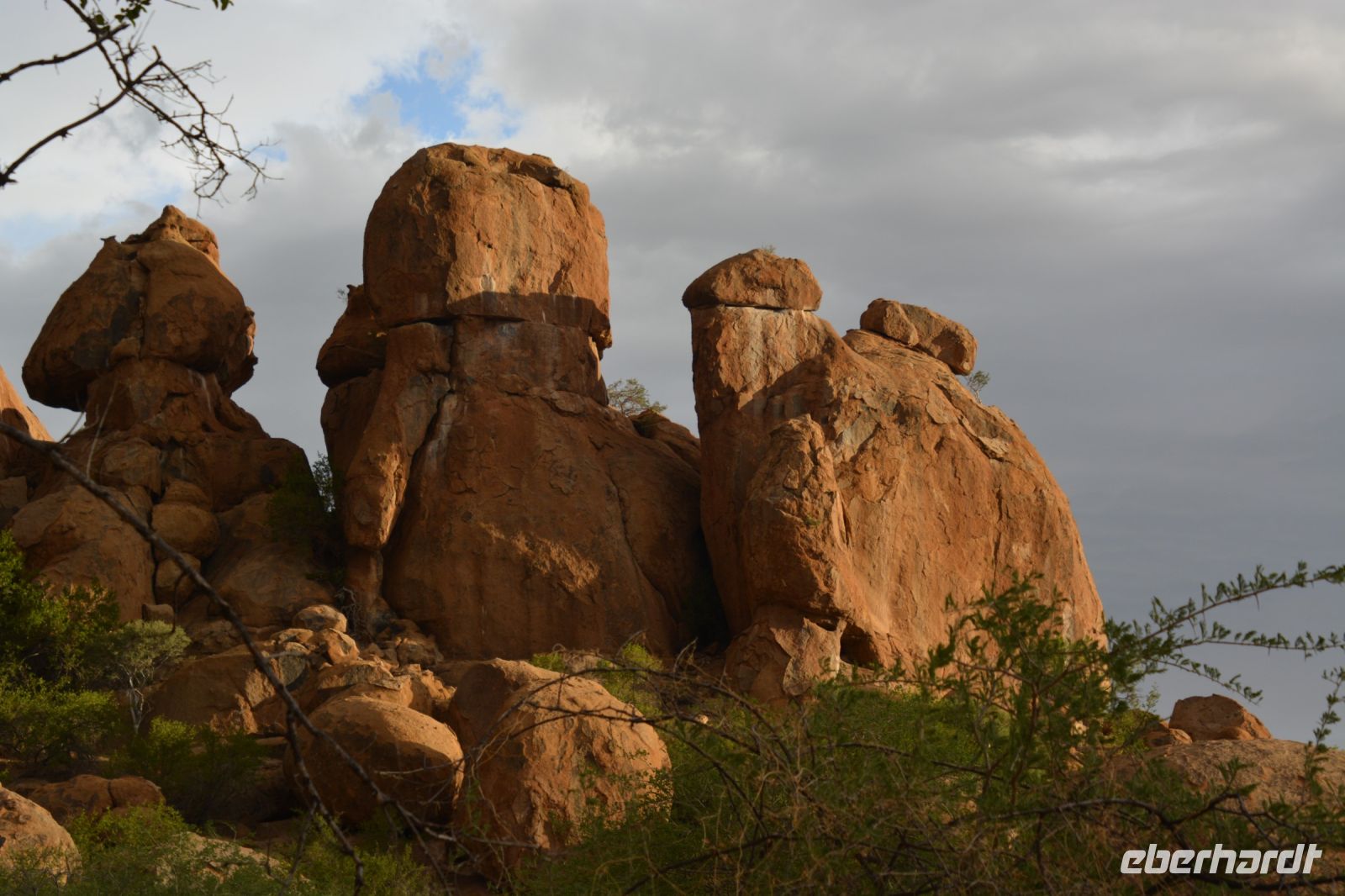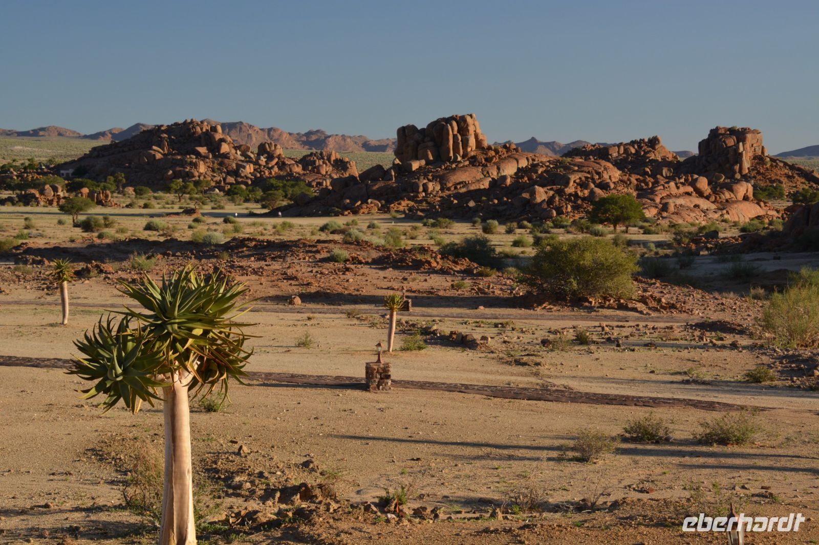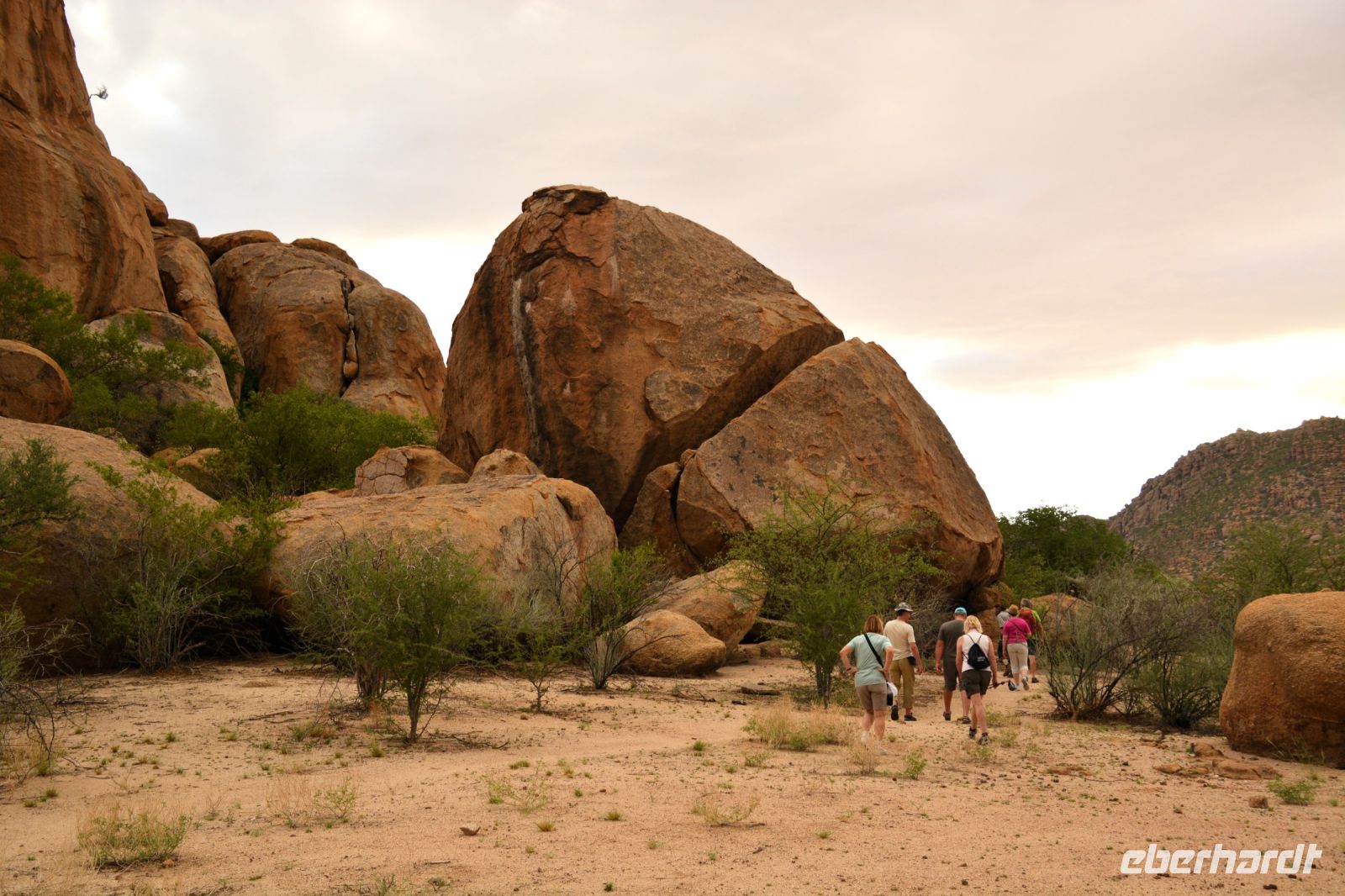 Wir kommen durch die kleine Siedlung Tubosis in der es eine Grundschule gibt. Es ist der nächstgelegene Ort unserer Lodge. Interessante Felsen aus Granitgestein türmen sich vor uns inmitten der Halbwüstenlandschaft auf.