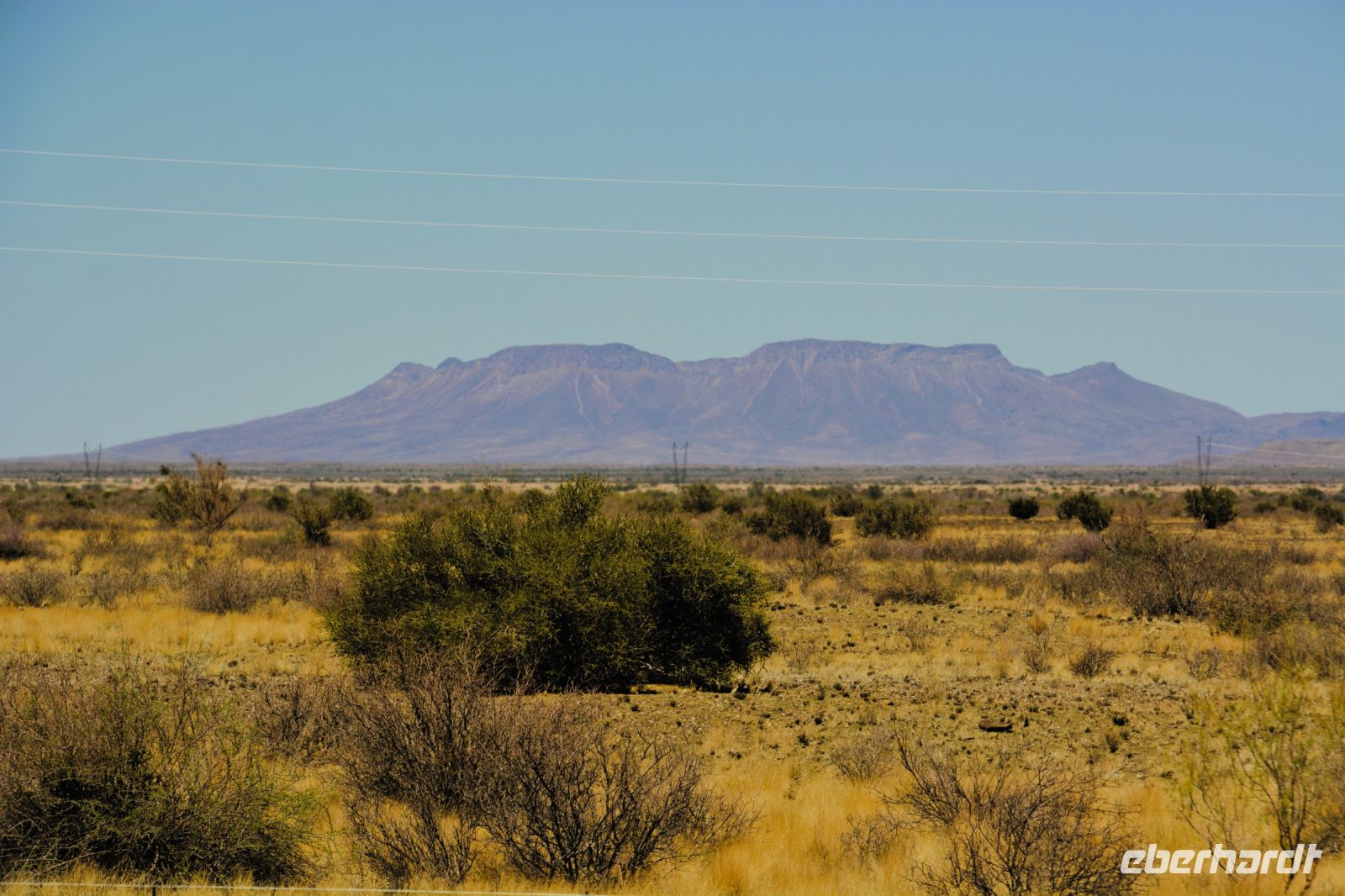 Links vor uns taucht in der Weite der geologisch interessante Waterberg auf, der wohl seinem Namen alle Ehre macht. Es ist da Stammesgebiet der Herero.