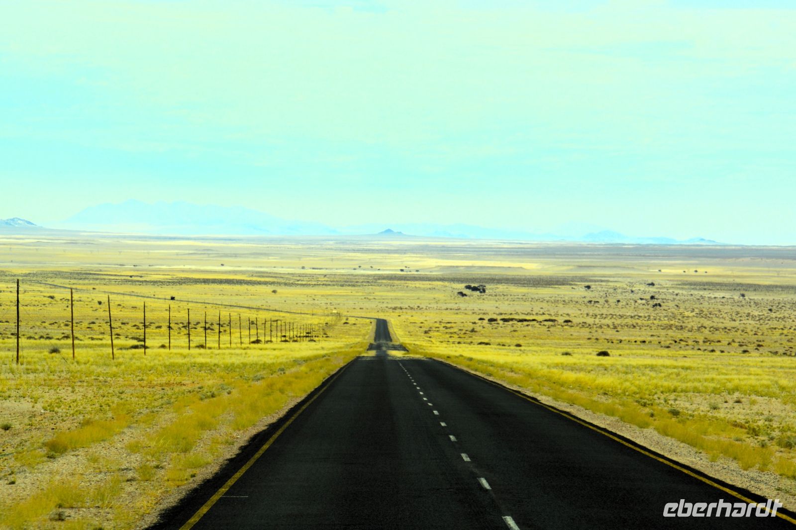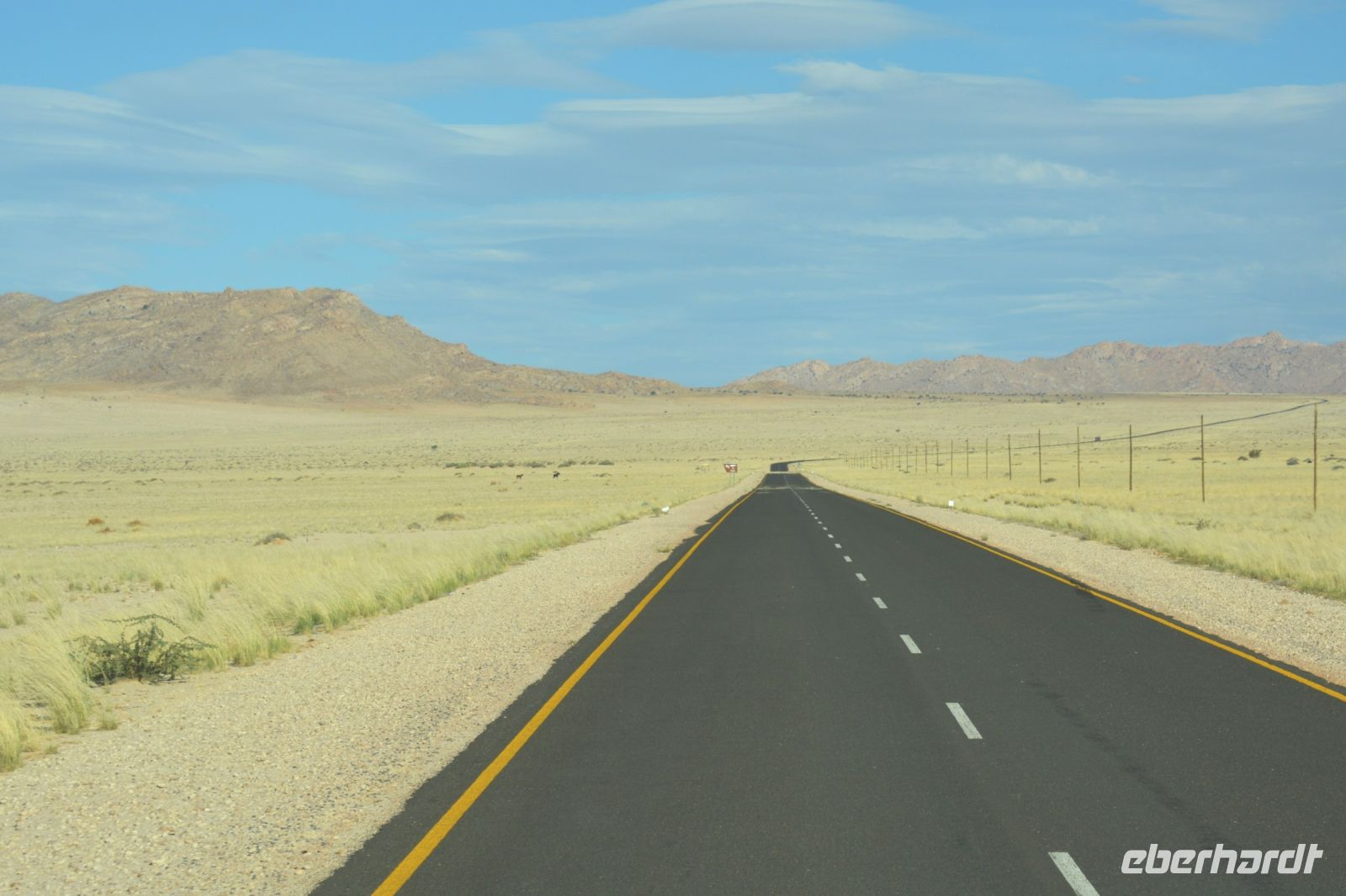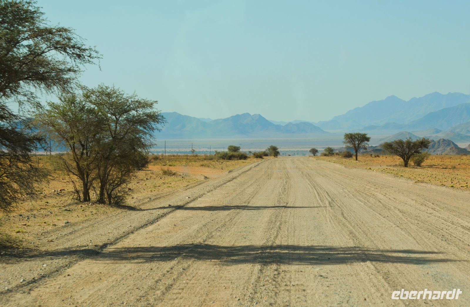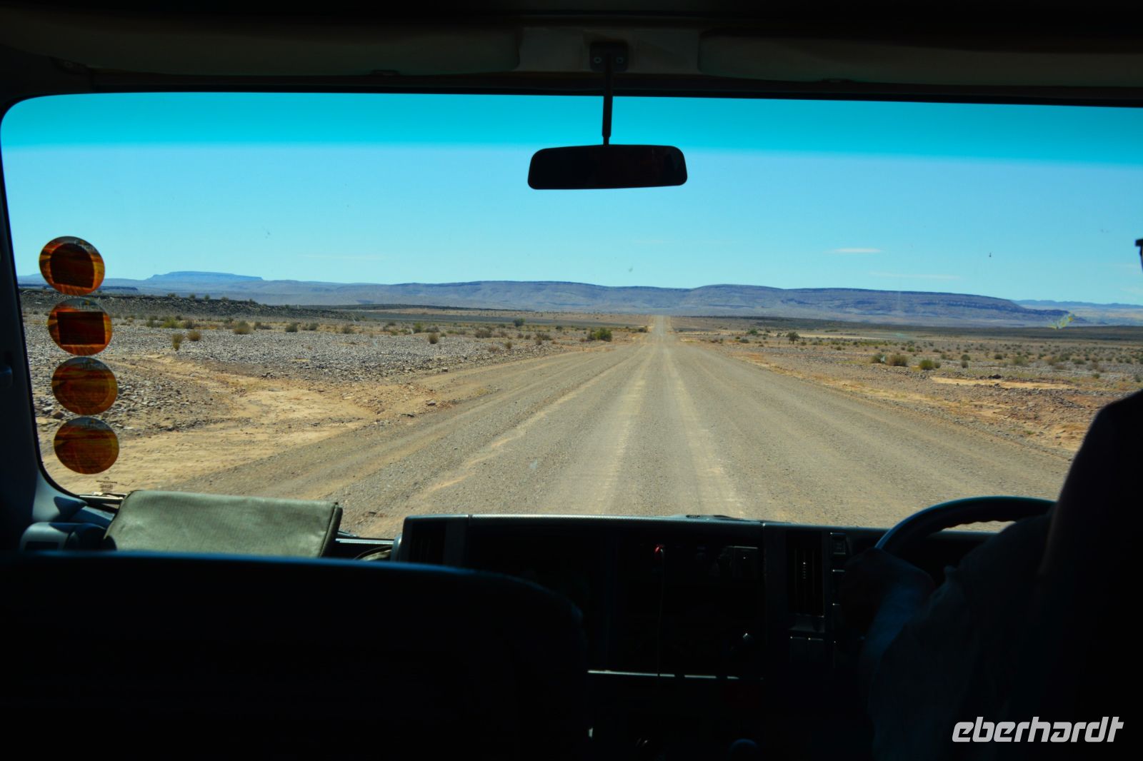 Schnurgerade verläuft die Straße durch eine Geröllwüste auf beiden Seiten. Es gibt die Trockenvegetation und ab und zu eine Akazie.