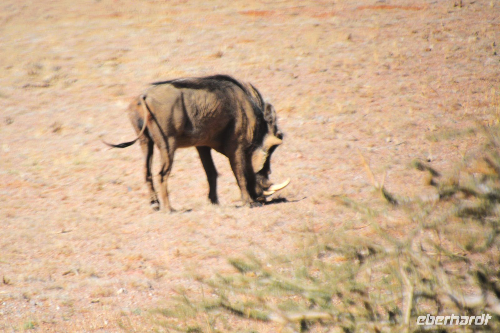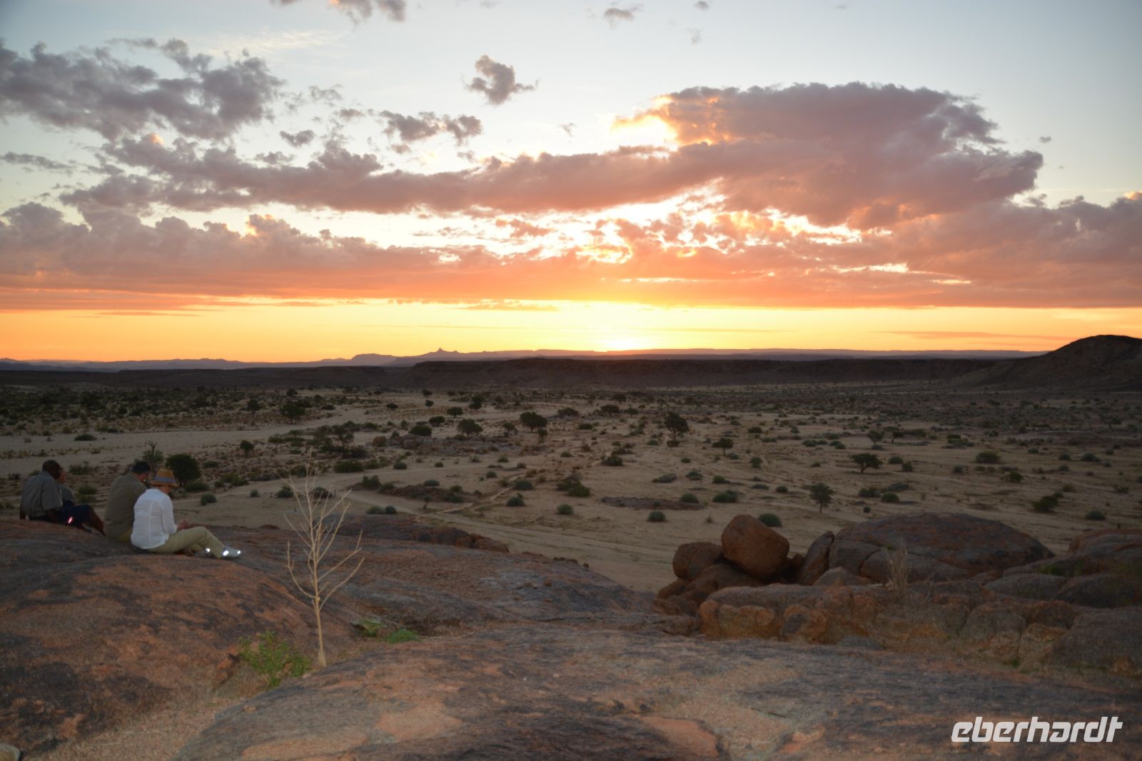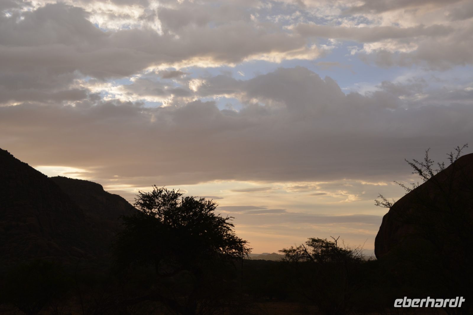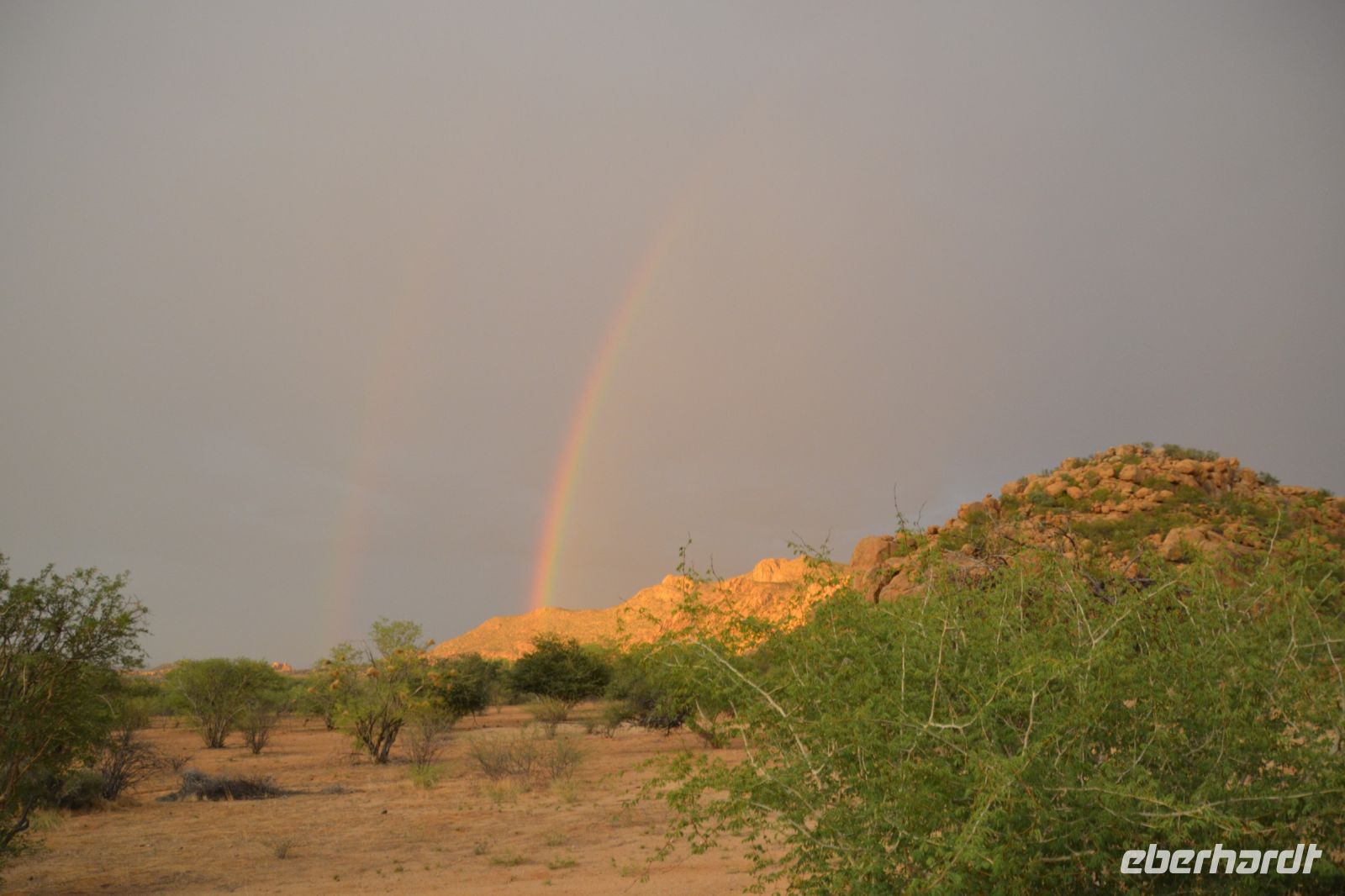 Menschen und Tiere atmen auf. Hier hat Regen noch eine andere Bedeutung als in unseren Breiten. Auf der heutigen Weiterfahrt sehen wir einen Schabrackenschakal der durch das Gelände streift. Der Himmel ist heute bewölkt und vor uns breitet sich wieder die Wüstenlandschaft aus.