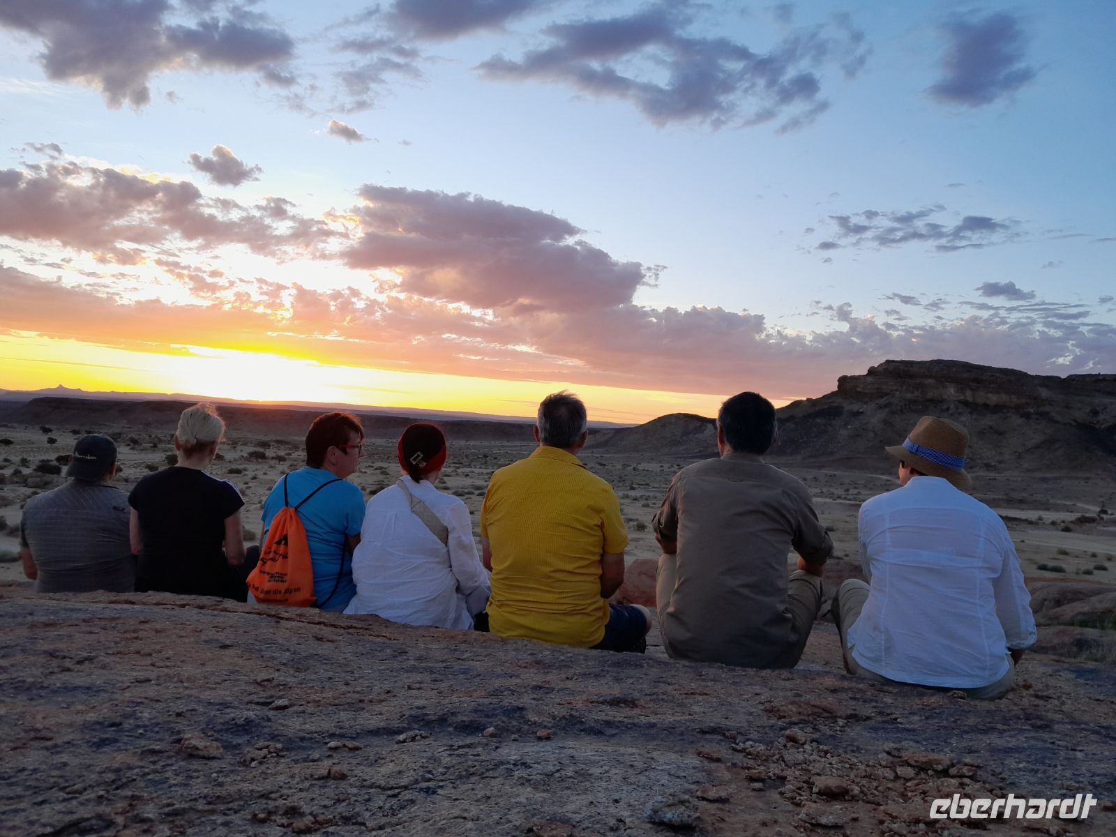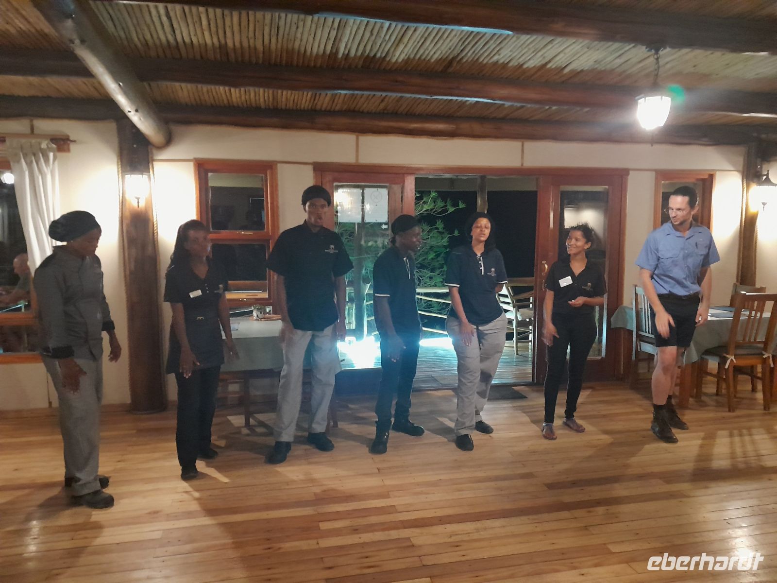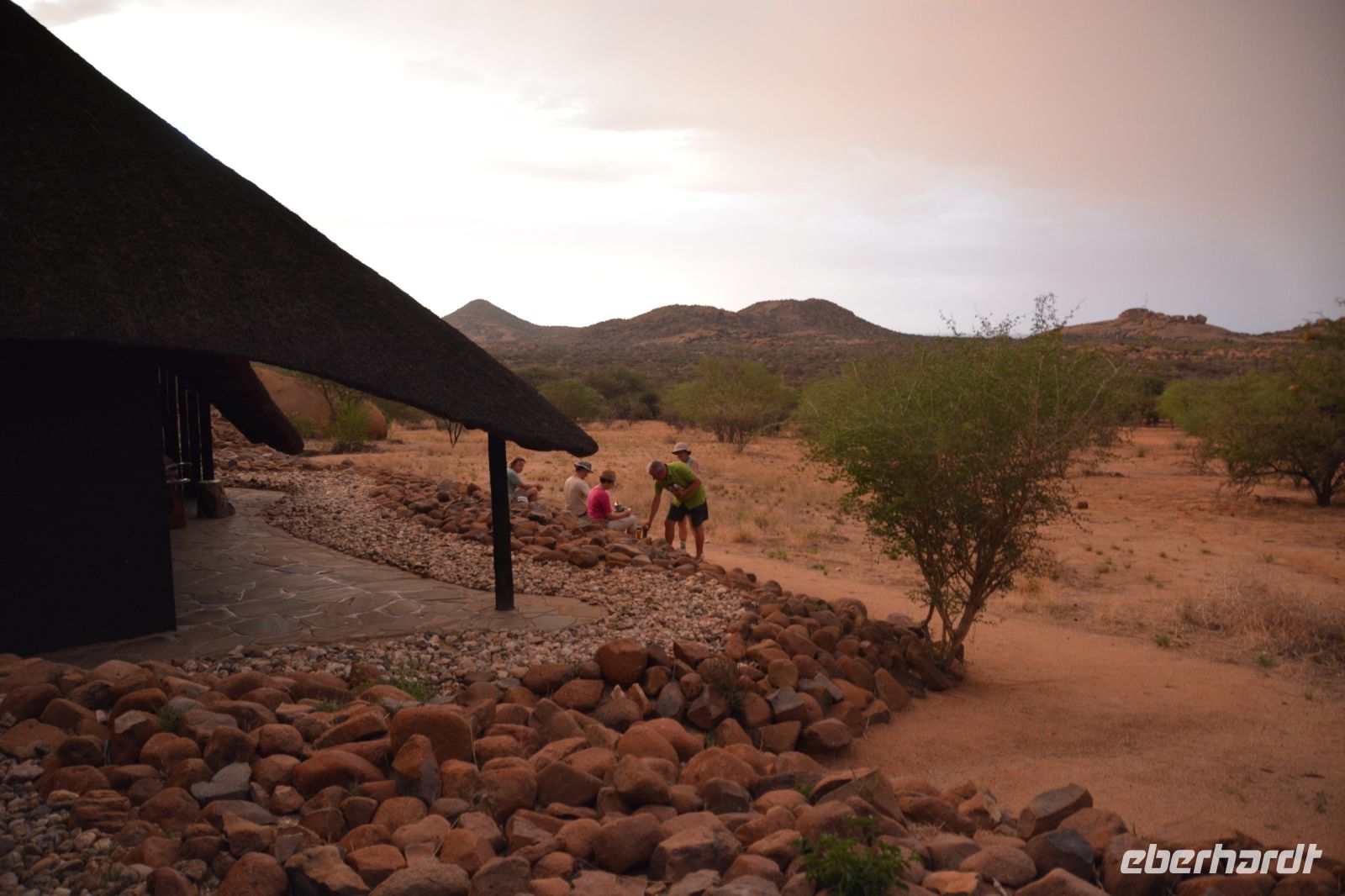 Judith die aus der Caprivi-Region im Norden des Landes stammt und zum Arbeiten hier ist, mixt unseren Gin Tonic mit Eis. Es geht uns gut und wir erleben ein prächtiges Sonnenuntergangsspektakel. Anschließend kehren wir auch vom Gin Tonic und den Bieren beschwingt in die Lodge zum Abendessen zurück.