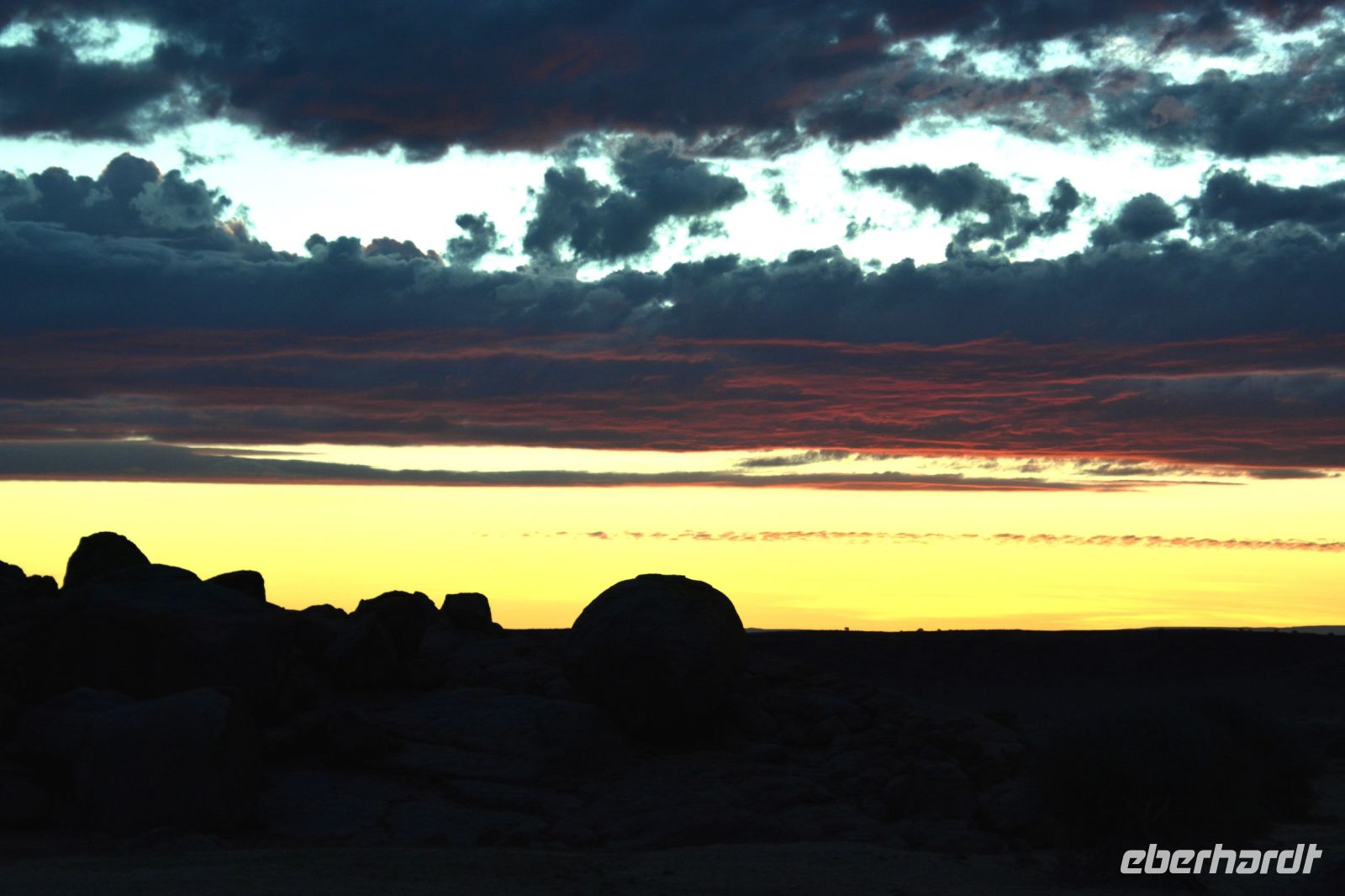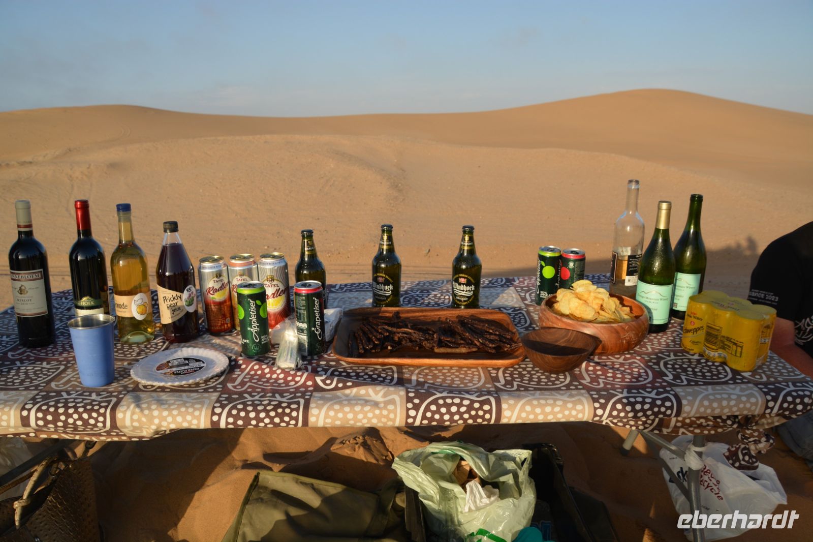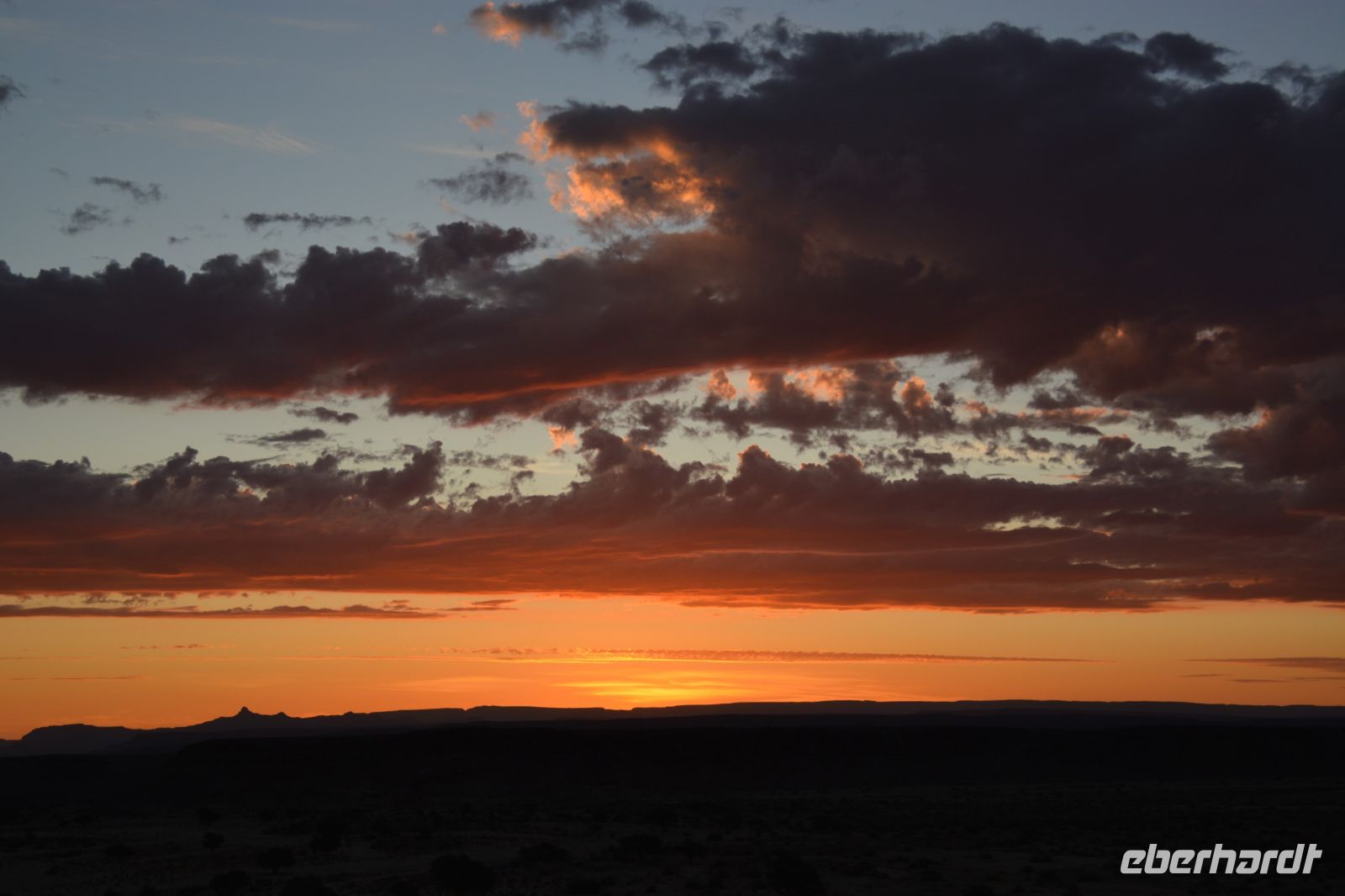 Judith die aus der Caprivi-Region im Norden des Landes stammt und zum Arbeiten hier ist, mixt unseren Gin Tonic mit Eis. Es geht uns gut und wir erleben ein prächtiges Sonnenuntergangsspektakel. Anschließend kehren wir auch vom Gin Tonic und den Bieren beschwingt in die Lodge zum Abendessen zurück.