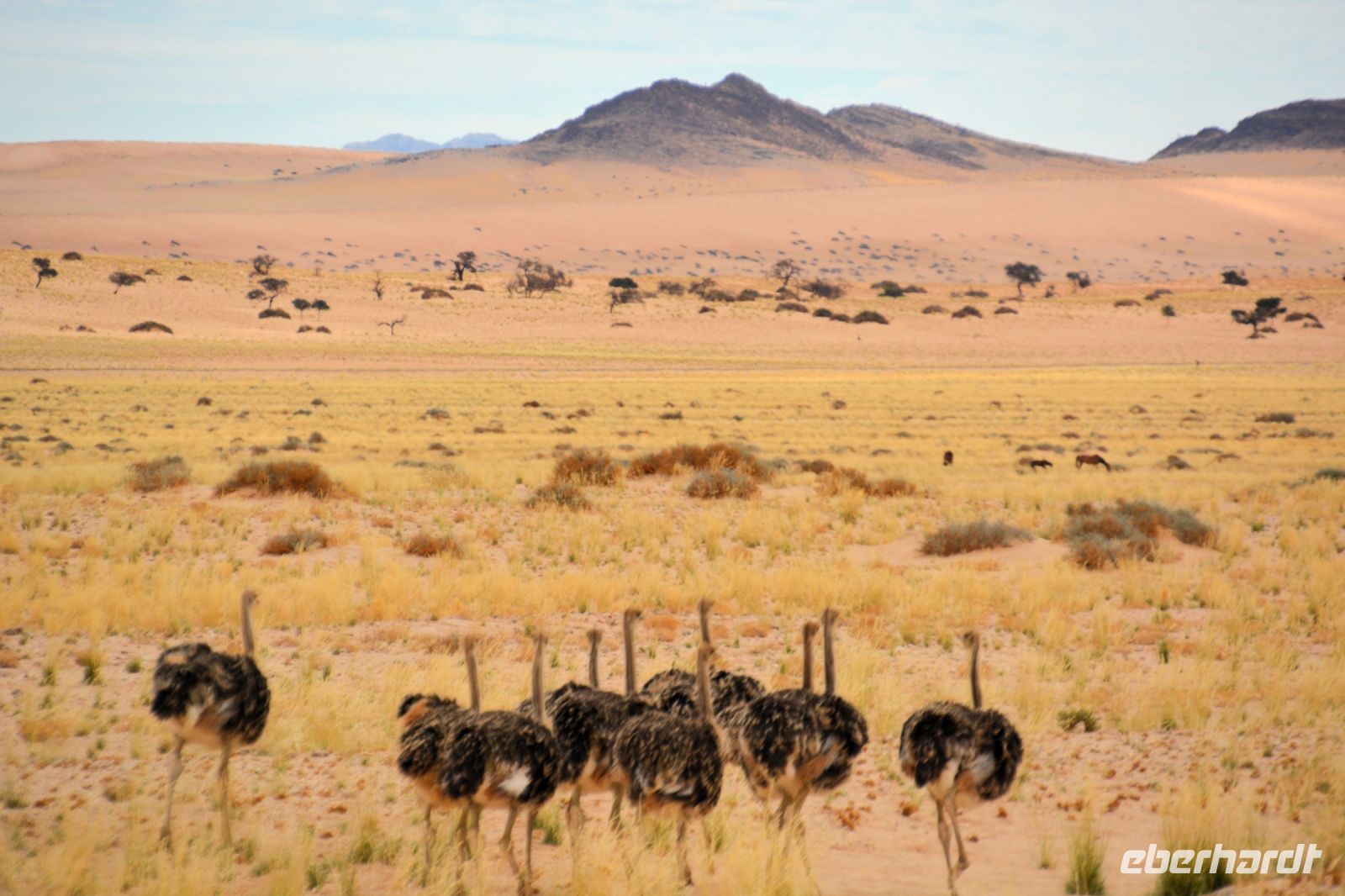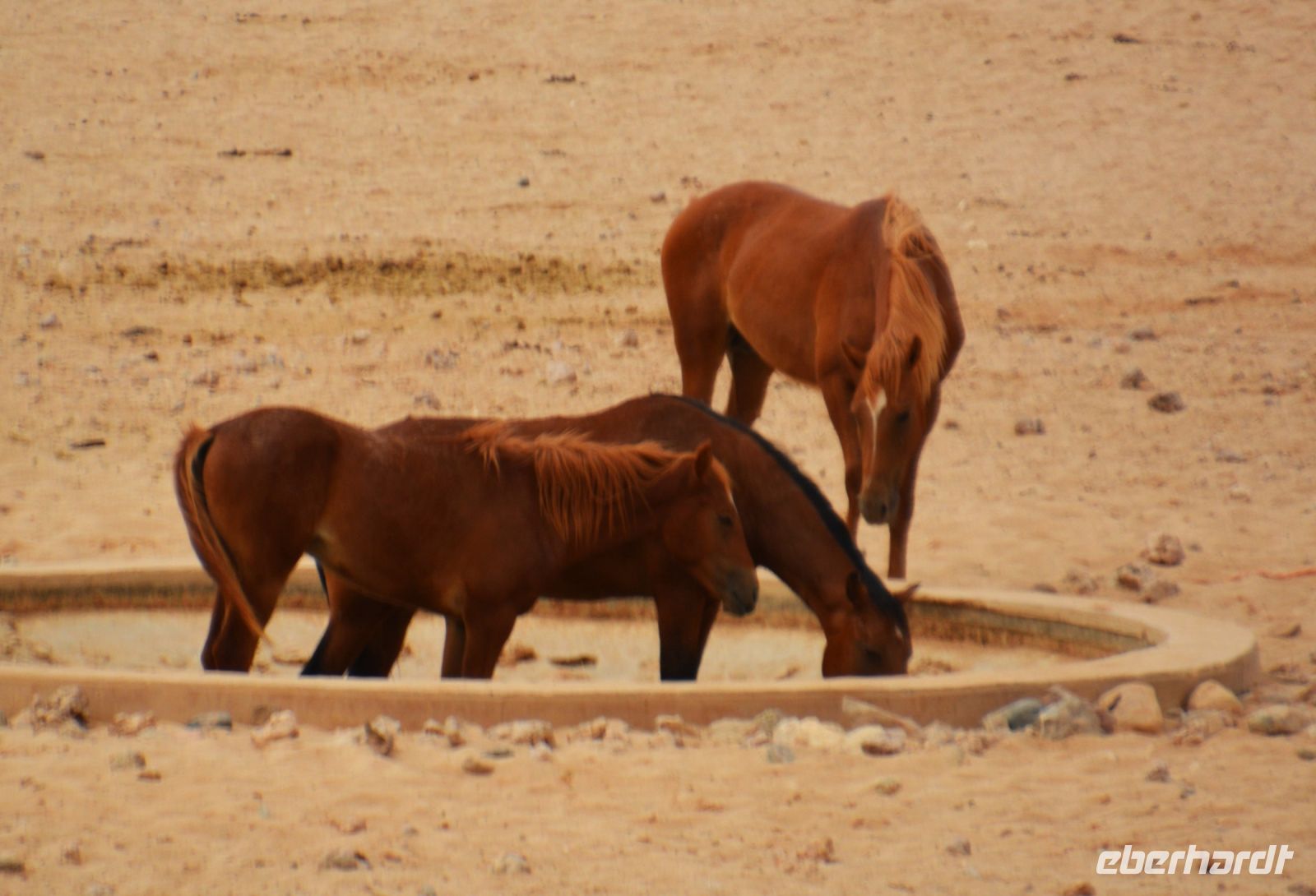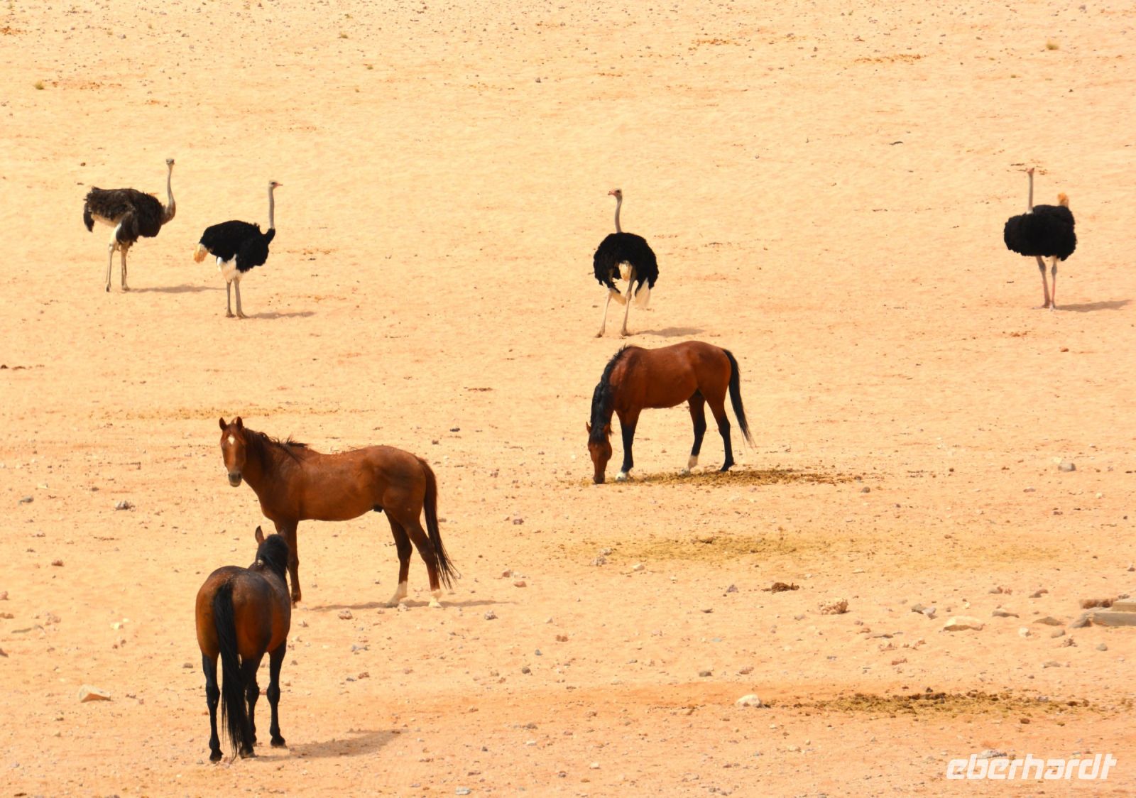 Gesättigt geht es weiter in Richtung Aus. Endlos erstreckt sich die Halbwüste. Dann tauchen im Hintergrund höhere Berge auf. Davor erstreckt sich Grassteppe: rote Erde die von einem Hauch Grün überzogen ist. Wir fahren an der Straße Richtung Helmeringhausen vorbei. Diese Straße werden wir übermorgen nehmen. Wir fahren durch Aus in Richtung ehemaliger Wassertränke. Vielleicht lassen sich die berühmten Wildpferde blicken. Tatsächlich haben wir Glück. An der Wasserstelle befindet sich eine ziemlich große Gruppe von Pferden, die sich gemeinschaftlich mit einer großen Straußengruppe hier aufhält.