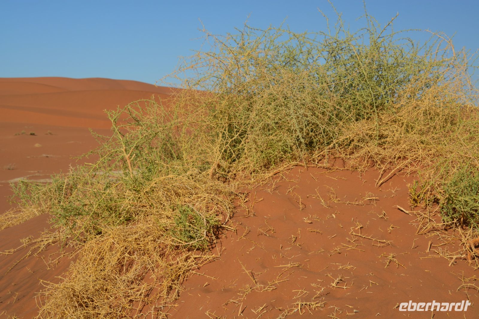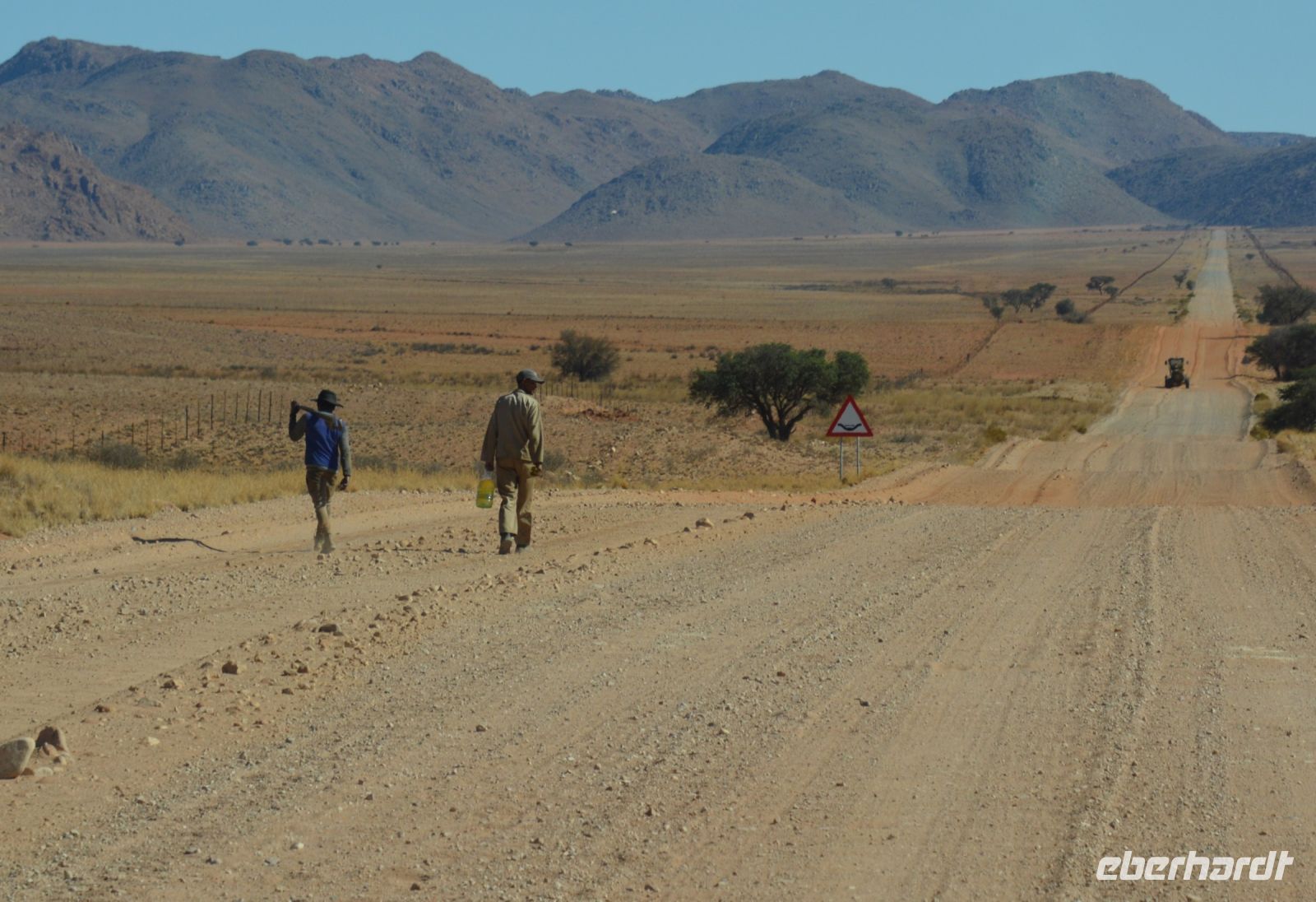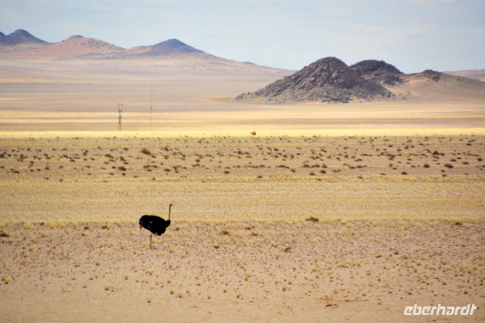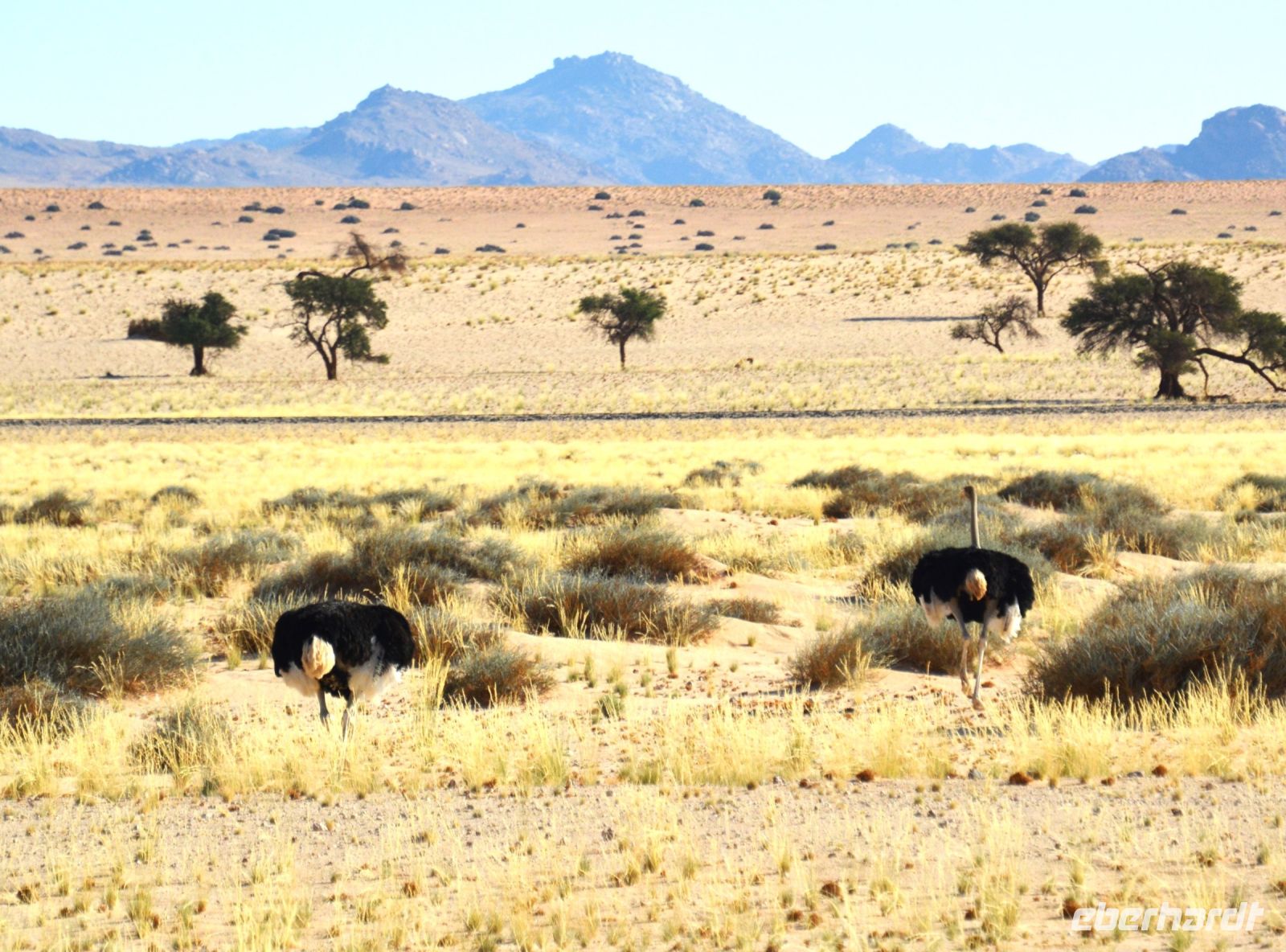 An der Strecke sagt eine Gruppe männlicher Straußenvögel mit ihrem prächtigen Gefieder guten Morgen und auch einige Wildpferde sind wieder unterwegs. Nach einer guten Weile wird die Landschaft immer trockener und vor allem sandiger. Einige Straßenarbeiter räumen den Sand von der Straße, was wohl fast jeden Morgen erledigt werden muss.