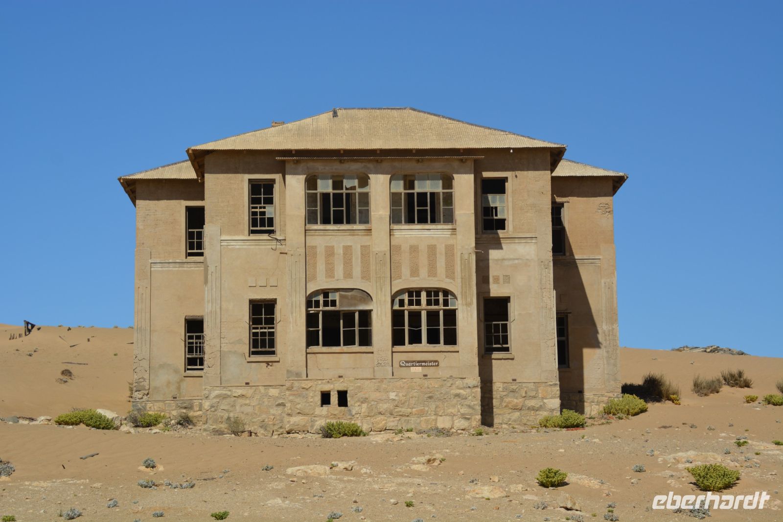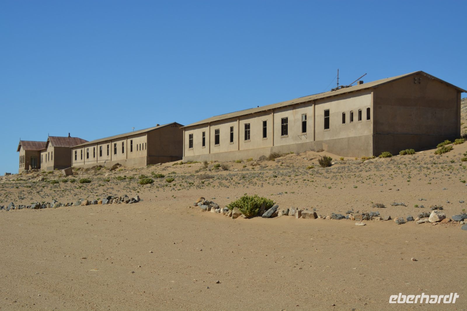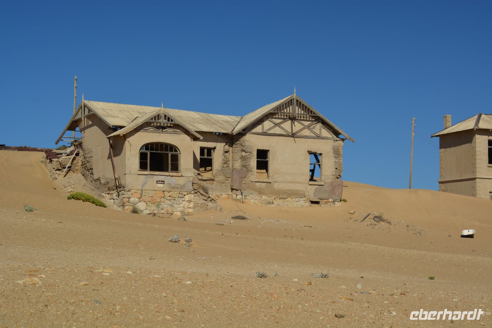 Schließlich erreichen wir die Siedlung Kolmanskuppe, welche im Jahr 1908 kurz nach Fund des ersten Diamanten von Deutschen gegründet wurde. Es wurden Claims abgesteckt und man hat in den folgenden Jahren eine Stadt aufgebaut in der es sich luxuriös leben ließ, jedenfalls nach damaligen Verhältnissen. Heute ähnelt die Stadt einer Geisterstadt wo es wohl auch ab und an spuken soll und wenn es in einigen Köpfen ist. Wir haben eE