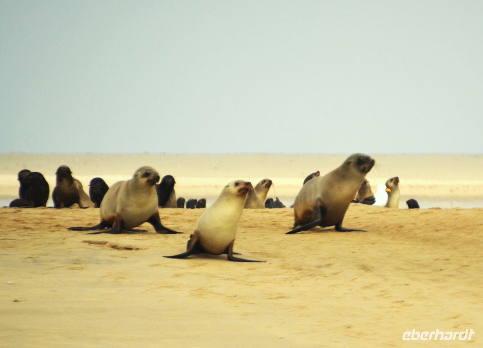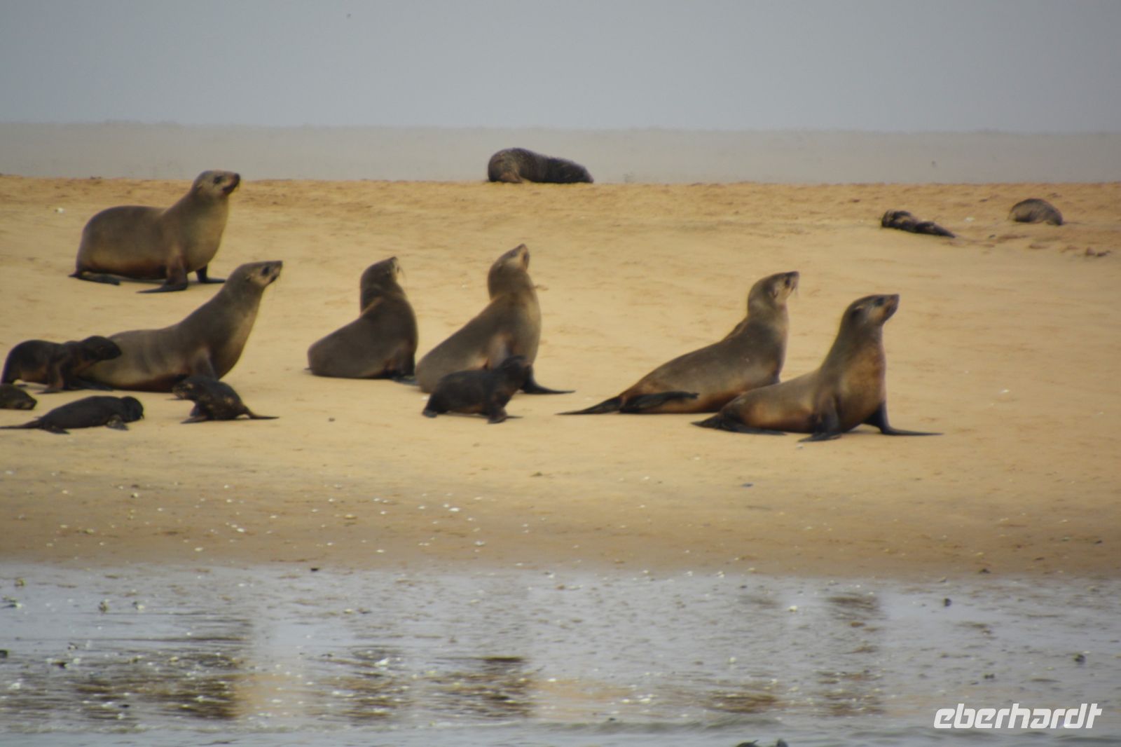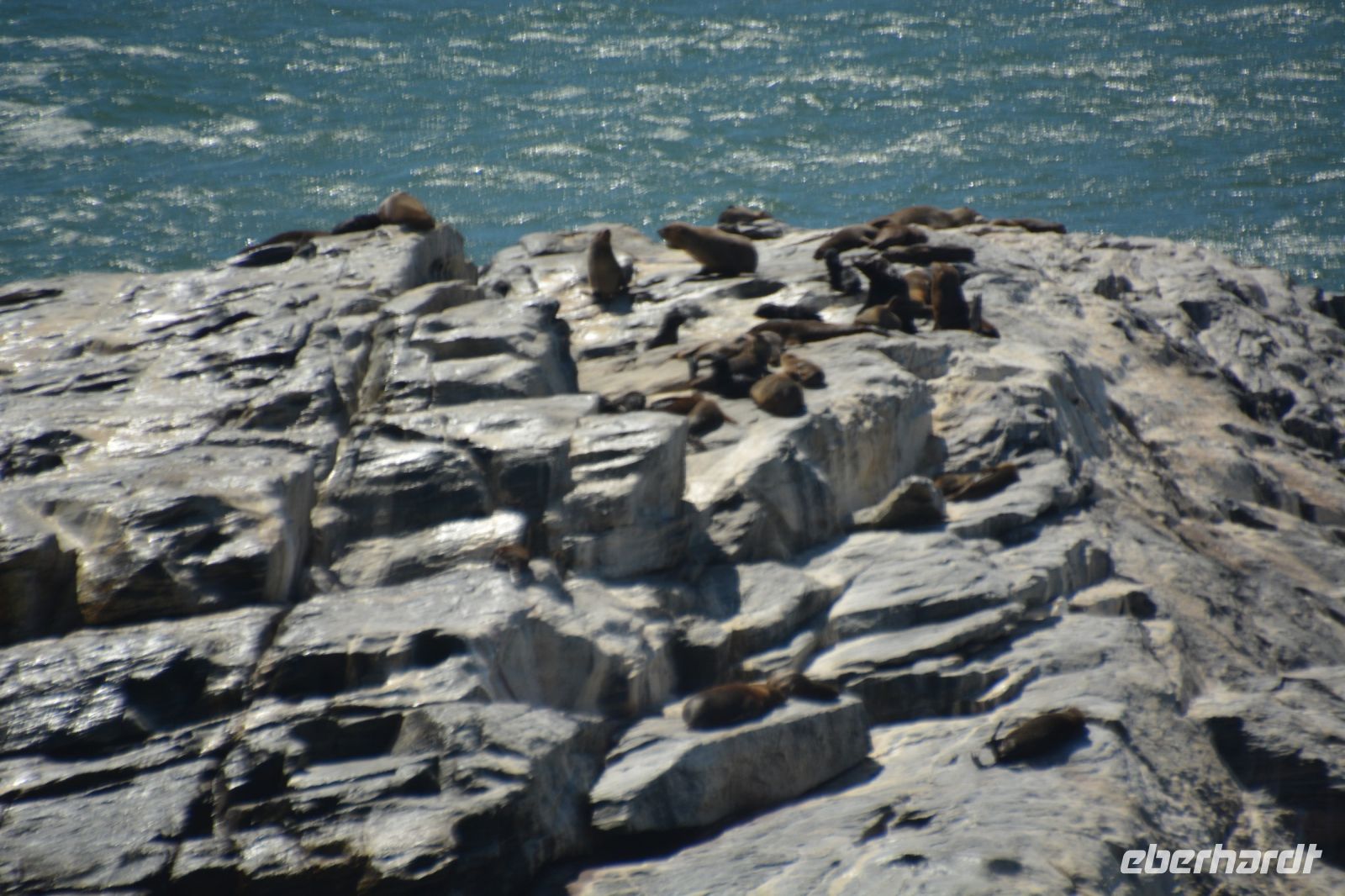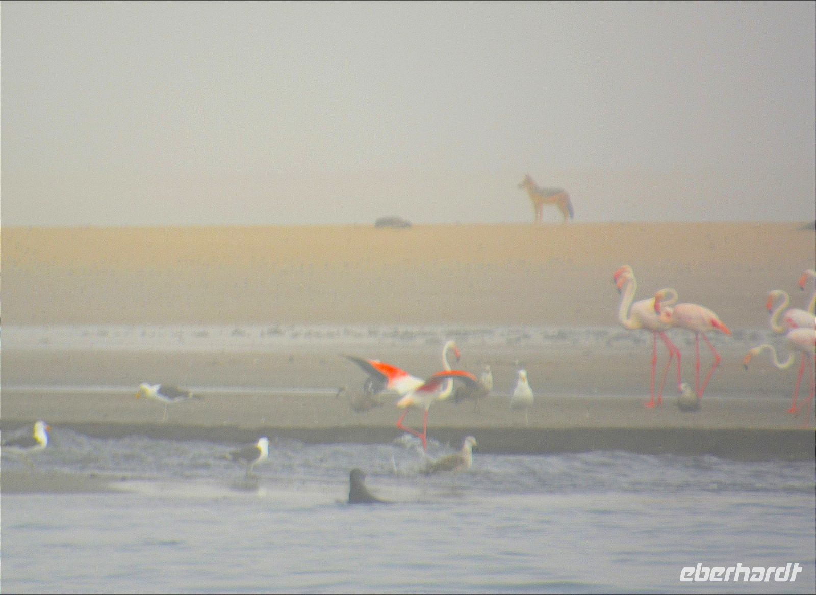 Wir erklimmen das Kreuz bei sehr starkem Südwestwind. Oben entdecken wir auf dem vorgelagerten Felsen eine Robbenkolonie. In einer benachbarten Bucht erlauben sich Flamingos und Möwen ein Spiel mit den Wellen.