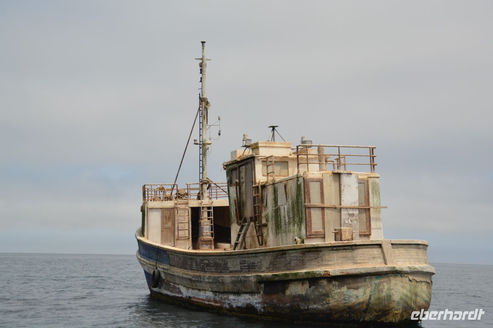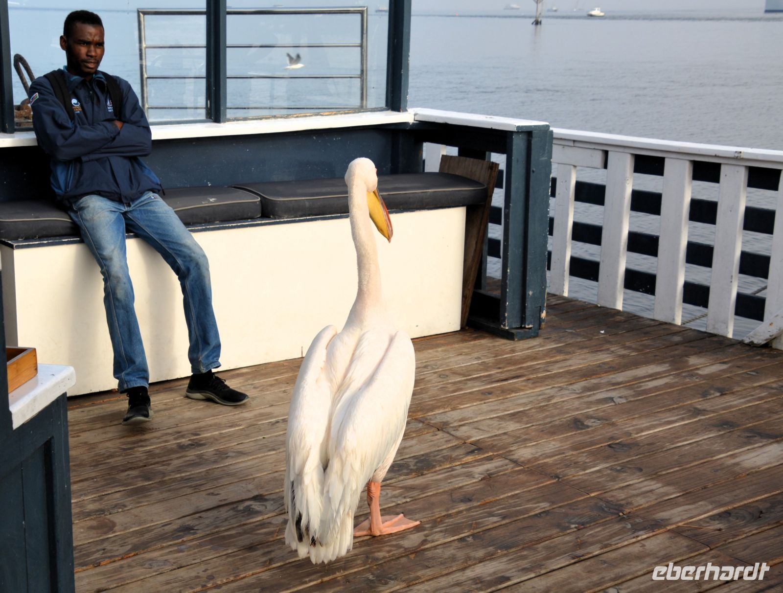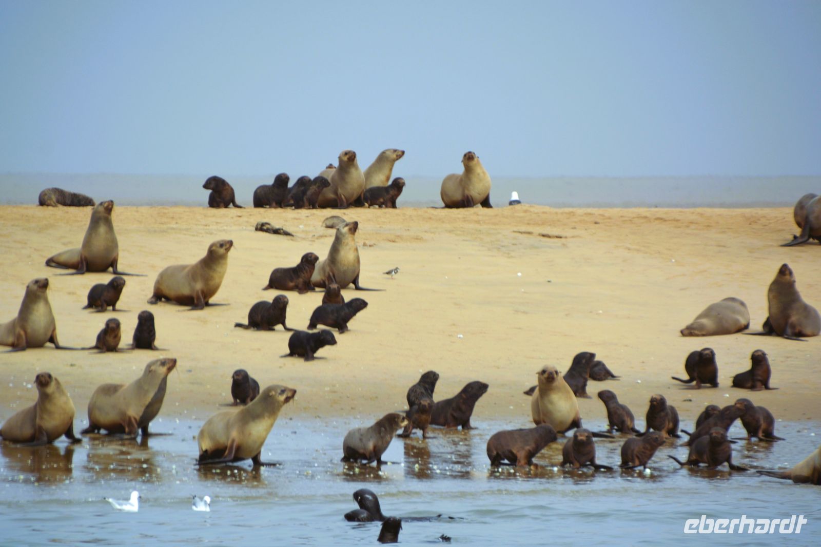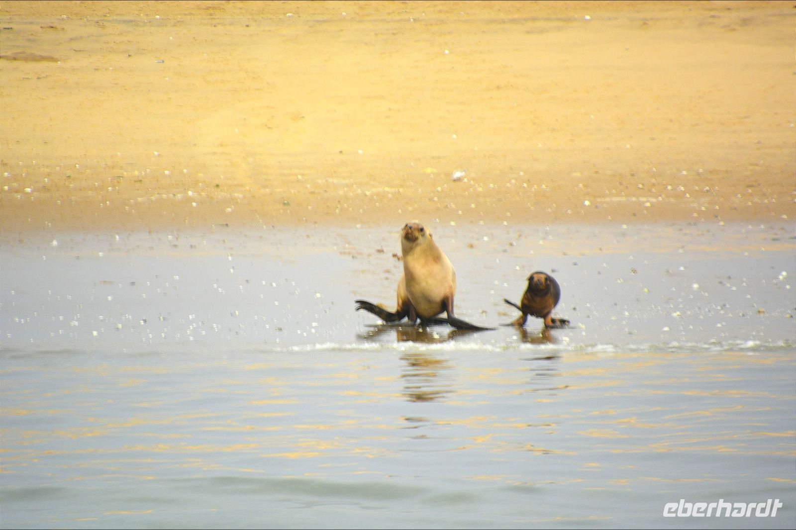 Wir erklimmen das Kreuz bei sehr starkem Südwestwind. Oben entdecken wir auf dem vorgelagerten Felsen eine Robbenkolonie. In einer benachbarten Bucht erlauben sich Flamingos und Möwen ein Spiel mit den Wellen.