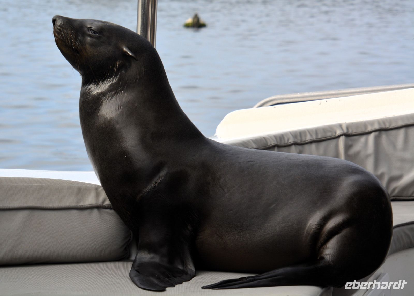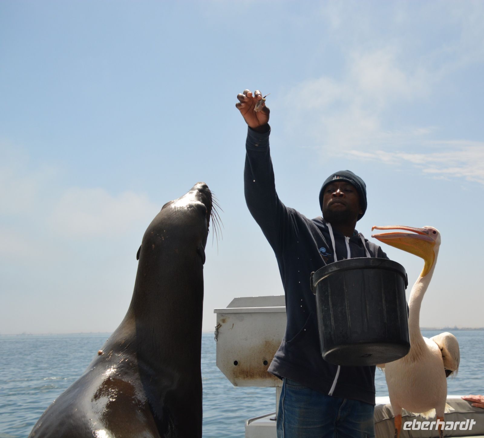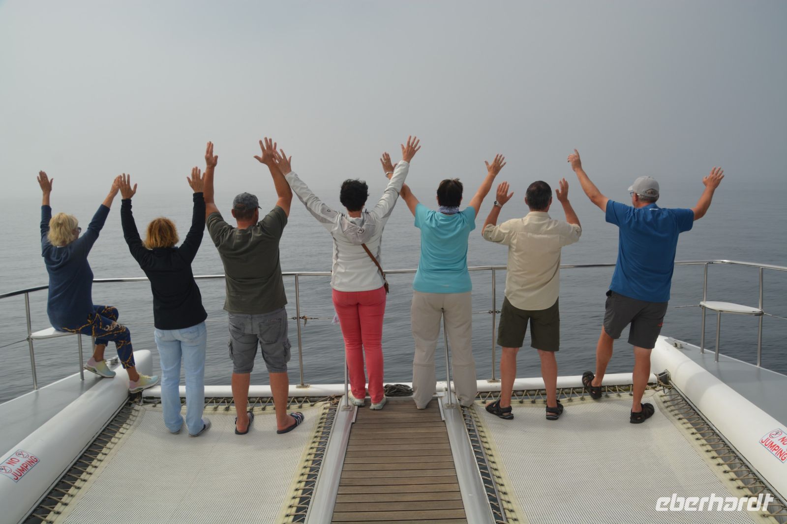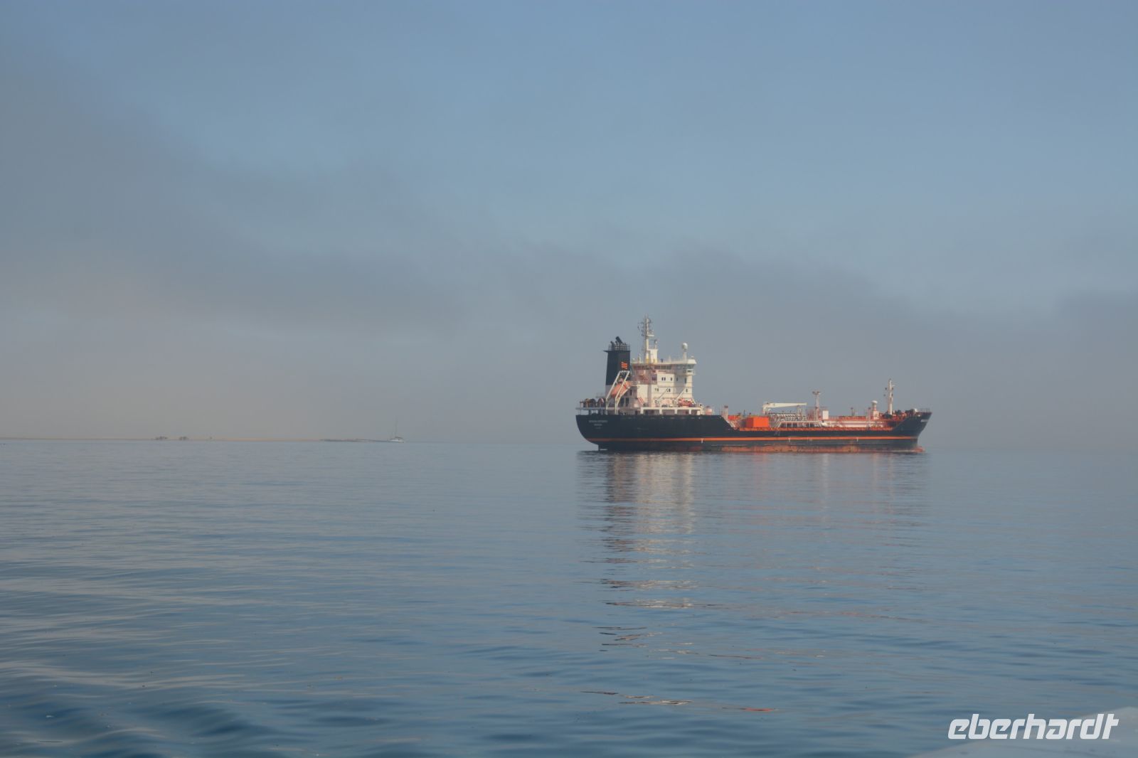 Wir erklimmen das Kreuz bei sehr starkem Südwestwind. Oben entdecken wir auf dem vorgelagerten Felsen eine Robbenkolonie. In einer benachbarten Bucht erlauben sich Flamingos und Möwen ein Spiel mit den Wellen.