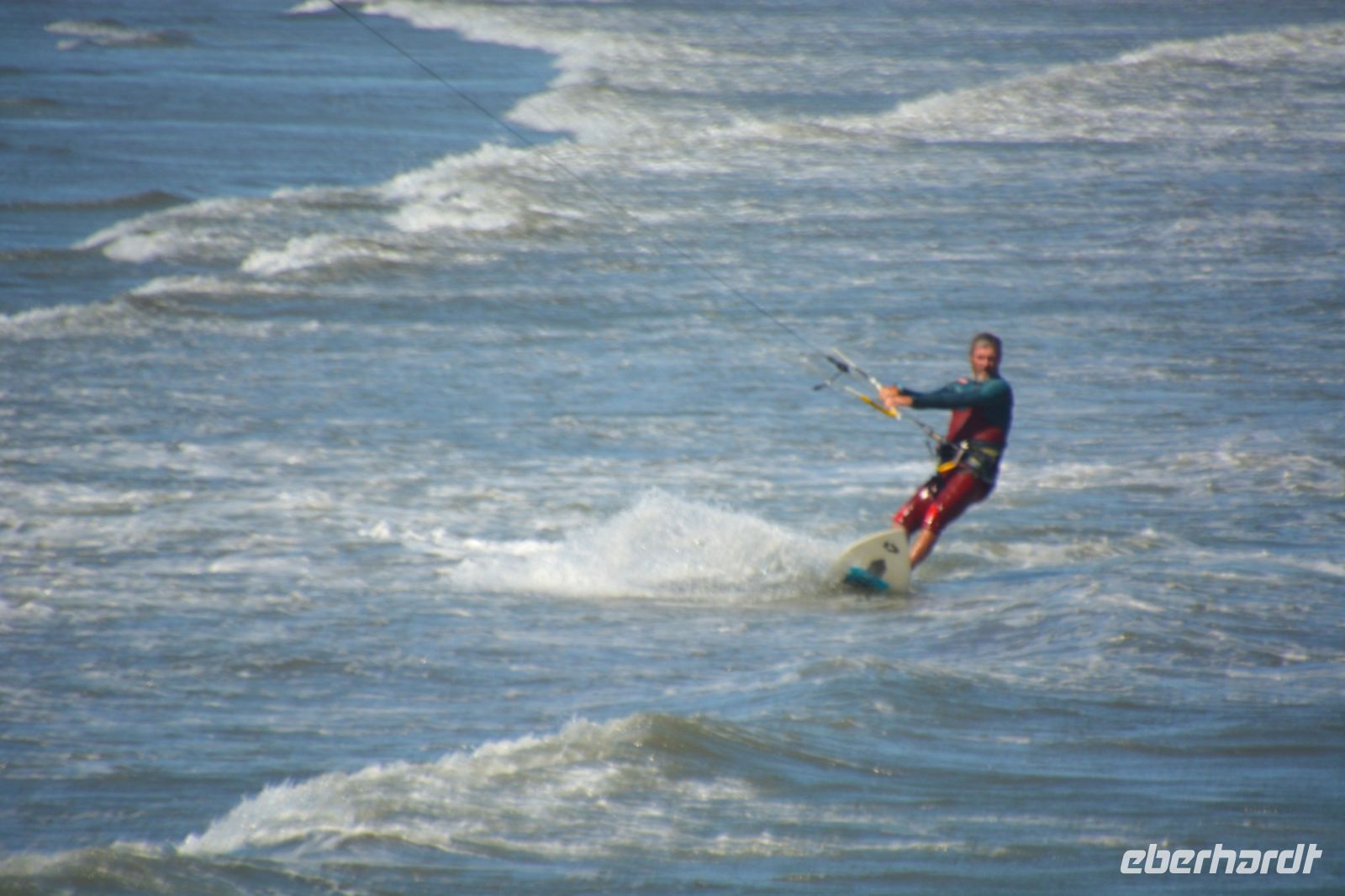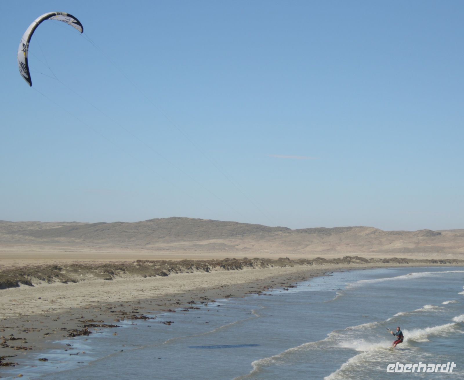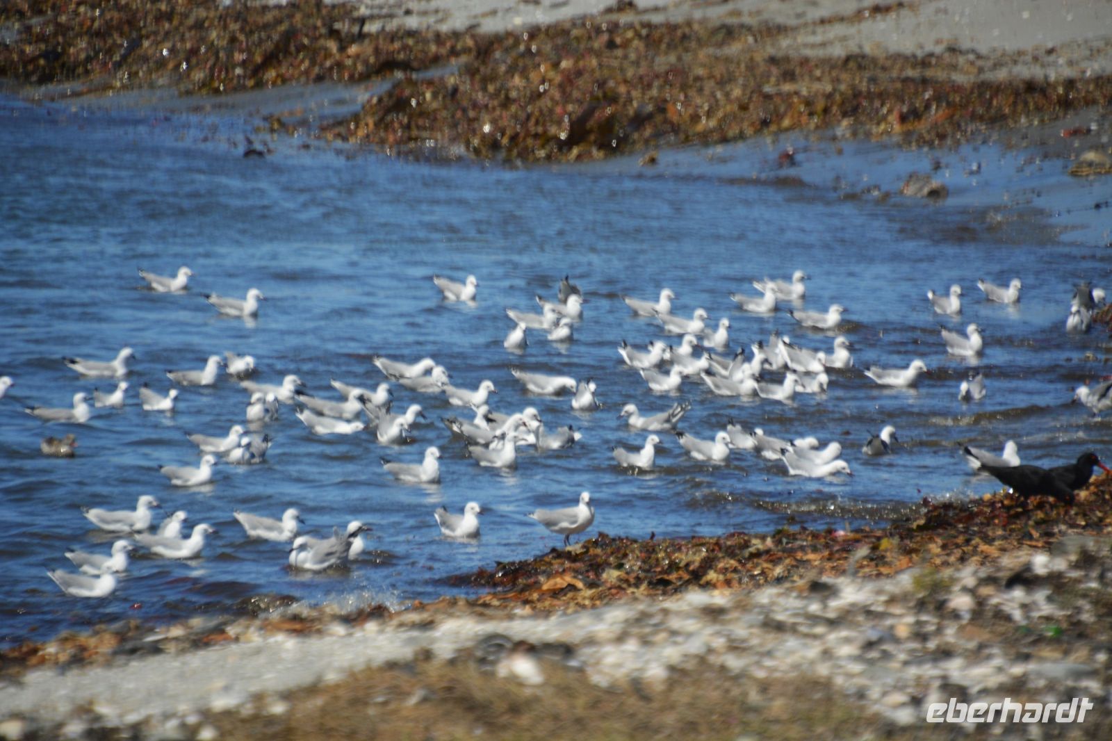 Anschließend fahren wir in Richtung Süden zur Großen Bucht. Wir passieren eine Gruppe von Dominikanermöwen, die gerade ihr Nachmittagsmeeting abhalten. In der Großen Bucht überrascht uns eine Gruppe von Surfern welche uns mit ihren Brettern und Schirmen eine Sondervorführung geben. Wir beobachten Sie eine Weile bei Ihren akrobatischen Flügen oder Ritten.