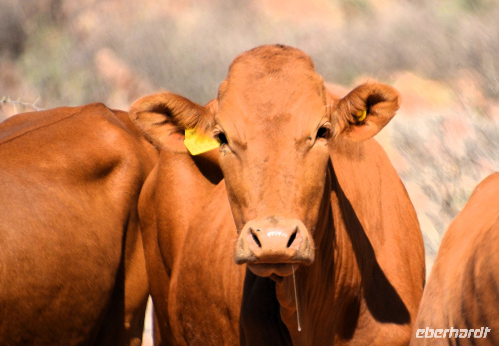 Wir kommen an sog. Kalahari Ferraris und einer interessanten Rinderherde, die aus weißen Rindern besteht, vorbei.