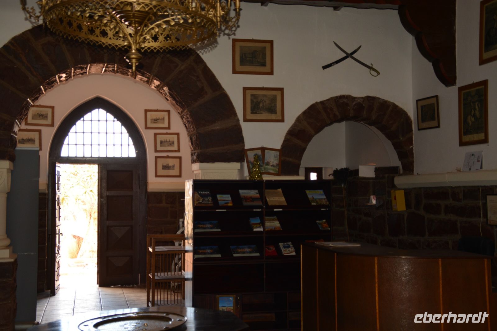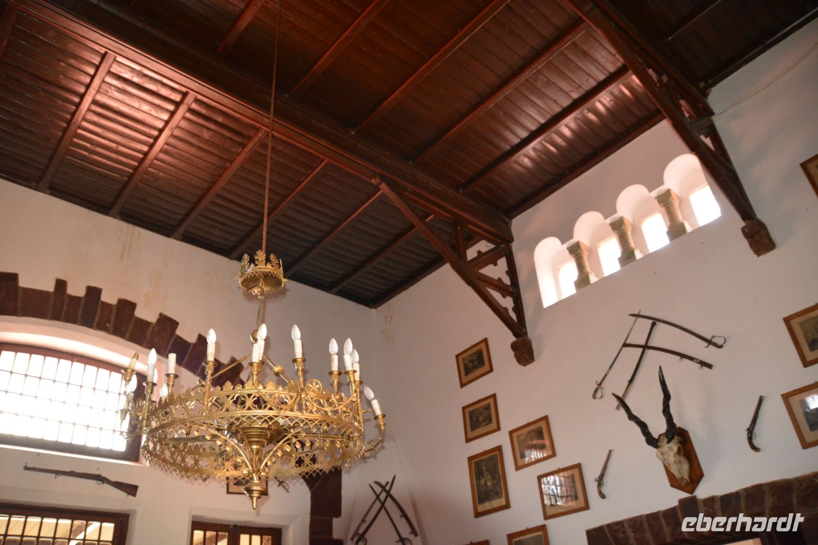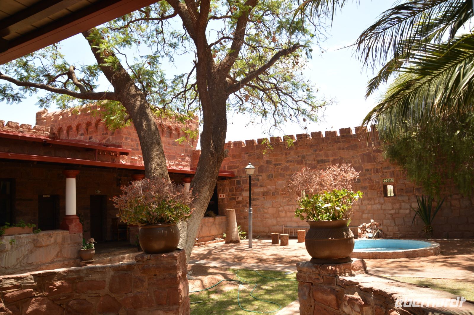 Vor uns liegen die Tirasberge, ein Granitgebirge mit guten Wandermöglichkeiten. Allerdings ist die Region noch nicht so gut touristisch erschlossen. Wir fahren an Rinderherden vorbei und bei einer Herde mit afrikanischen Rindern bekommen wir einen kleinen Vortrag über die verschiedenen Rinderrassen Namibias. Nach einer Tank-, und Trinkpause in einem netten kleinen Motel in Helmeringhausen fahren wir weiter in Richtung Schloss Duwisib, welches der deutsche Offizier Hansheinrich von Wolff mit dem Geld seiner reichen amerikanischen Frau Jayta bauen ließ. Der 1.Weltkrieg begann, Hansheinrich fiel im Krieg. Seine Witwe hielt es wohl nicht sehr lange aus und ging in die Vereinigten Staaten zurück. Heute gehört das Anwesen dem Staat.