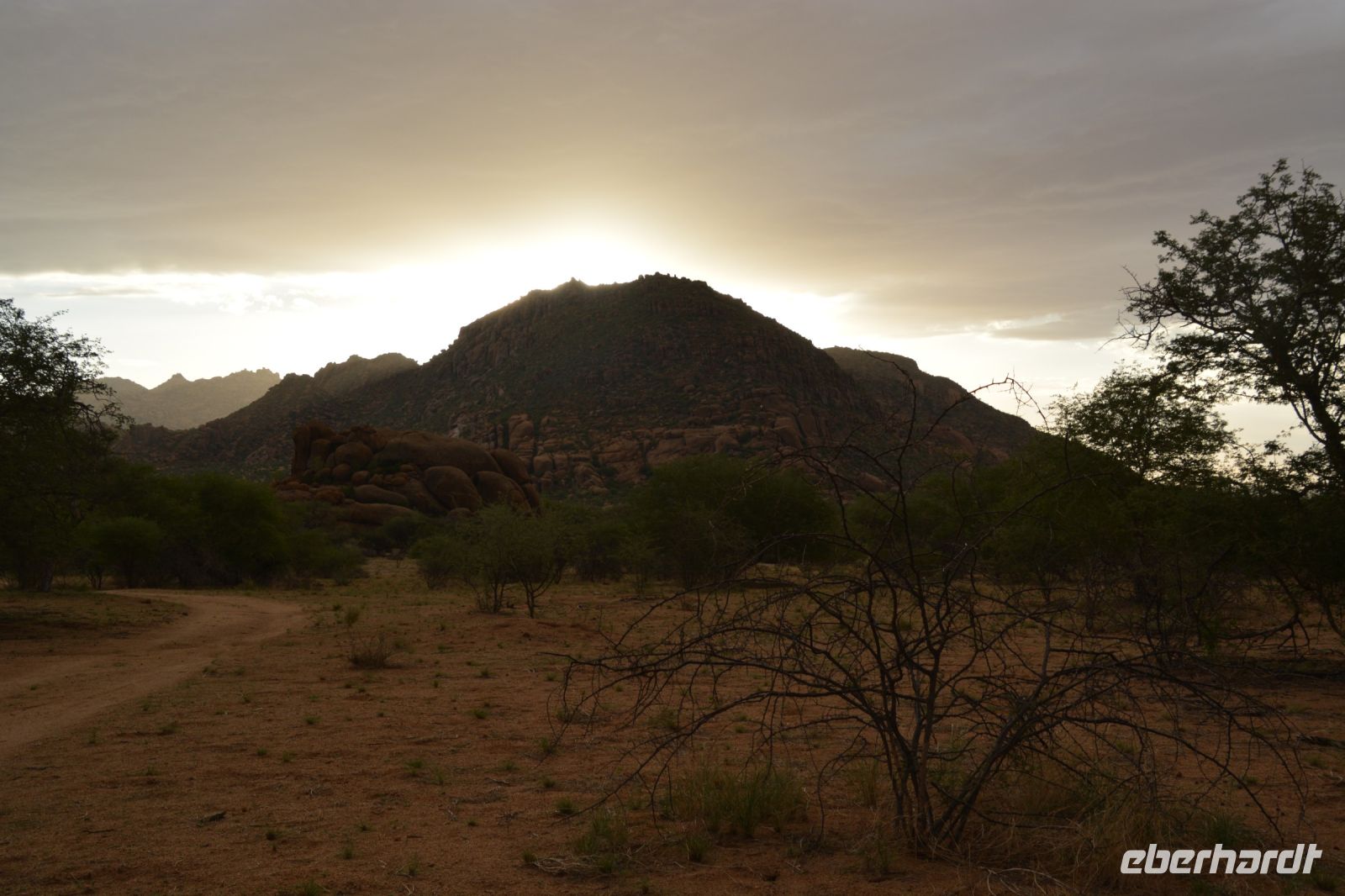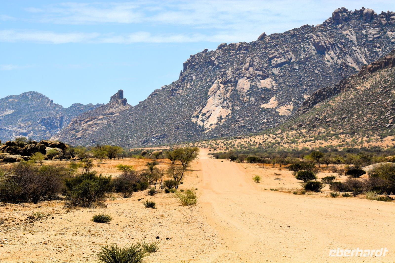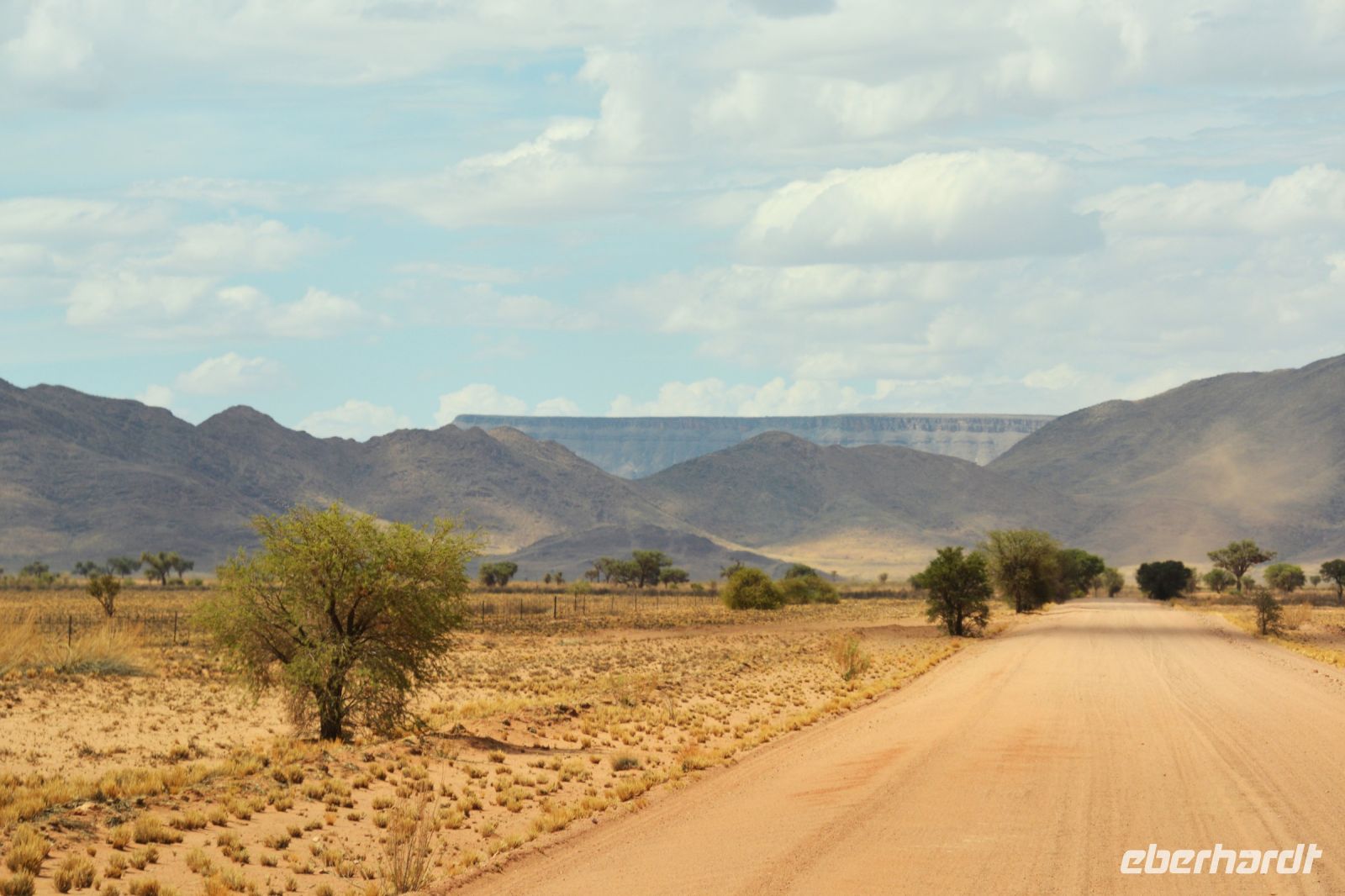 Durch Baumsavanne nähern wir uns langsam unserer Lodge, ab und zu liegt eine Farm am Weg. Es ist schon wieder heiß und die Kühle von heute Morgen ist vergessen. Vor uns liegen die Erongo-Berge,