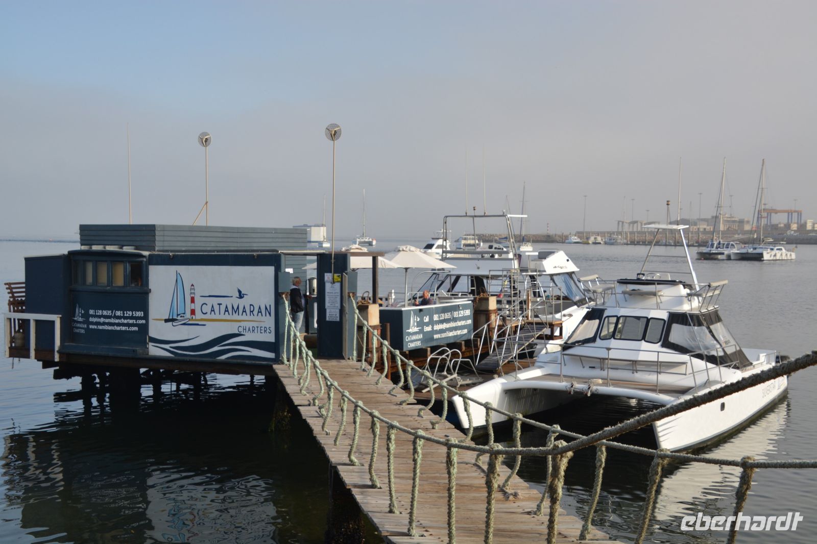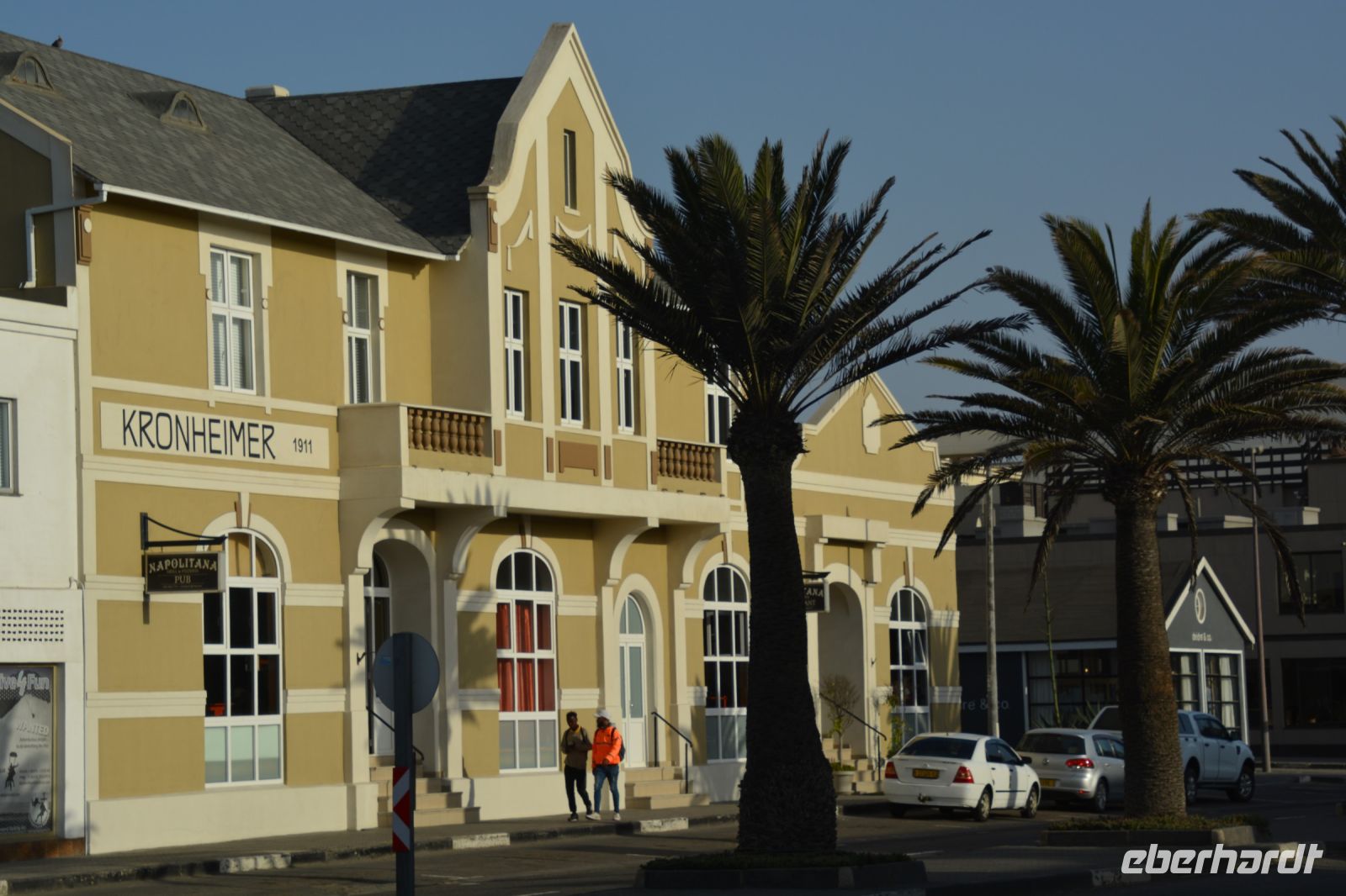 Anschließend fahren wir in den Ort Lüderitz der zahlreiche Bauten im neogotischen und auch wilhelminischen Stil hat. Nach Supermarkt und Bankbesuch fahren wir hoch zur Felsenkirche, die im neugotischen Stil erbaut und mit Glocken aus Thüringen 1912 eröffnet wurde. Von hier haben wir einen ersten Blick auf die Lüderitzbucht.
