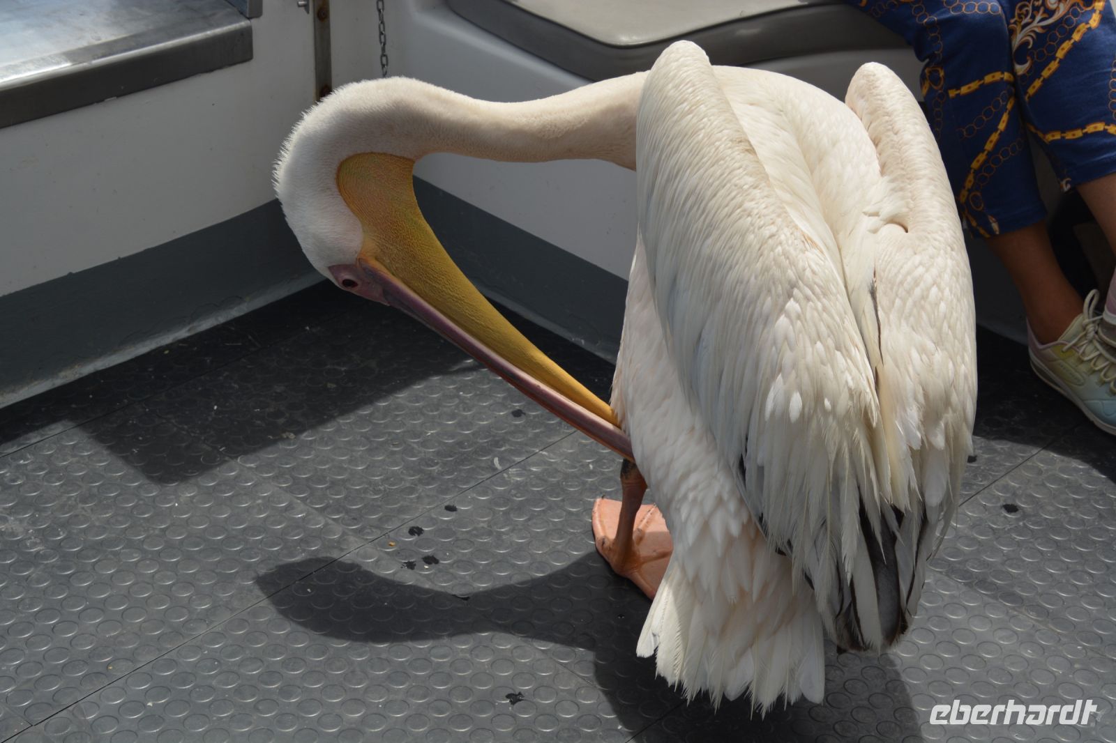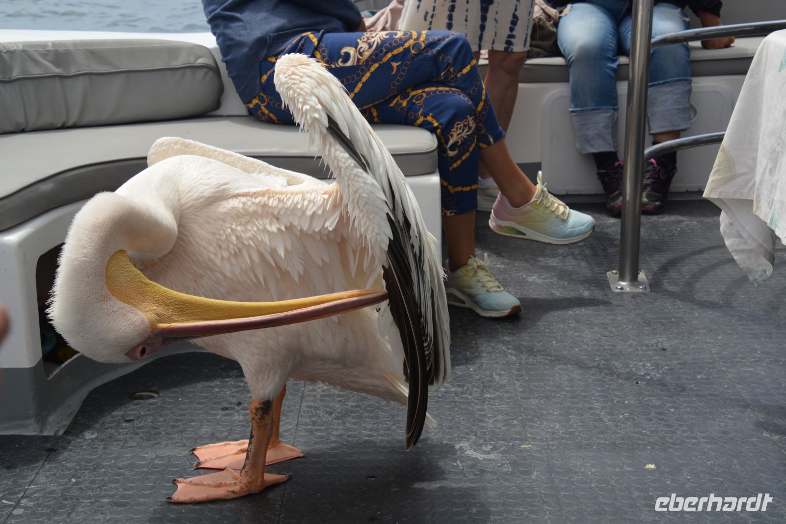 Danach fahren wir zu einem weiteren Höhepunkt des Tages. Den Wind, der ordentlich bläst, bekommen wir gratis dazu. Der Weg führt in Richtung Süden, auf der rechten Seite liegt das Meer mit Vogelkolonien, dann durch eine Salzpfanne in Richtung Norden bis wir zum Leuchtturm kommen der auf einer Landspitze zwischen Sturmvogelbucht und Guano-Bucht.