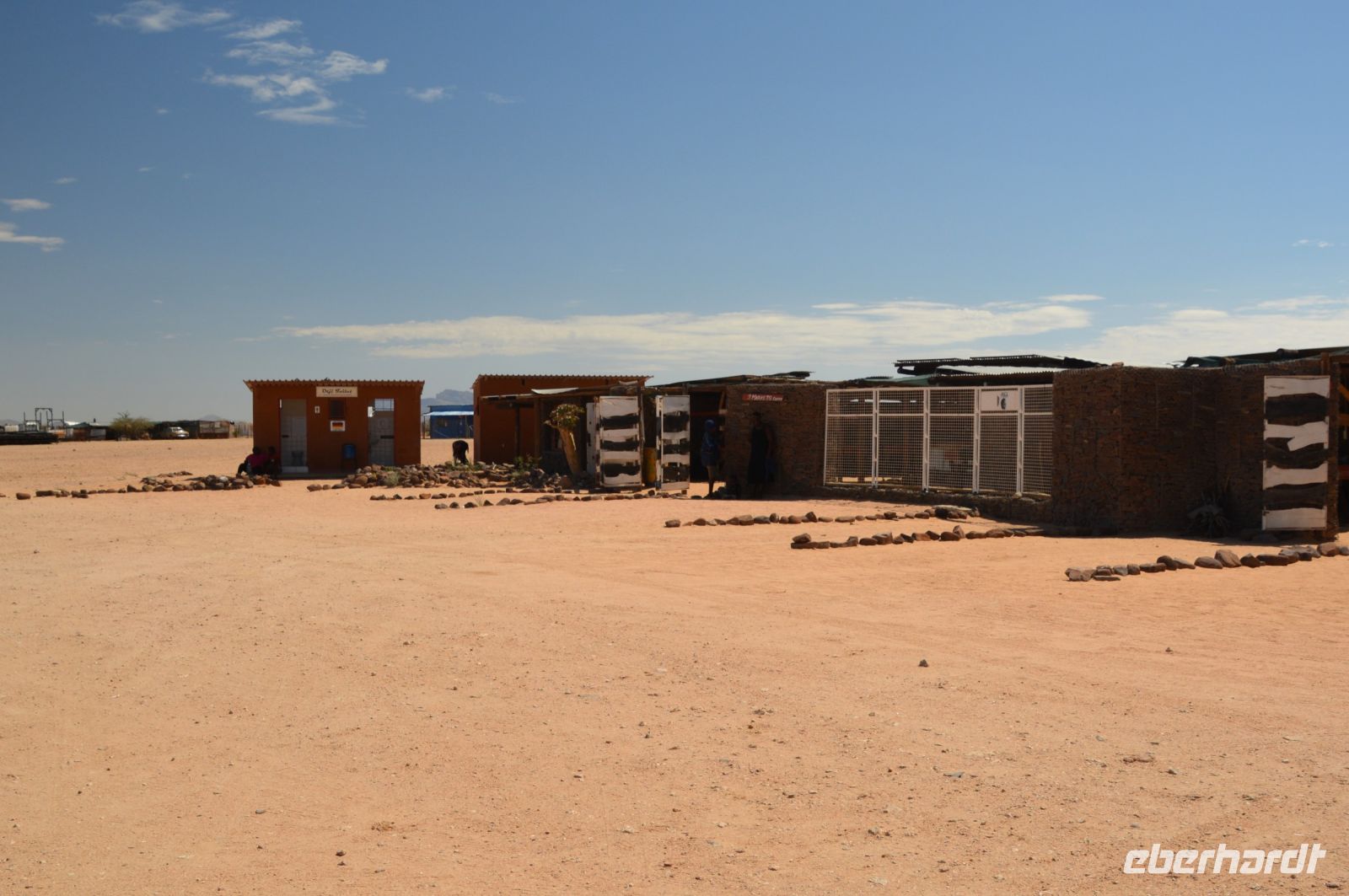 Hier in diesem Teil Namibias sind vorwiegend die Nama zuhause. Ihre Hütten können wir im Vorbeifahren sehen. Sie sind aus Wellblech und sie haben keinen Stromanschluss. Wer Arbeit hat und sich ein wenig mehr Wohlstand erarbeitet hat baut sich ein festes Haus mit Zugang zur Elektrizität.