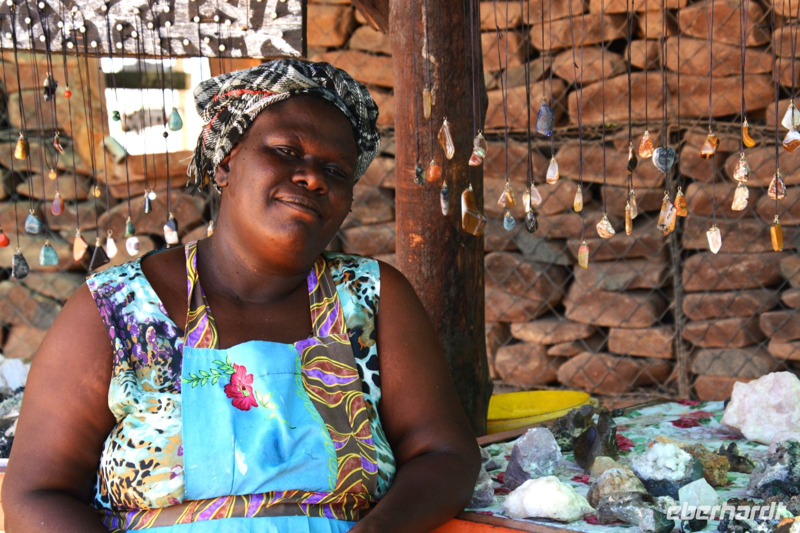Dann gehen wir zu den Frauen, die für den Haushalt und die Kinder zuständig sind. Sie produzieren auch den Schmuck und anderes, wie Gefäße aus Straußeneiern und Schnitzereien.