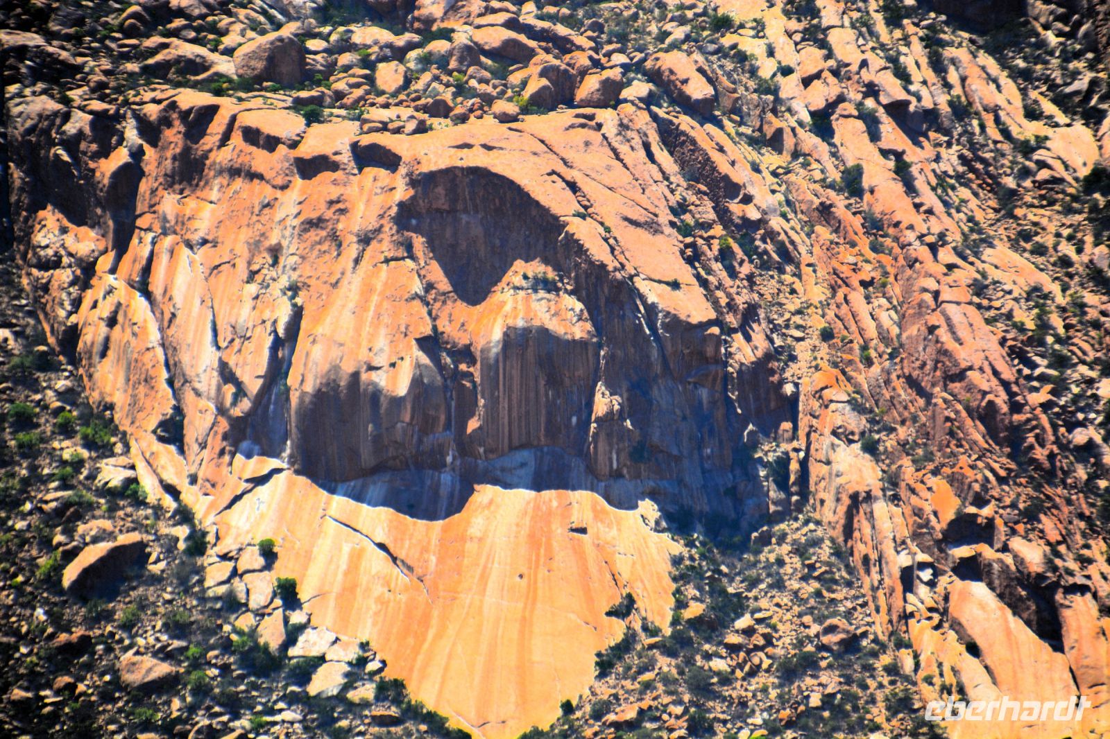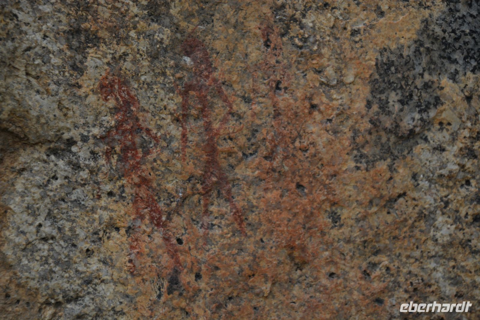 Am späten Nachmittag treffen wir uns zu einem kleinen Rundgang zu den Felszeichnungen die es auf dem Gelände gibt. Der Besitzer wusste wohl schon beim Erwerb der Lodge, dass sich die Felszeichnungen hier befinden. Es gibt einen kleinen Rundweg, den wir mit Issy gehen. Sie sind zwar nicht ganz so spektakulär wie die Felszeichnungen von Twyfelfontain die UNESCO-Weltkulturerbe sind, haben aber auch ein Alter von bis zu mehreren tausend Jahren. Sie stammen von den San, welche die Urbevölkerung von Namibia