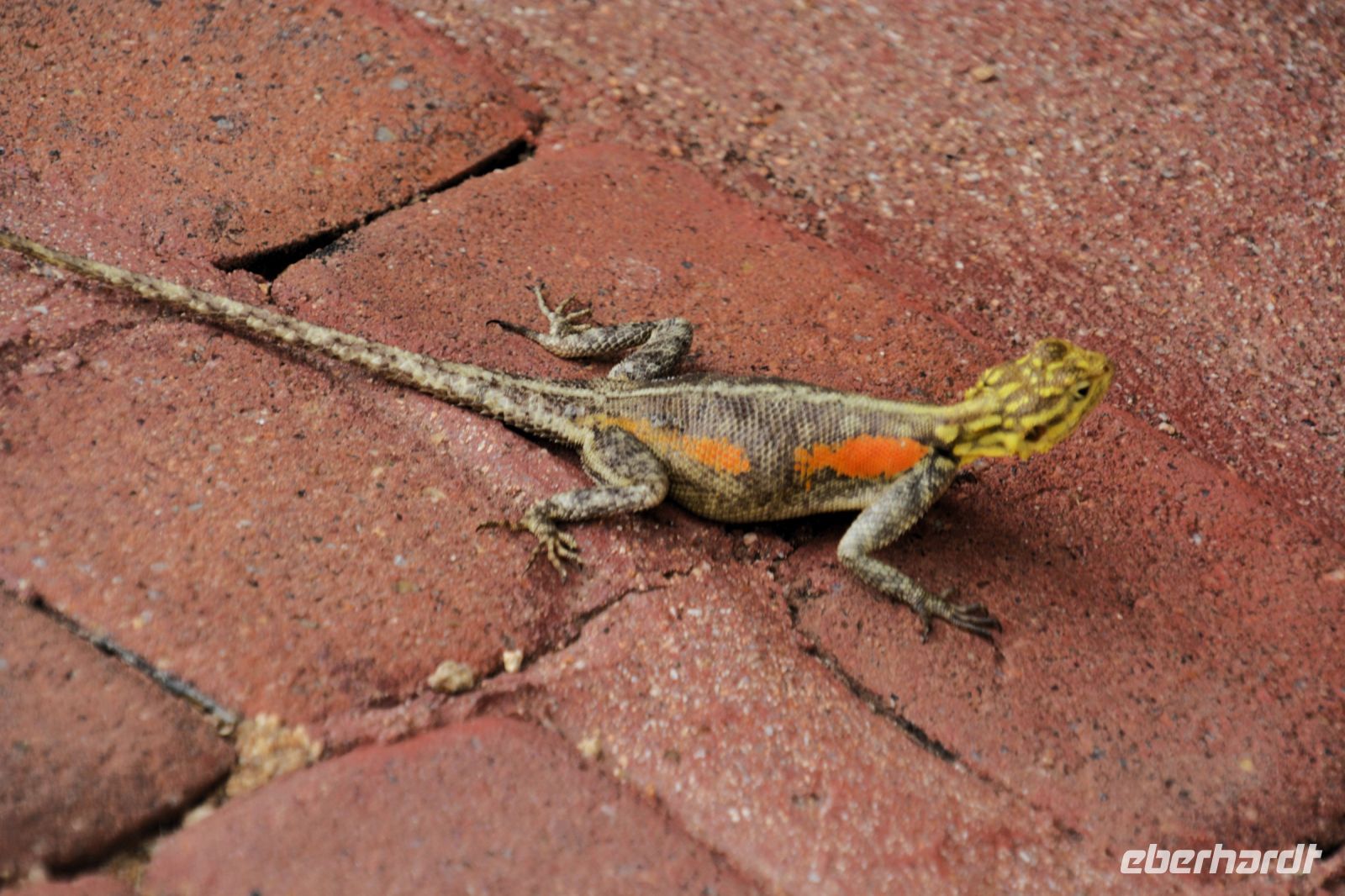 Plötzlich läuft ein Waran, der ein wenig größer ist über die Straße. Die Tierwelt von Namibias gibt auch heute ihr Ganzes.
