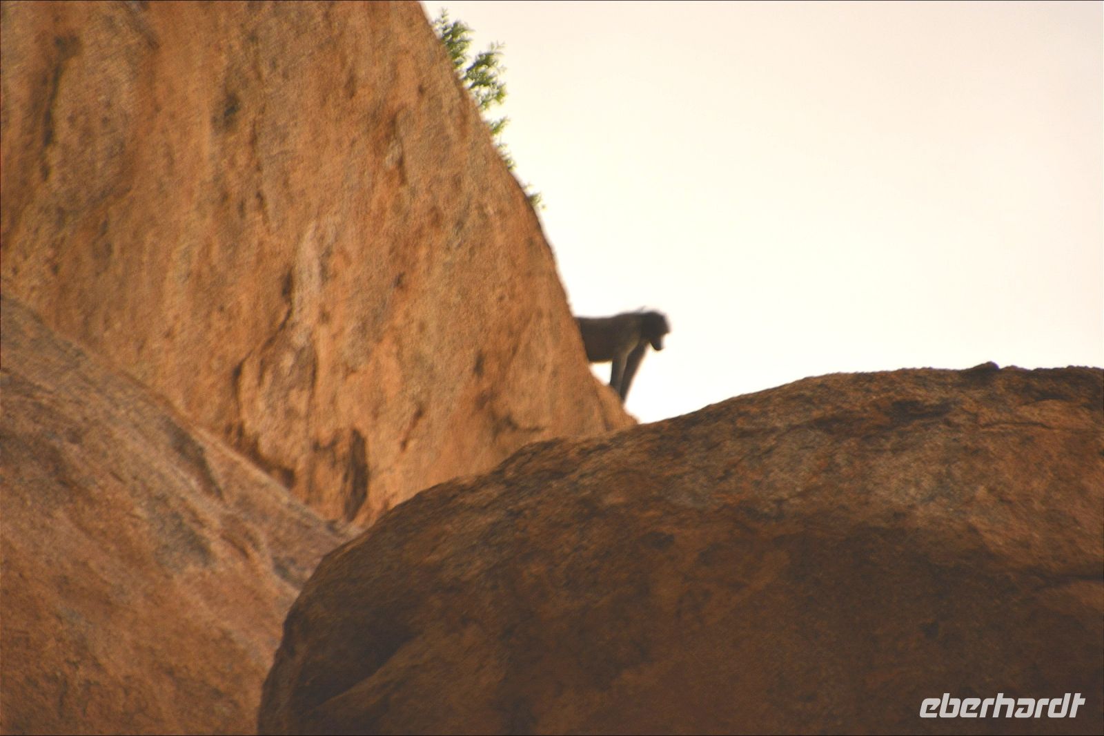 Kurz vor Ankunft in unserer Lodge sehen wir am Rande der Straße Bergzebras die uns, durch Ihre Streifen gut getarnt, vom Felsen aus beobachten.