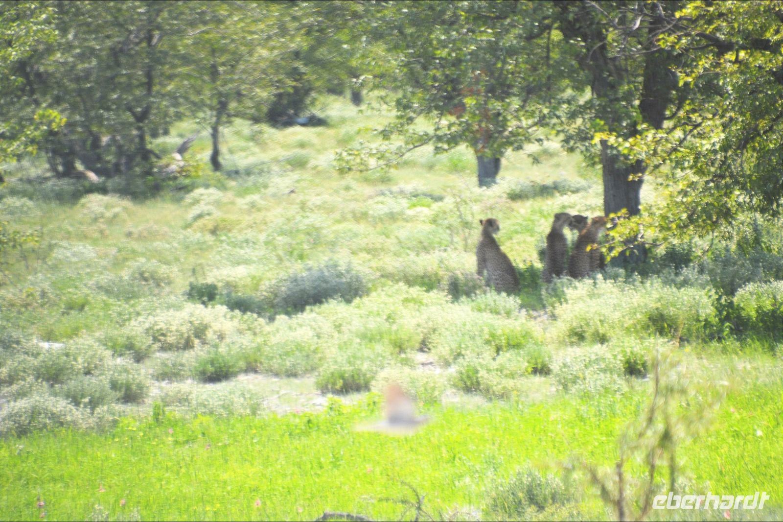 Wenn wir gewusst hätten, dass sich in nicht allzu weiter Entfernung eine Geparden-Familie unter einem Baum räkelt, wären wir sicher nicht ganz so ruhig gewesen. Eigentlich darf man das Fahrzeug ja nicht verlassen aber was bleibt uns anderes übrig. Nach dem Reifenwechsel treffen wir einen anderen Wagen von Senses of Africa, die uns etwas von Geparden erzählen. Und tatsächlich 100 Meter weiter sitzt eine ganze Familie dieser wunderschönen Katzen unter einem Baum. Wir beobachten sie eine Weile aus der Ferne. Anschließend kommt eine große Straußenfamilie ins Blickfeld. Ob das alles eigene Kinder sind? Strauße brüten wohl auch von anderen Eier aus.
