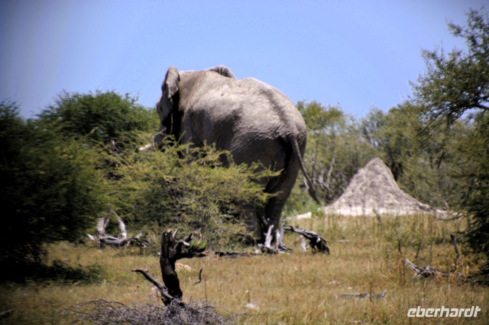 Issy möchte noch bis zu einem bestimmten Wasserloch. Also gut, noch ein Stück weiter. Nach einem gesichteten Elefanten der sich bei näherem Hinsehen als Giraffe herausstellt, (da hat wohl jemand den Rüssel des Elefanten mit dem Hals der Giraffe verwechselt ??), unsere Reisebegleiterin zum Trinken aufgefordert hat und zur baldigen Umkehr mahnt, taucht plötzlich am Wasserloch ein gigantischer Elefantenbulle auf, der wohl gerade vom Baden kommt. Bis zu 4 Tonnen kann ein ausgewachsener Bulle auf die Waage bringen. Auch er wendet sich irgendwann ab und verschwindet hinter Bäumen.