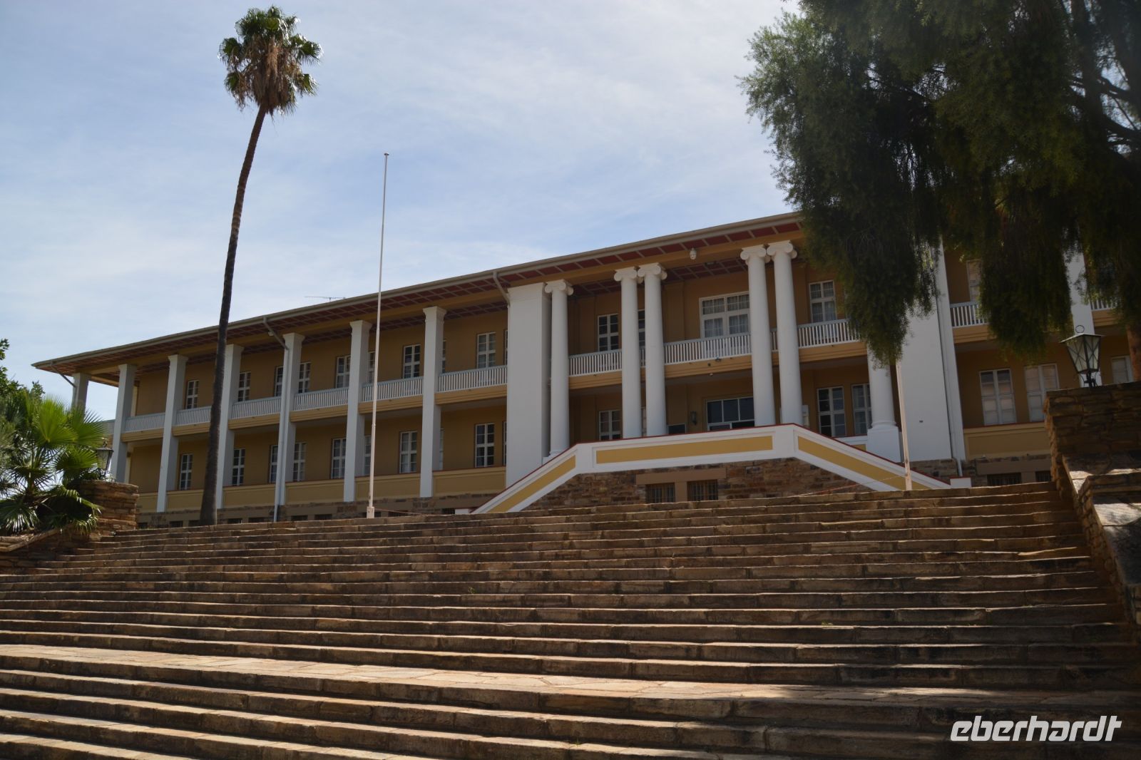 Nach einem späten Frühstück beginnen wir heute unsere Rundfahrt durch Windhoek und fahren zur Christuskirche der Evangelisch-Lutherischen Gemeinde, die wir von außen anschauen. Nicht weit davon entfernt befindet sich das Unabhängigkeitsmuseum, welches von einem nordkoreanischen Bauunternehmen errichtet wurde mit Sam-Nujoma-Statue davor. Das Gebäude wird auch scherzhaft als Kaffeemaschine bezeichnet. Auch auf die Alte Feste mit dem Völkermorddenkmal werfen wir einen Blick. Dann fahren wir weiter zum Präsidentenpalast der auf einem der vielen Hügel von Windhoek liegt. An ihm steht die Fahne wegen des Todes von Präsident Geingob auf Halbmast.