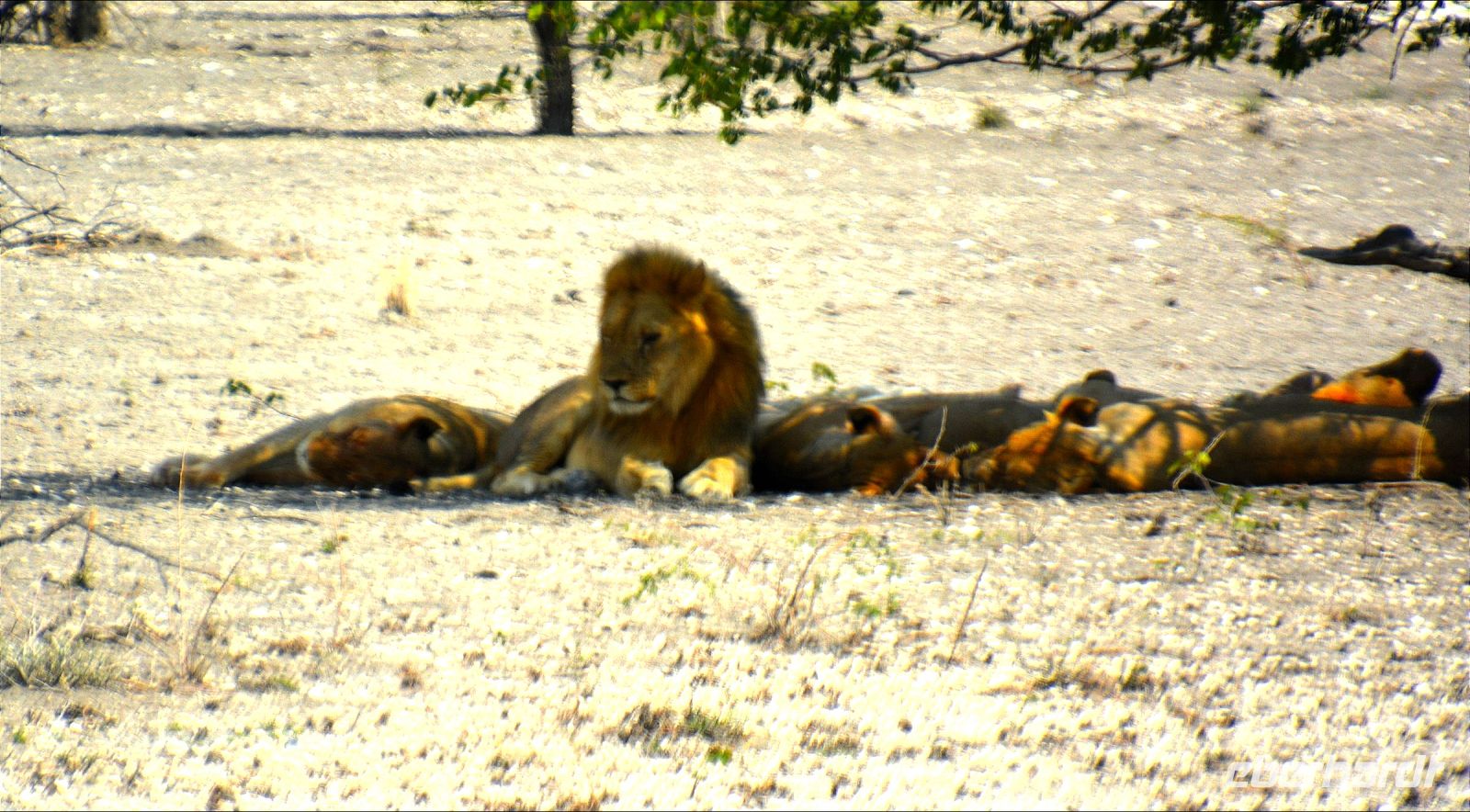 Wir erspähen einige Springböcke und Giraffen. Wonach suchen wir eigentlich noch? Wir haben schon so viele Tiere gesehen aber es fehlen noch ganz entscheidende Exemplare die es hier im Park geben soll. In der Ferne sehen wir mehrere Fahrzeuge an einer bestimmten Stelle. Das ist immer vielversprechend. Denn da gibt es bestimmt etwas Interresantes. Wir fahren in die Richtung und schon von Weitem sieht man, dass es unter einem Baum eine Gruppe von Tieren gibt. Welches Tier befindet sich fast immer unter seinesgleichen? Na klar, die Löwen! Und tatsächlich hat es sich unter einem schattenspendenden Baum eine Löwenfamilie gemütlich gemacht. Wir beobachten sie eine ganze Weile. Es ist ein Männchen mit seinem Weibchen und jüngeren Löwen.