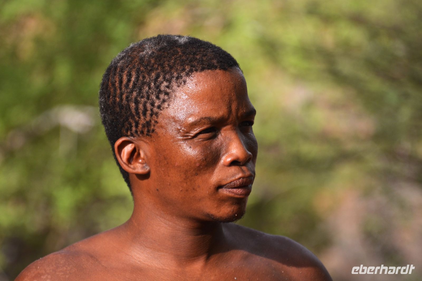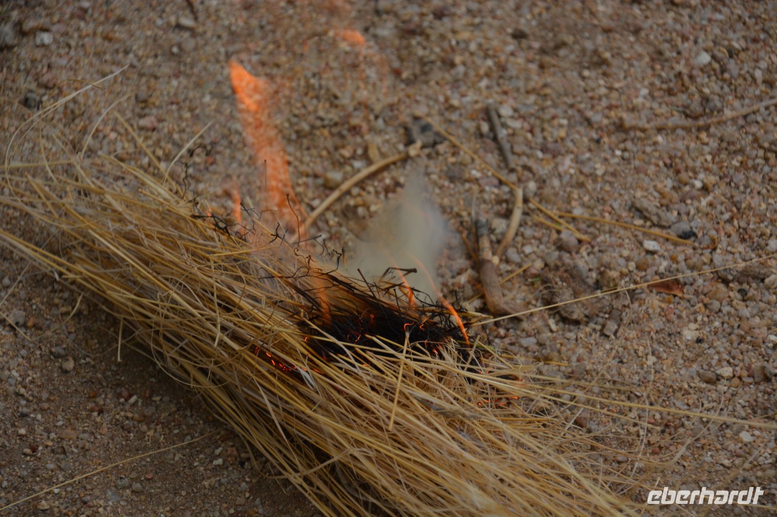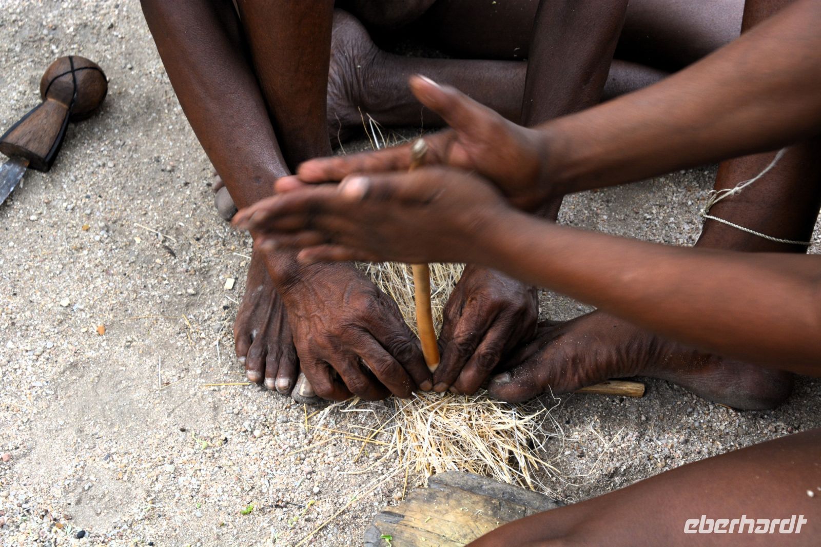 Wir werden von einem jungen San-Mann in seiner Sprache begrüßt. Wir bekommen gezeigt, wie Feuer gemacht wird und wie die Jäger durch Anschleichen mit Pfeil und Bogen ein Kudu erlegen.