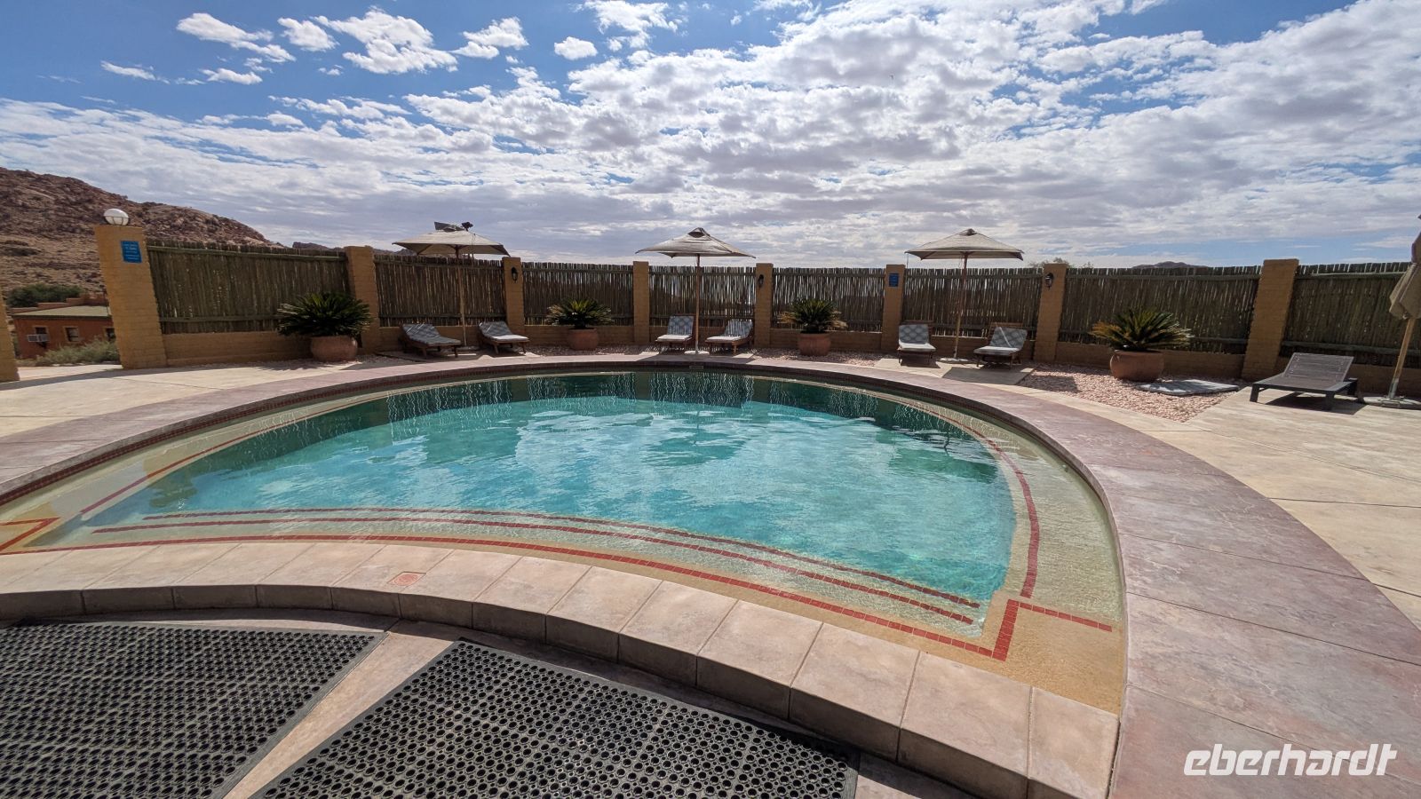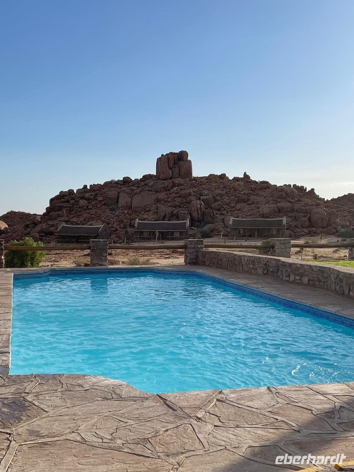 In unserem Hotel, der Kalahari Anib Lodge, angekommen, bezogen wir fix die Zimmer und hüpften direkt in den Pool – eine Wohltat nach der Fahrt.