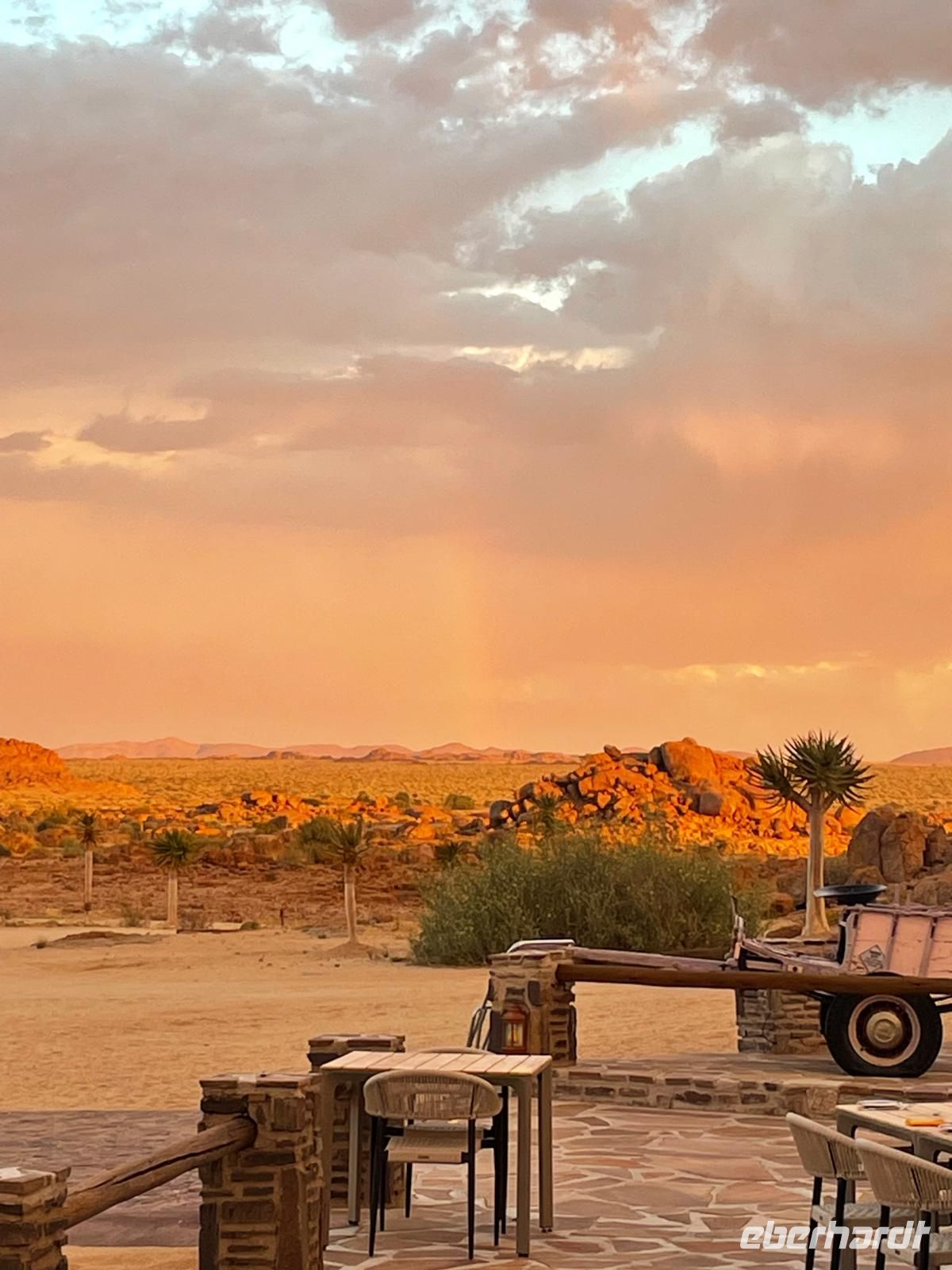 Am Abend genossen wir dann unser erstes gemeinsames Dinner, begleitet von einem fantastischen Blick in die Weite der Wüste. Namibia-Feeling pur.