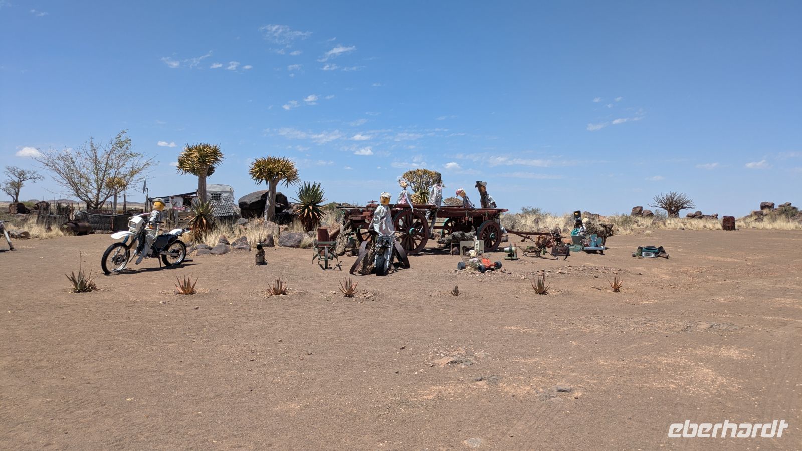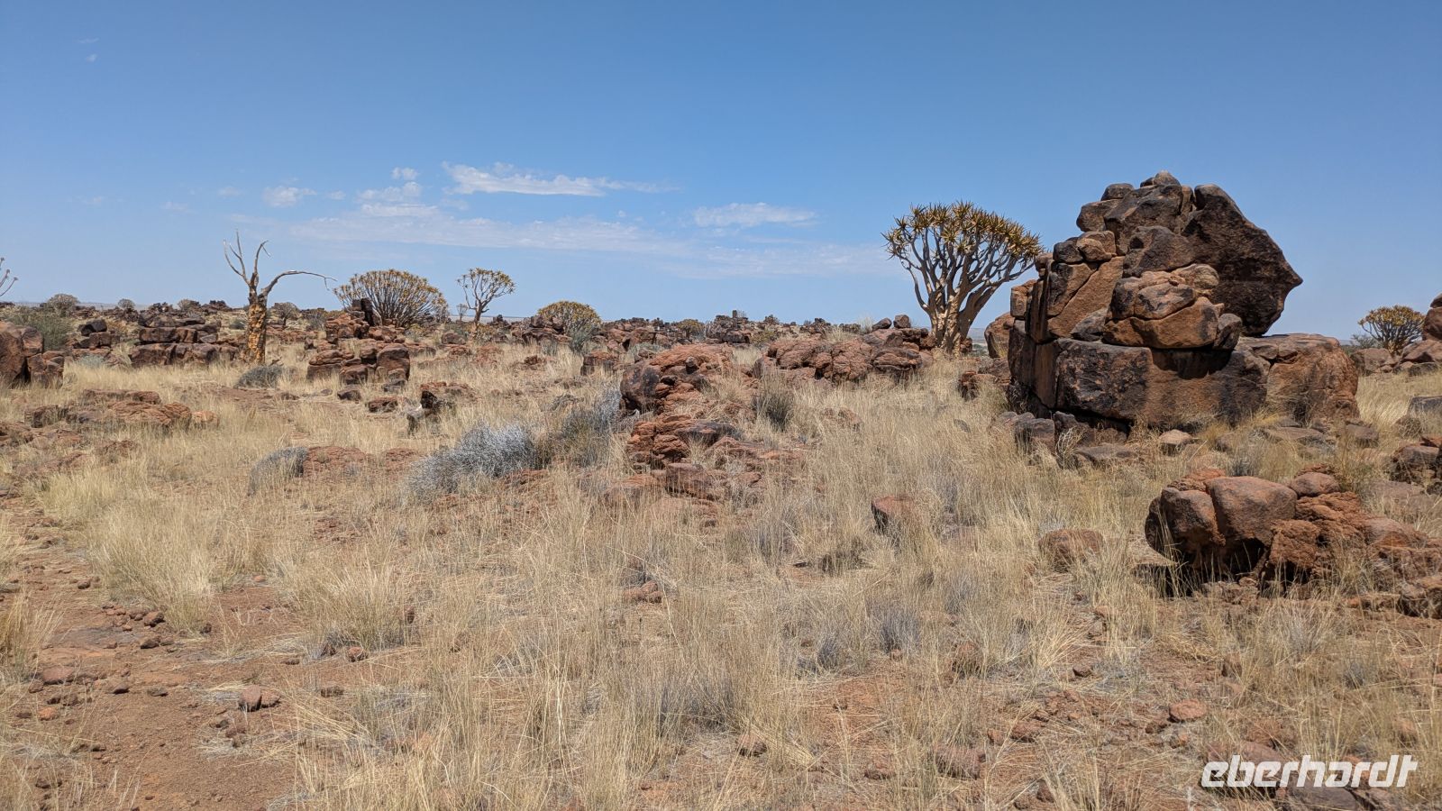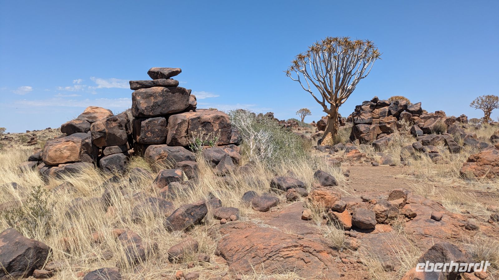 Die Köcherbäume wachsen vor allem in den trockenen Wüstenregionen Namibias und gehören eigentlich zu der Sukkulenten Art. Ihren Namen verdanken sie den San (Buschmännern), welche die Äste aushöhlten, um daraus Pfeilköcher zu machen. Die Bäume können beeindruckende 3 bis 9 Meter hoch und bis zu 200–300 Jahre alt werden. Gleich daneben liegt der Giants Playground – eine eindrucksvolle Felslandschaft aus riesigen Doleritblöcken, die wirklich aussieht, als hätte ein Riese damit gespielt. Auf dem Gelände stehen außerdem jede Menge kreative Kunstwerke, gebaut aus alten Autos, Flaschen und Dosen.
