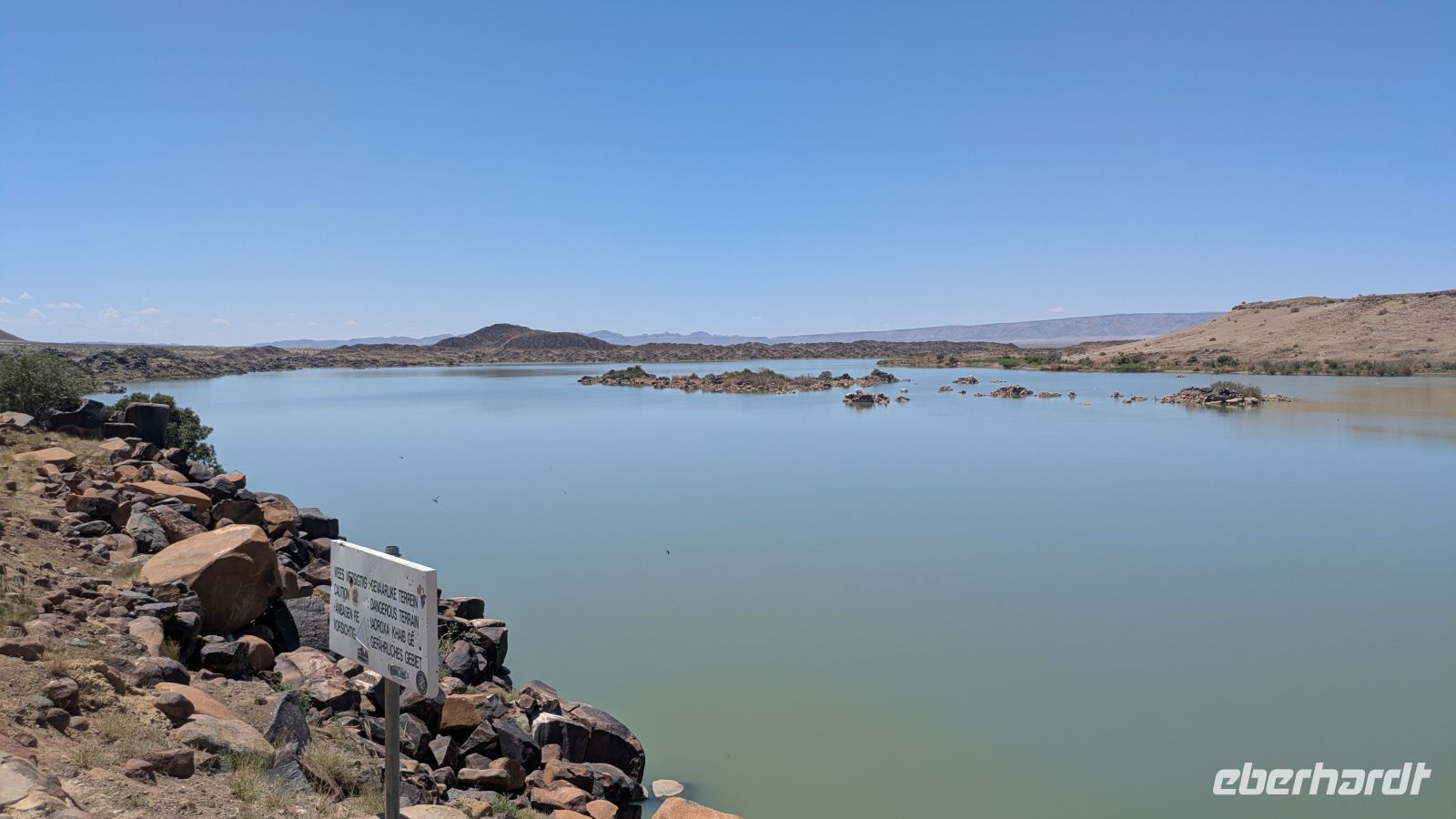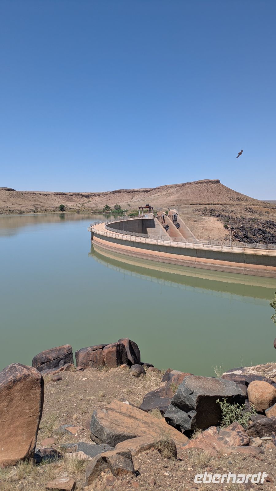 Schon heißt es Abschied nehmen von der traumhaften Lodge, denn unsere Reise führt uns weiter Richtung Aus. Die Strecke ist erneut lang, daher gönnen wir uns ein paar kurze Stopps – erst an einem idyllischen Staudamm, später für einen kleinen Spaziergang über eine Brücke, die den Fish River überquert.