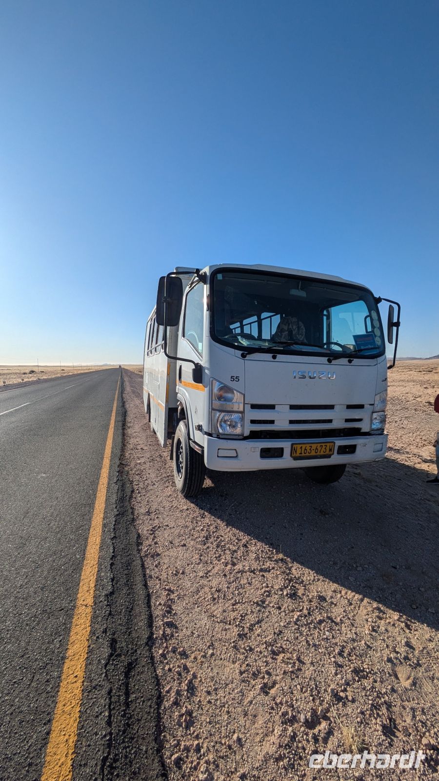 Über Nacht wurde uns ein neuer Bus gebracht, sodass wir pünktlich zu unserer längeren Fahrt in die Namib-Wüste starten konnten.