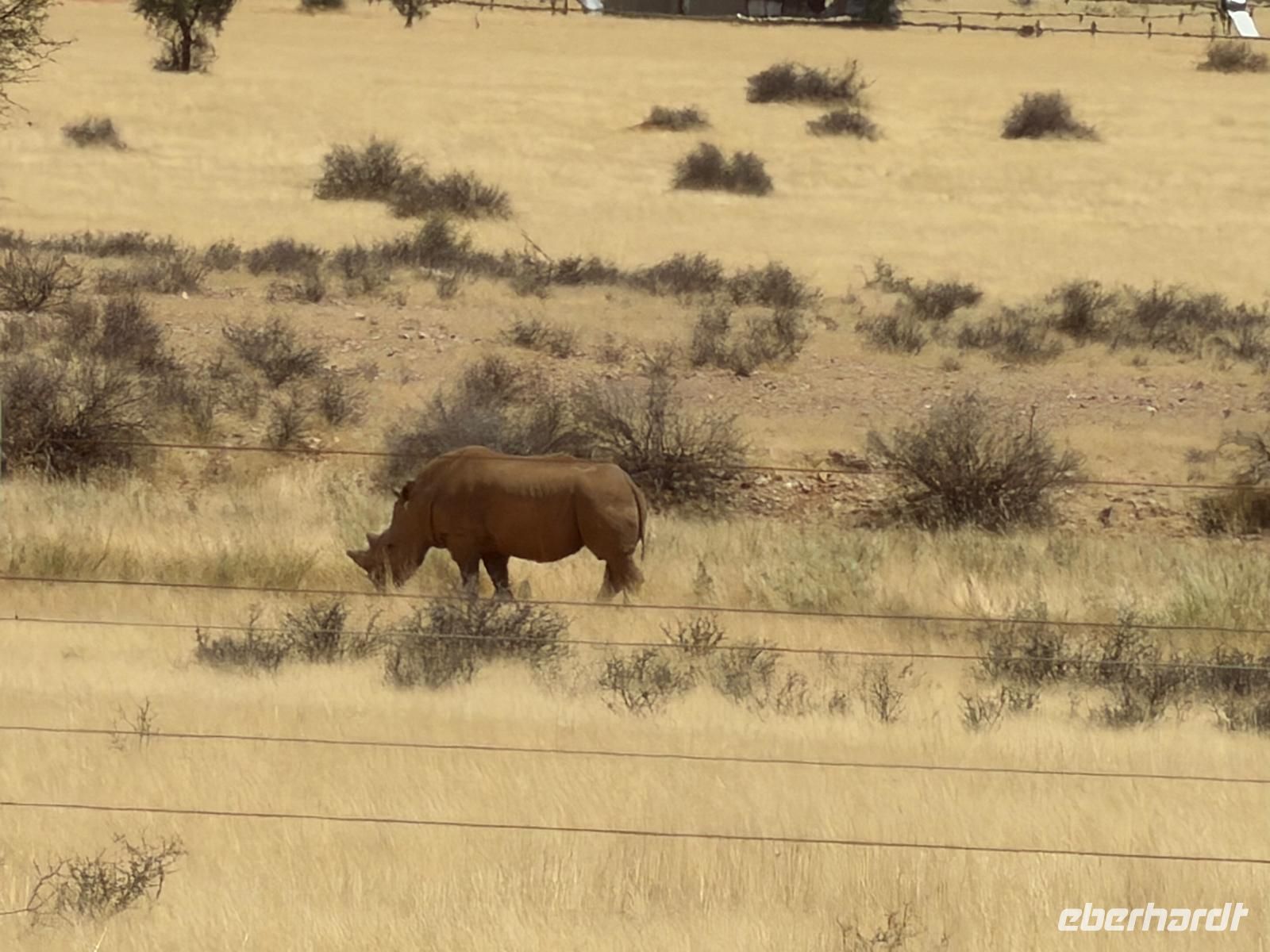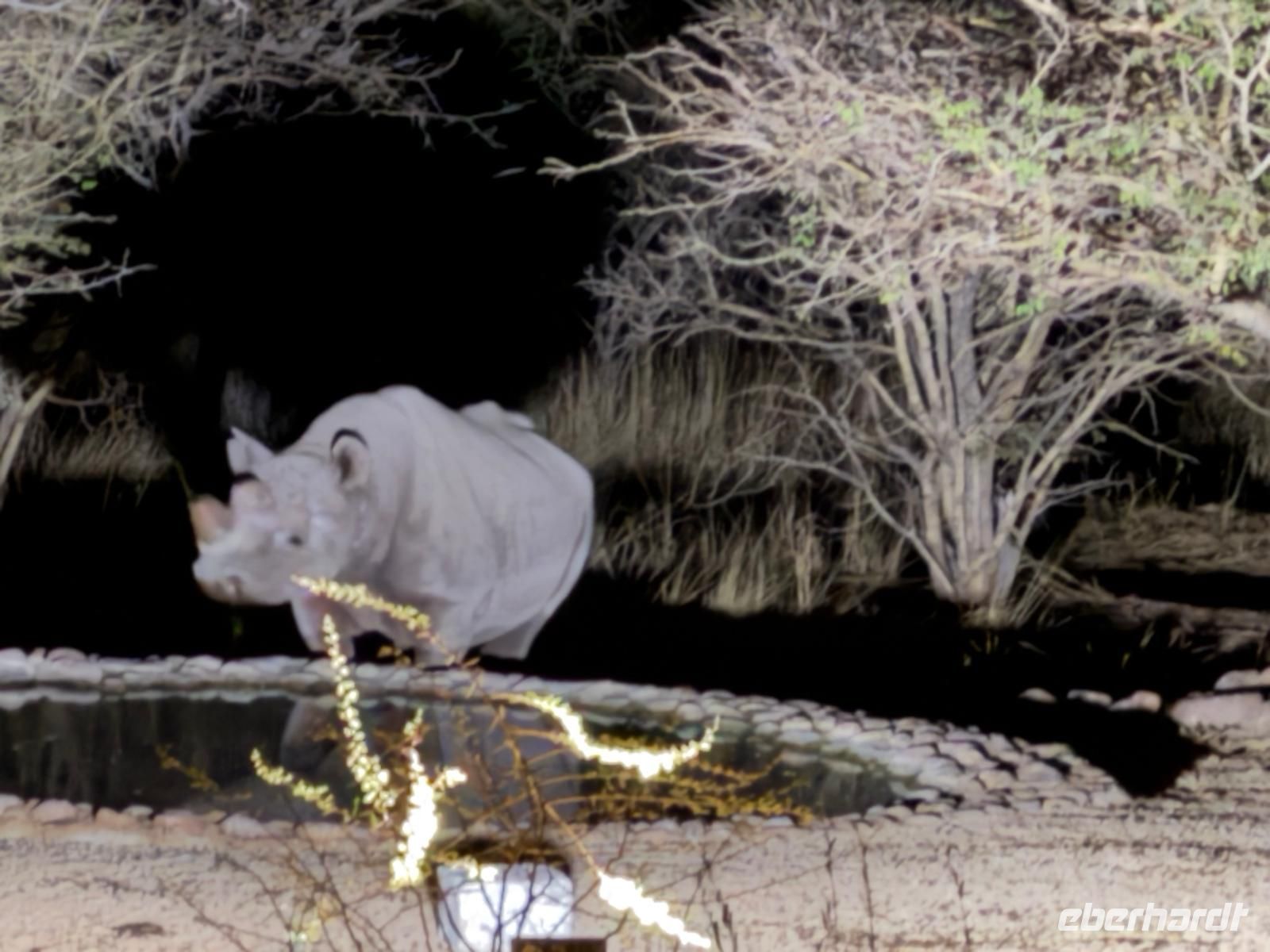 Der Abstieg geht deutlich leichter und schneller, sodass wir rechtzeitig zum Abendessen wieder in der Lodge sind. Und gerade beim Essen gibt es die nächste Überraschung: Ein Nashorn taucht am Wasserloch auf, sodass unser Dinner erstmal zur Nebensache wird.