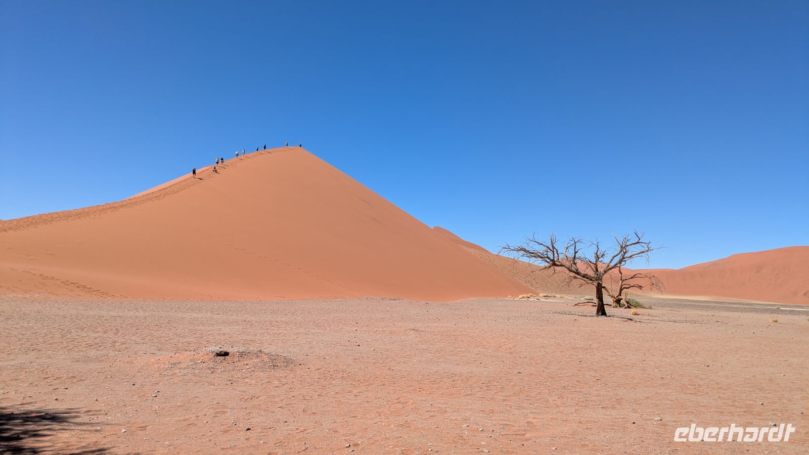 Dort angekommen, empfangen uns die uralten Bäume, die zu den ikonischsten Motiven Namibias gehören. Sie sind über 900 Jahre alt und stehen auf einer ausgetrockneten Lehmpfanne. Einst floss hier der Tsauchab-Fluss entlang, bis riesige Dünen seinen Weg blockierten und er vollständig austrocknete. Die Bäume starben ab, verrotten aber wegen der extremen Trockenheit nicht – so bleiben sie als faszinierende, fast schon surreale Silhouetten erhalten.