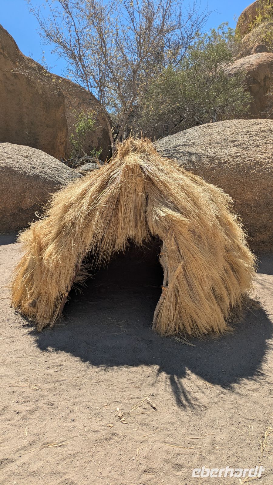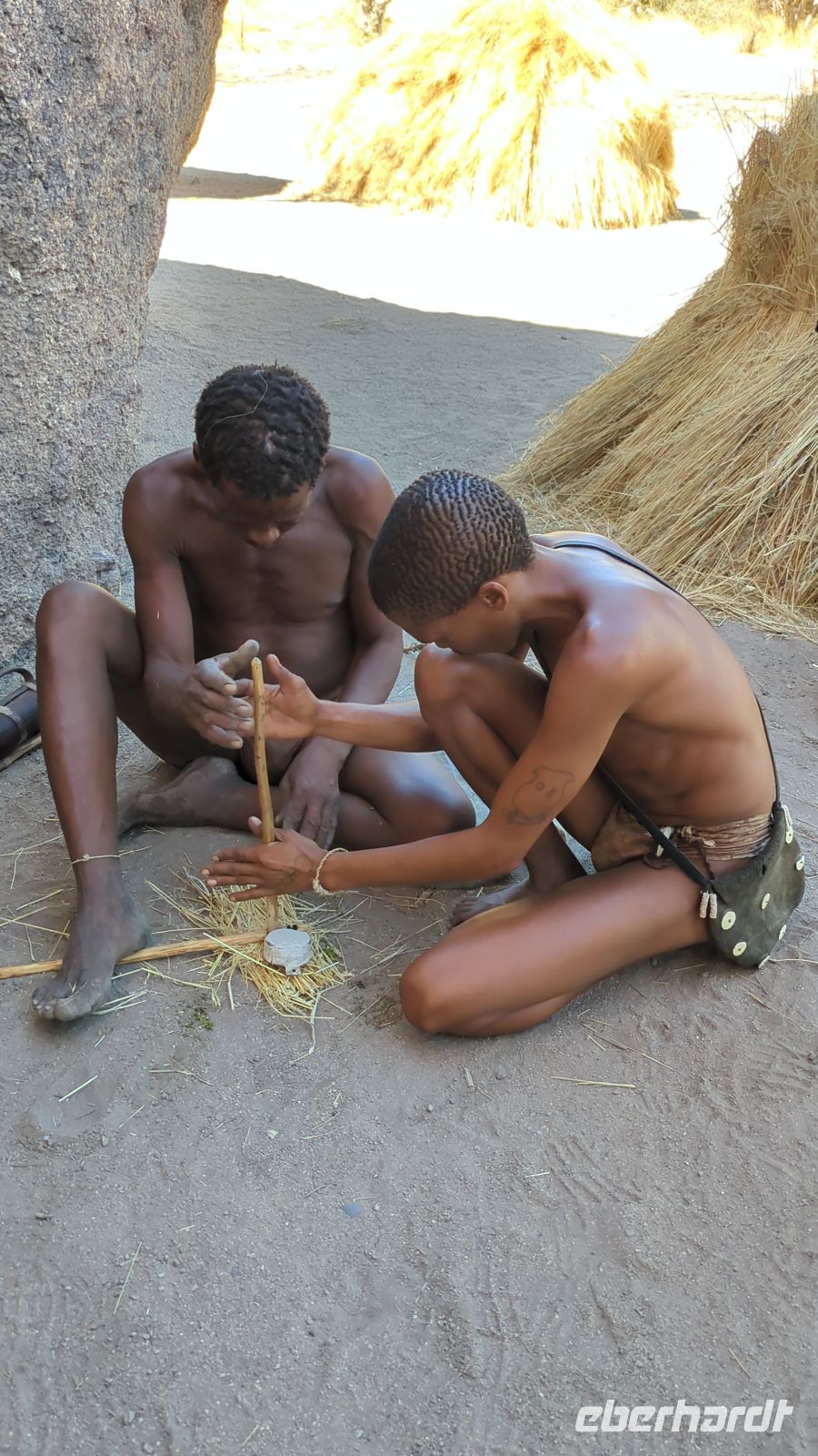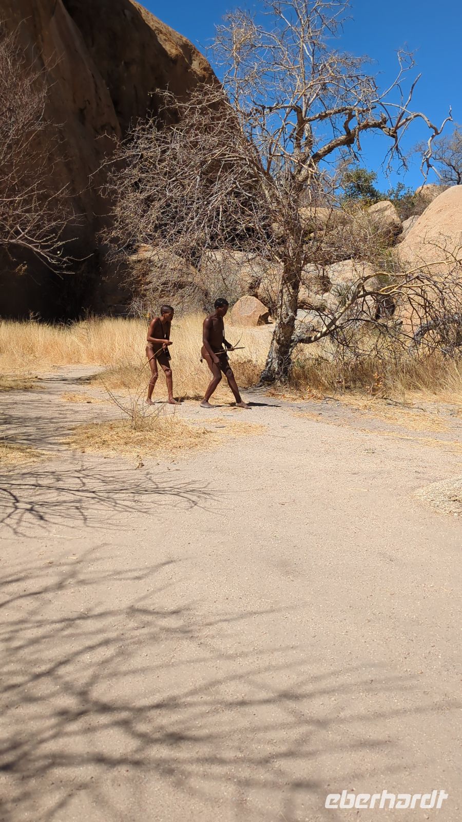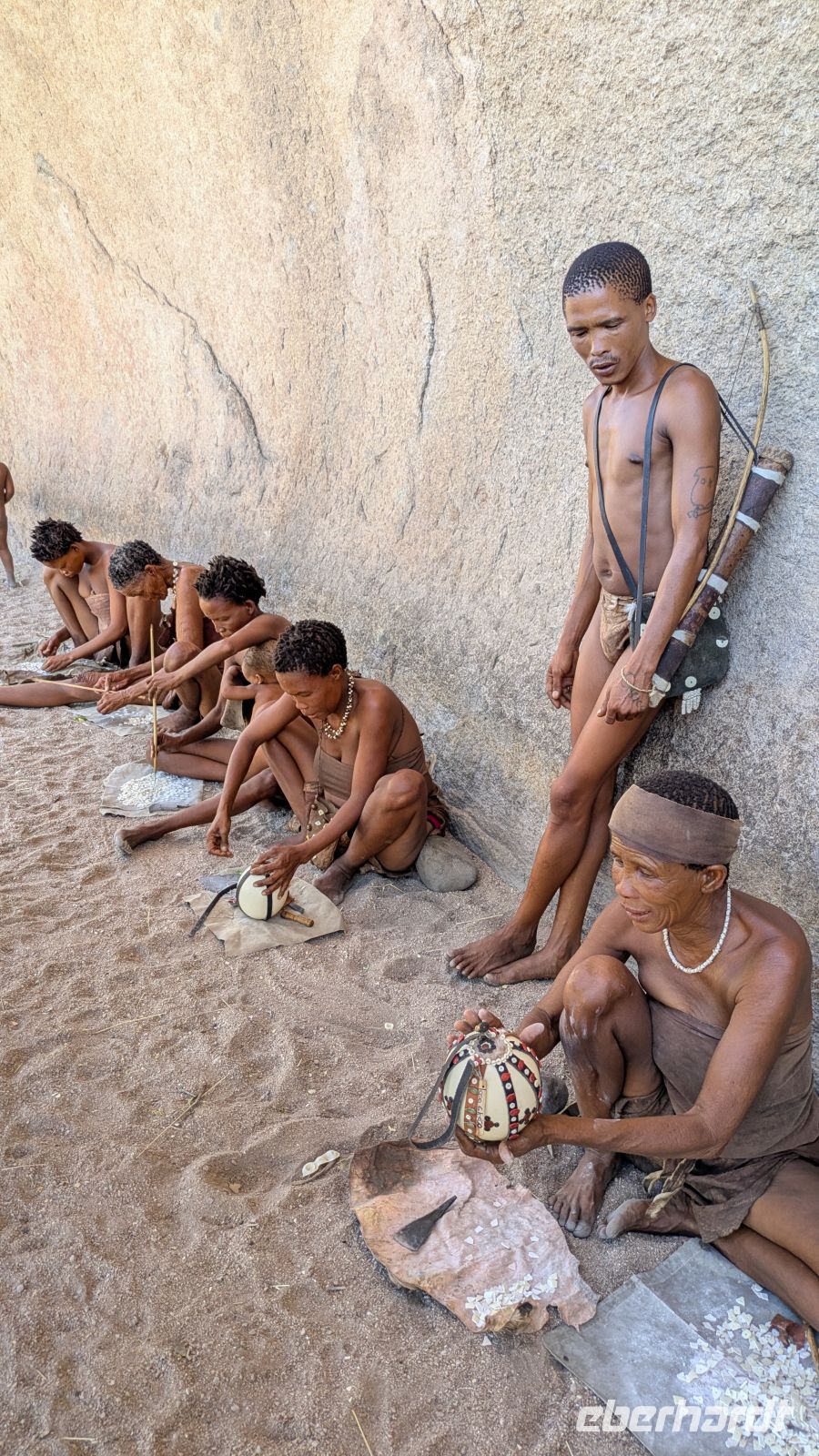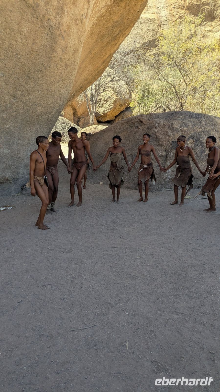 Unser heutiger Stopp liegt ganz in der Nähe unserer Lodge und führt uns zu den Buschbewohnern, dem Stamm der San. Sie leben jeweils für drei Monate in der Wildnis und zeigen uns ihr Leben – quasi als lebendiges Museum. Dabei lernen wir, wie sie Schmuck herstellen und ihre traditionellen Waffen zum Jagen nutzen. Zum krönenden Abschluss präsentieren sie uns noch ihre wunderschönen, traditionellen Tänze.