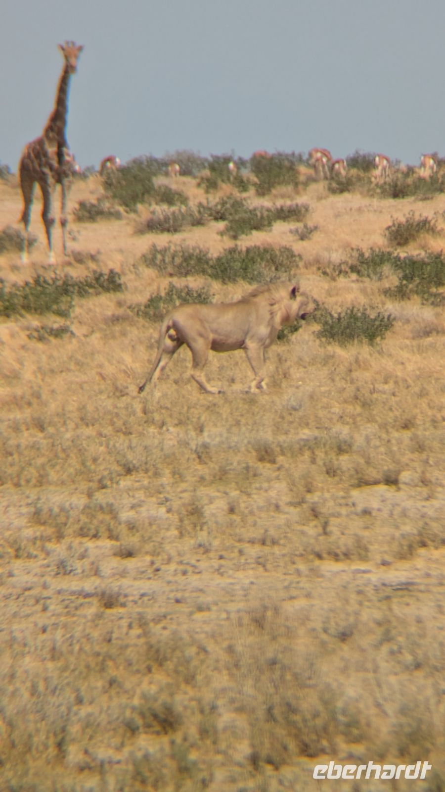 Wir sehen alles von Erdmännchen über Trappen, Zebras, Kudus, Gnus bis hin zu Mangusten – eine bunte Mischung an Wildtieren. Das absolute Highlight sind jedoch das Spitznashorn und die drei Löwen, die wir beobachten können. Die Löwenweibchen gehen auf die Jagd nach Steinböcken und Kudus, während das Löwenmännchen entspannt auf das Essen wartet.