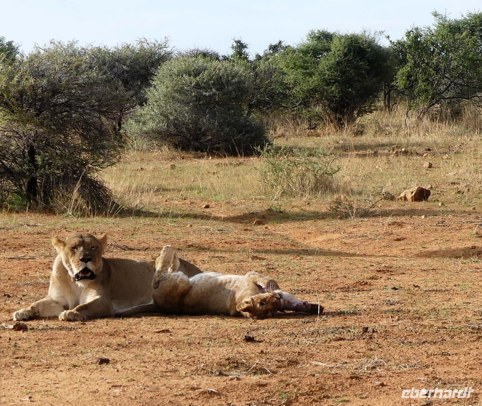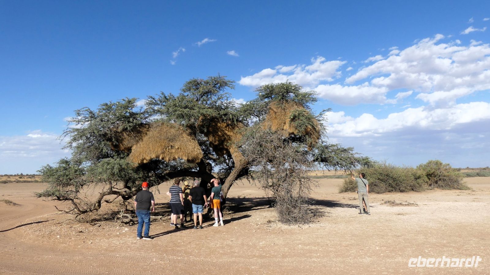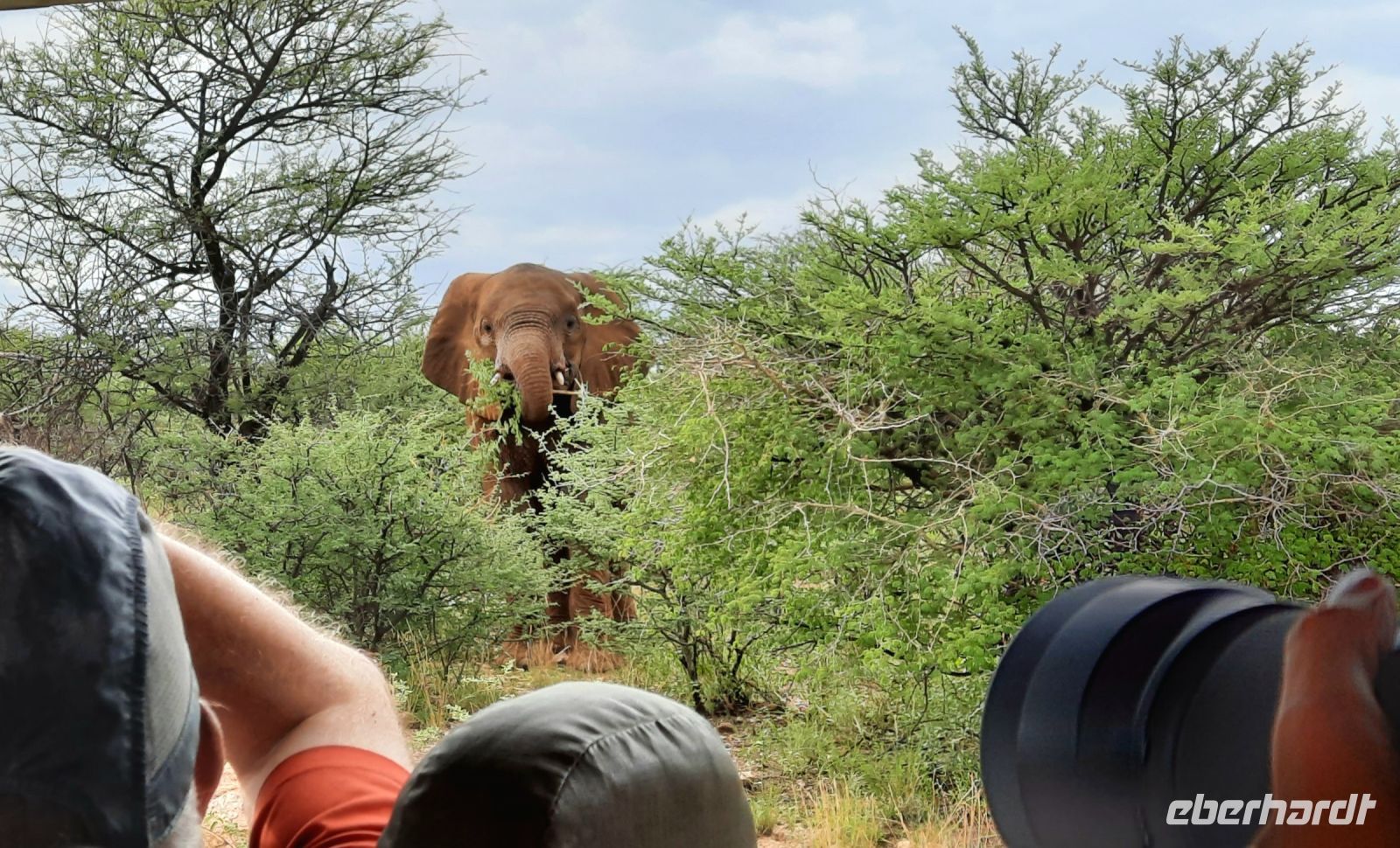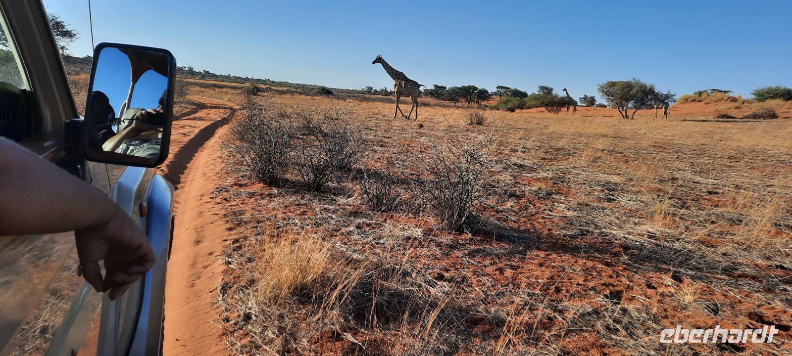 Willkommen in Namibia! Am Morgen landeten wir im sonnigen, grünen Namibia und mussten die Uhren erstmal 1 h vorstellen. Die Passkontrolle der namibischen Beamten dauerte gefühlt eine Ewigkeit. Nach über 1 h waren wir und unsere Koffer vollzählig vereint. Schon ungeduldig wartete Harold, unser örtlicher DriverGuide am Ausgang des Flughafens Windhoek auf uns. Schnell noch an die Geldgeb-Maschine oder zur Bank, damit wir auch mit Namibischen Dollars flüssig waren. Die namibische Hauptstadt ließen wir links liegen und fuhren, vorbei an den Auas- und Khomas-Bergen in südliche Richtung. In der "Basterstadt" Rehoboth legten wir eine Toi- und Tankpause einlegten und gewöhnten uns langsam an die heiße Sonne. Als Baster wurden damals die unehelichen Kinder zwischen den Holländern und den Khoisan bezeichnet. Sie sind etwas hellhäutiger und haben meist blaue Augen. Unser erstes Ziel war die Kalahari. Kurz vor Mariental bogen wir von der asphaltierten B1 auf Sand-Pad ab. In der Ferne konnten wir bereits die Ausläufer der Kalahari erkennen. Die Zentral-Kalahari erstreckt sich von der nördlichen Kap-Provinz in Südafrika durch Namibia und Botswana. Die wellenförmigen, rot leuchtenden, flachen Sanddünen sind meist mit speziellen Dünen- und Wüstengräsern bewachsen. Dazwischen grüne Akazien und dazu der blaue Himmel mit weißen Wölkchen. Was für ein Farbenspiel! Kurze Zeit später erreichten wir unsere erste Unterkunft. Mit kühlem Home made Icetea empfingen uns die freundlichen Mitarbeiter der Kalahari Anib Lodge. Die Lodge befindet sich in einer grünen Oase, mitten im riesigen, privaten Gondwana Naturschutzgebiet. Wir bezogen unsere geräumigen Zimmer, die sich um den Pool reihten. Also kurze Wege für eine Erfrischung im kühlem Nass. Nach den Anreistagen mit Flug war diese Verschnaufpause sehr willkommen: Dusche, Käffchen, Bier, Beine hoch sowie WLAN einrichten, um die ersten Neidbilder nach Deutschland zu senden. Am späteren Nachmittag waren wir Safari fertig. In 2 Jeeps pirschten wir durch die
