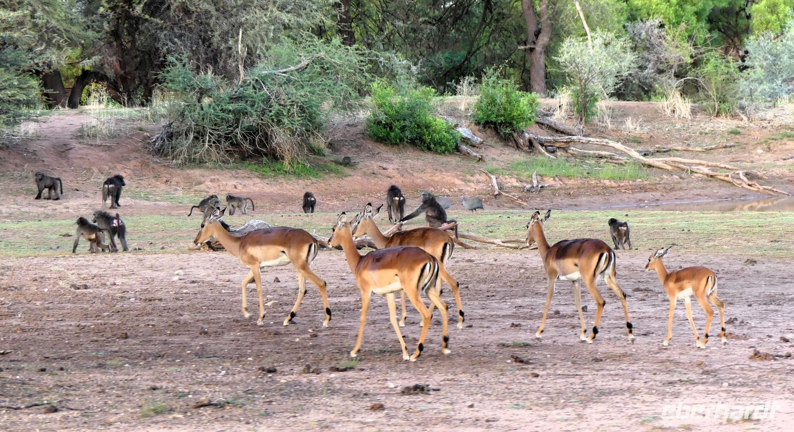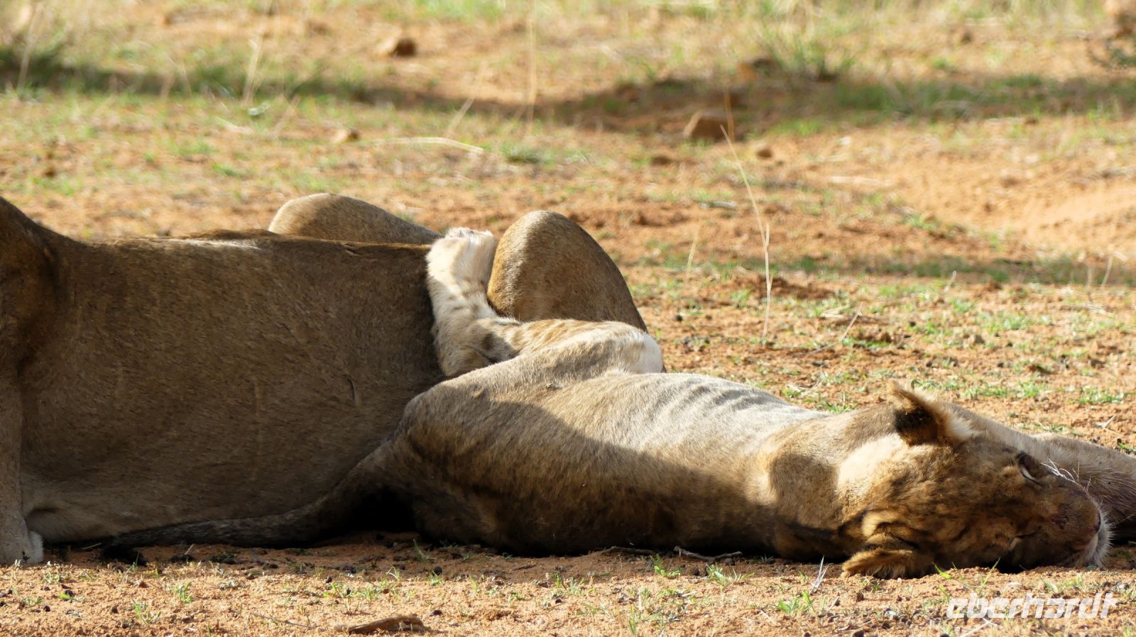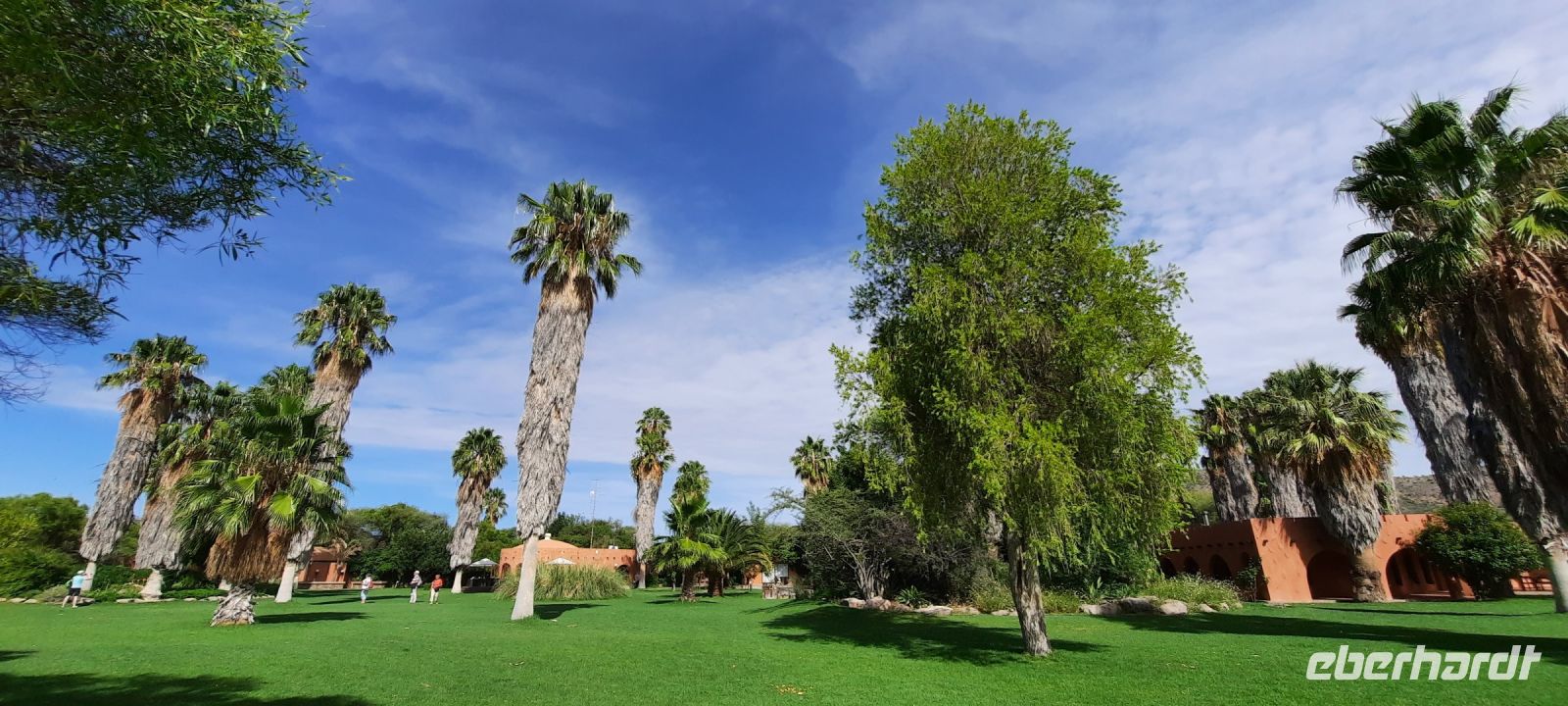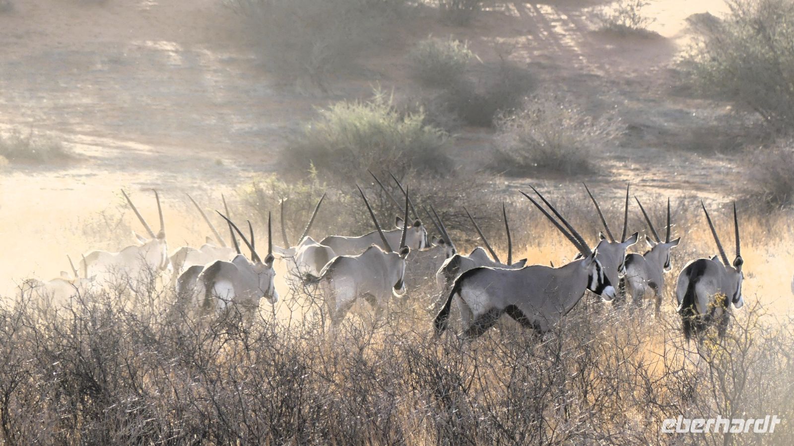 Willkommen in Namibia! Am Morgen landeten wir im sonnigen, grünen Namibia und mussten die Uhren erstmal 1 h vorstellen. Die Passkontrolle der namibischen Beamten dauerte gefühlt eine Ewigkeit. Nach über 1 h waren wir und unsere Koffer vollzählig vereint. Schon ungeduldig wartete Harold, unser örtlicher DriverGuide am Ausgang des Flughafens Windhoek auf uns. Schnell noch an die Geldgeb-Maschine oder zur Bank, damit wir auch mit Namibischen Dollars flüssig waren. Die namibische Hauptstadt ließen wir links liegen und fuhren, vorbei an den Auas- und Khomas-Bergen in südliche Richtung. In der "Basterstadt" Rehoboth legten wir eine Toi- und Tankpause einlegten und gewöhnten uns langsam an die heiße Sonne. Als Baster wurden damals die unehelichen Kinder zwischen den Holländern und den Khoisan bezeichnet. Sie sind etwas hellhäutiger und haben meist blaue Augen. Unser erstes Ziel war die Kalahari. Kurz vor Mariental bogen wir von der asphaltierten B1 auf Sand-Pad ab. In der Ferne konnten wir bereits die Ausläufer der Kalahari erkennen. Die Zentral-Kalahari erstreckt sich von der nördlichen Kap-Provinz in Südafrika durch Namibia und Botswana. Die wellenförmigen, rot leuchtenden, flachen Sanddünen sind meist mit speziellen Dünen- und Wüstengräsern bewachsen. Dazwischen grüne Akazien und dazu der blaue Himmel mit weißen Wölkchen. Was für ein Farbenspiel! Kurze Zeit später erreichten wir unsere erste Unterkunft. Mit kühlem Home made Icetea empfingen uns die freundlichen Mitarbeiter der Kalahari Anib Lodge. Die Lodge befindet sich in einer grünen Oase, mitten im riesigen, privaten Gondwana Naturschutzgebiet. Wir bezogen unsere geräumigen Zimmer, die sich um den Pool reihten. Also kurze Wege für eine Erfrischung im kühlem Nass. Nach den Anreistagen mit Flug war diese Verschnaufpause sehr willkommen: Dusche, Käffchen, Bier, Beine hoch sowie WLAN einrichten, um die ersten Neidbilder nach Deutschland zu senden. Am späteren Nachmittag waren wir Safari fertig. In 2 Jeeps pirschten wir durch die