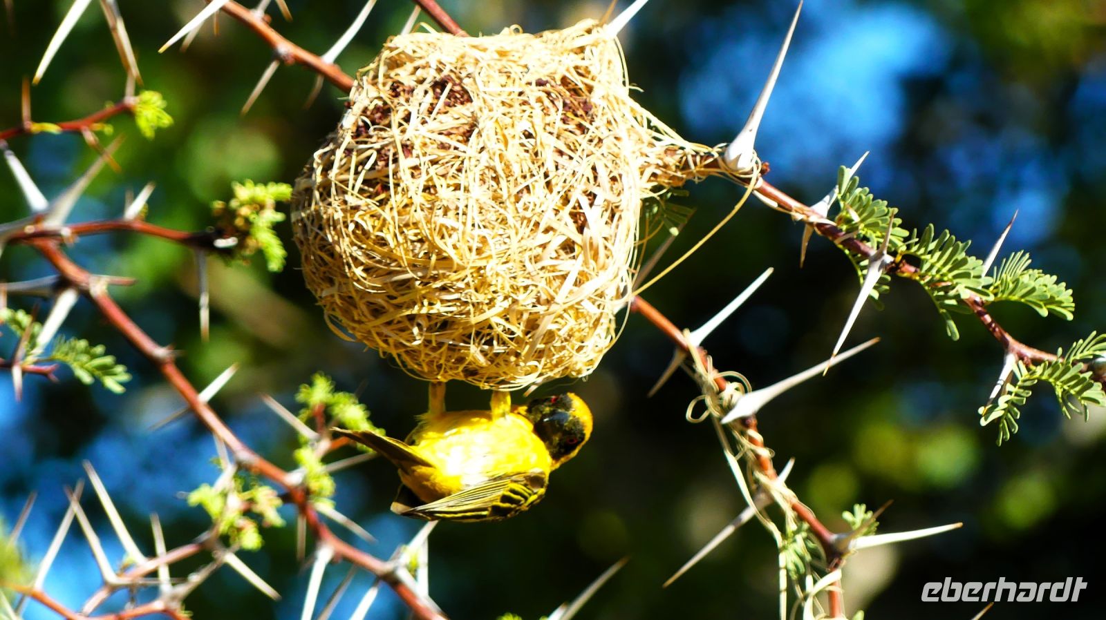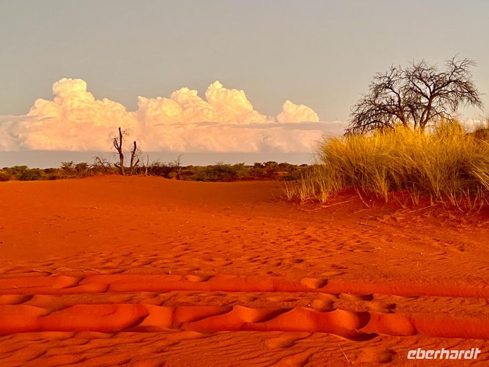 farbenprächtige Landschaft der Kalahari. An einem Kameldorn-Baum studierten wir das riesige Nest einer Webervögel-Kolonie, die unseren Spatzen ähnlich sind. Diese Nest war das Zuhause von 200 Vögelchen. Ständig wird am Nest gebaut. Gern bilden die Weber-Vögel eine Symbyose mit Falken oder Uhus, um ihre Brut vor Schlangen zu schützen. Geben und nehmen gilt im Tierreich. Woher stammt eigentlich der Name Kameldorn-Baum? Der Name wird aus dem Afrikaans Wort Kaameldoring abgeleitet, was soviel wie Giraffen Dorn bedeutet. Giraffe heißt auf Afrikaans Kamelpferd. Alles klar? Vor über 1000 Jahren waren Giraffen noch unbekannt. So wurden sie von den Römern Kamele mit Leopardenfell genannt oder stammt der Name von den Engländern, die damals durch die Gegend zogen und immer wieder "Kamele" (Giraffen) an diesem Baum sahen? Giraffen lieben die grünen Blättchen. Trotz der vielen Dornen schaffen sie es, mit ihrer ca. 30 cm langen, Sandpapier artigen Zunge das saftige Grüne unbeschadet zu naschen. Heute ist dieser immergrüne Baum mit seinem harten Holz in Namibia streng geschützt. Da fällt mir doch gleich das alte Pfadfinderlied ein: .....Hart wie Kameldorn-Holz..... und scheu im Busch sind die Tiere.... Natürlich sahen wir auf unserer ersten Pirsch auch Tiere: Giraffen-Familie, Springböcke, große Oryx-Herde mit Jungtieren, Gnus, Strauße und anderes Federvieh. Auf einer Düne erlebten wir den ersten magischen Sonnenuntergang. Mit einem passenden, meist geistreichen Getränk und kleinen Snacks stießen wir auf den ersten Tag unserer Reise. Wir waren angekommen! Die Rückfahrt zur Lodge war spektakulär. Denn wie im letzten Jahr um diese Zeit kündigten Blitz, Donner und ein dramatisches Wolkenspiel ein Gewitter an, von dem wir aber relativ verschont blieben.
