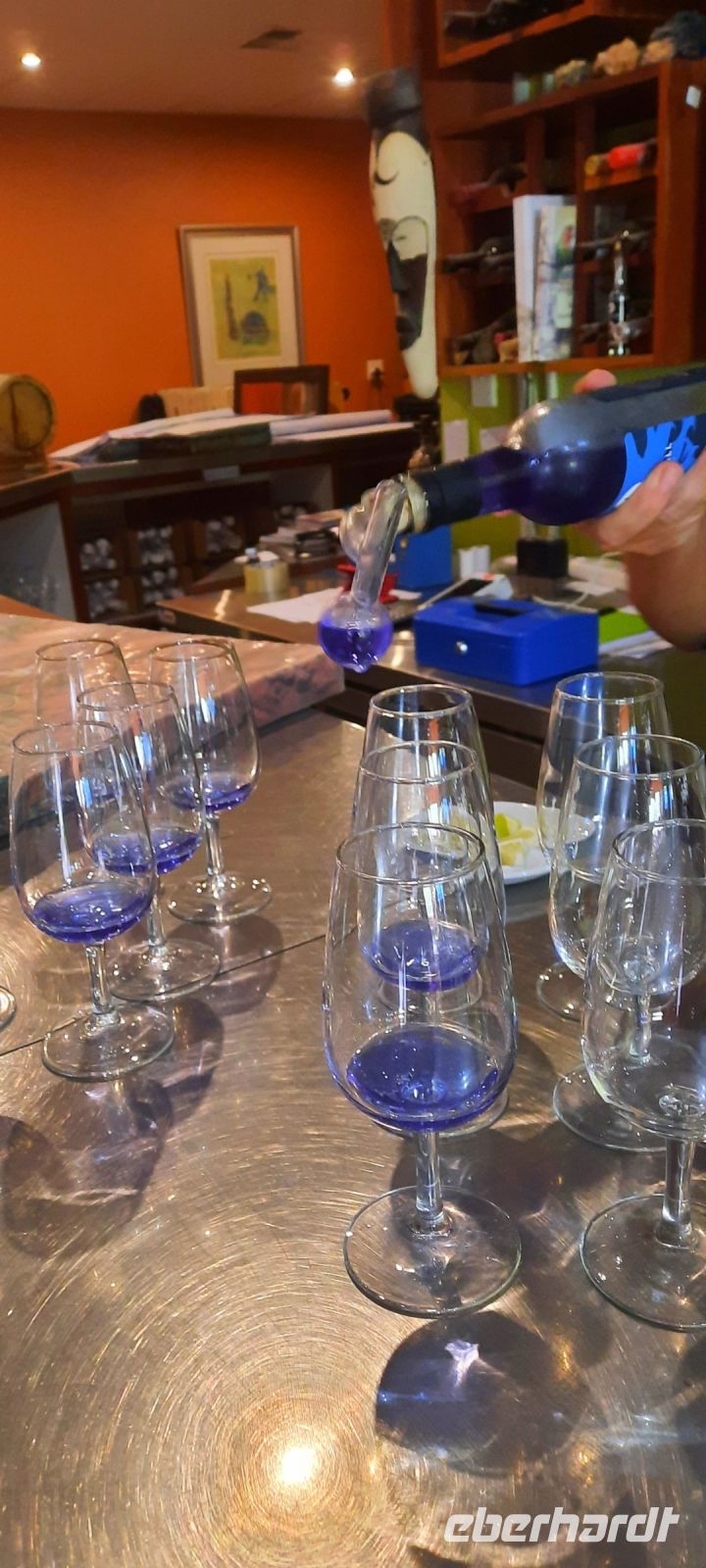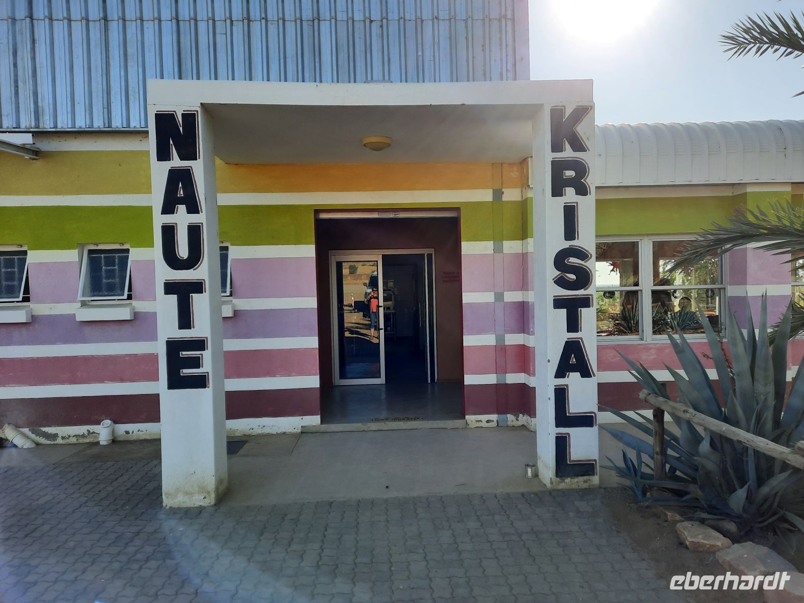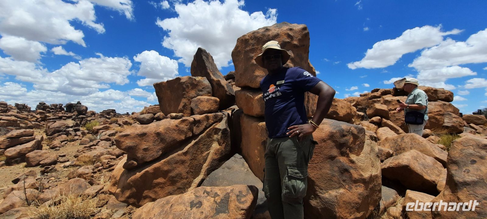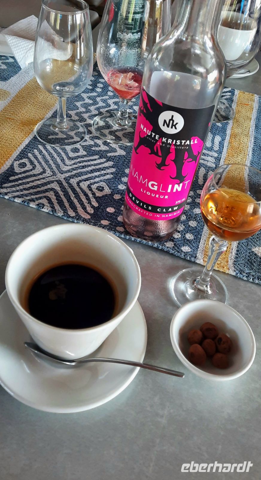 Exemplare zu finden sind. Wir erfuhren, dass der Köcherbaum kein Baum ist, sondern eine Aloen Art (Sukkulente), die ca. 8 m hoch werden kann und endemisch ist. Der Name stammt von den San, die aus den "hohlen" Ästen Pfeilköcher schnitzten. Auch nutzten die San diese als Wasserspeicher. Die hiesigen Aloen sind ca. 200-300 Jahre alt und stehen unter Naturschutz. Die Äste wachsen immer zweigablig. Harold zeigte uns seine Manneskraft und hob einen abgestorbenen Stamm leicht in die Lüfte. Haha, die Stämme sind hohl, außen zwar hart, aber innen mit einem Schwammgewebe (Wasserspeicher). Bei unserem kleinen Spaziergang durch den "Wald" beäugten uns Klippschliefer (nächster Verwandter der Elefant), die zwischen den Steinen Schutz vor der Sonne suchten. Anschließen fuhren wir zum Spielplatz der Riesen oder Giganten (Giant`s Playground). Enorme Temperaturunterschiede sprengten die Dolerit-Felsen auf und so formten sich hier bizarre Formationen, die allesamt aussehen wie ein unaufgeräumter Baustoff-Hof. Manche Gäste erklommen die Steine, Annett auch, um ihre Gäste in diesem Labyrinth nicht aus dem Auge zu verlieren. Das Basaltgestein vulkanischen Ursprungs soll ca. 180 Mill. alt sein. Einige Steine glänzten als wären sie poliert. Das ist der sogenannte Wüstenlack. Die eingeschlossenen Mineralien dringen nach außen und werden durch die Witterung poliert. Auf Wunsch der Gäste drehten wir in Keetmanshoop noch eine Ehrenrunde. Früher bewohnten die Namas (Bevölkerungsgruppe aus dem südlichen Afrika stammend) dieses Gebiet und nannten es Modderfontein (Schlammquelle). Später kamen die Missionare. Später wurde der Ort nach dem deutschen Kaufmann und Bankier Johann Keetman benannt, der damals Direktor der Rheinischen Missionsgesellschaft war. Unweit von Keetmanshoop befindet sich der Neckartal-Staudamm, der nun mehr größte Namibias. Namibia wird hauptsächlich mit solchen Staudämmen mit Wasser versorgt. In den letzten Jahren hat sich an der Infrastruktur in Keetmanshoop viel getan. Die Stadt ist Verkehrsknotenpunkt und Versorgungszentrum, direkt an der Hauptverbindungsstraße (B1) nach Südafrika und nach Lüderitz gelegen. Apropos Sprit: Die Spritpreise legt die Regierung fest. In den letzten 2 Jahren gab es massive Erhöhungen. Heute kostet der Liter (Diesel) ca. 1 €.. Das statistische Durchschnittseinkommen liegt bei ca. 500 € liegt (in der Realität sicher geringer). Ich ziehe jetzt mal keine Parallelen zu Deutschland. Danach ging es weiter Richtung Grünau. ....Mariental, Neckartalstaudamm, Grünau, Seeheim - langsam fragten wir uns doch, ob wir wirklich in Namibia sind? Die vielen Orte mit deutschen Namen hängen natürlich mit der deutschen Vergangenheit zusammen. Kurz vor Seeheim bogen wir wieder auf Sandpiste ab, fuhren immer entlang der Eisenbahnlinie (leider kein Zug) und hielten vorschriftsmäßig an den unbeschrankten Bahnübergängen. Am Löwen-Rivier (früher, also ganz früher gab es dort wirklich mal Löwen) war es schön grün. Hier befindet sich der Naute-Staudamm, der die Region mit viel Wasser versorgt. Da es Anfang schon etwas geregnet hat, waren die Staudämme in Namibia schon gut gefüllt. Familie Weder (Naute-Kristall, einer kleinen, privaten Destillerie) freute sich auf unseren Besuch. Für mich ein Wiedersehen bei Freunden. Sie kaufen hier von den Plantagen Dattelpalmen/Wein/Kaktusfeigen, die nicht in den Export gehen können. Alles Zutaten für ihre Selbstgebrannten: NamGin mit Teufelskralle, Nappa (statt Grappa) und anderen geistreichen Spirituosen = Genuss & Leidenschaft! Natürlich stand eine Besichtigung der Micro-Destille und eine Verkostung auf dem Programm. Als Entreè präsentierte uns Katrin ihre neueste Kreation, den Blue Gin Devils Glaw, immerhin 45 %. Der blaue Gin ist Magis pur und verändert bei Zugabe von Tonic seine Farbe in pink! und natürlich absolut lecker. Bei warmen Toasty und frischen Salat mit Grantatapfel Dressing ging die Verkostung weiter, besonders der markante Geschmack des NamGin ist einzigartig. Noch ein guter Espresso und dann mussten wir uns verabschieden. Wer übrigens die leckeren Spirituosen in Deutschland verkosten möchte schaut einfach bei Namshop nach. Demnächst wird auch der Blue Gin dort verfügbar sein.