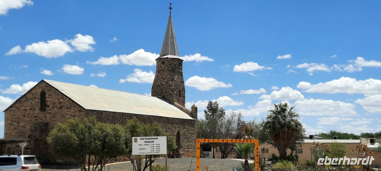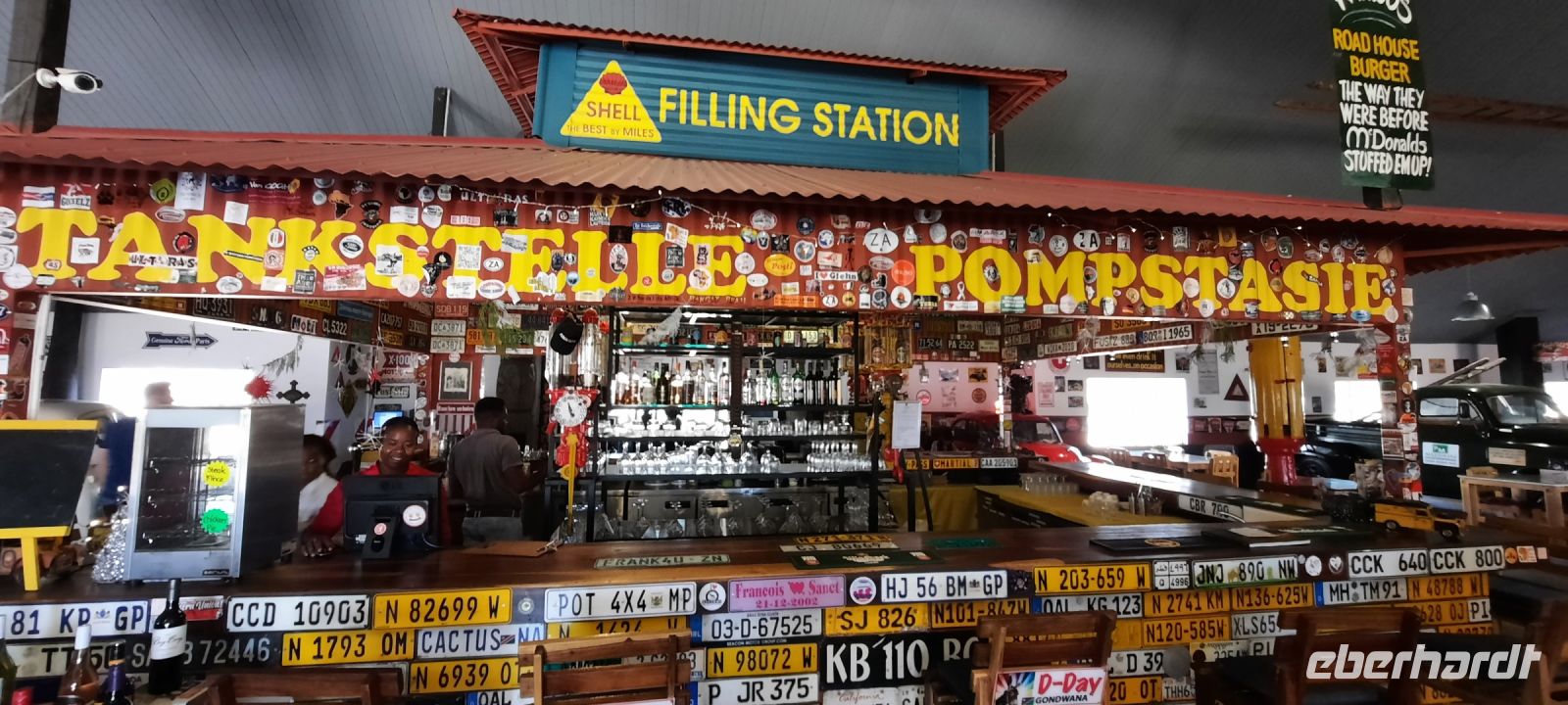Nach dem wir gut gefrühstückt hatten, erklang das Hoppi, hoppi! Also einsteigen und ab zur erfrischenden Atlantikküste. In Solitaire pausierten wir dann für 2T (Toi, Tasse Kaffee). Auch gab es wieder allerhand zum Schauen, nur die Erdmännchen fehlten. Dafür sahen wir aber eine zutrauliche gelbe Manguste, die wir zunächst für ein Erdmännchen hielten. Im "Verkehrsknotenpunkt" Solitaire ging es beschaulich zu, wo sich sonst doch hier zig Touristen tummeln. Der berühmte Apfelkuchen von McGregor wird immer noch gebacken und ist über Kontinente bekannt. Aber auch alte Fahrzeuge, Nostalgisches und Lustiges gab es zu entdecken. Weiter ging es durch die einsame, unendliche Weite des Namib Naukluft Parks. Die Landschaft wurde immer karger und steiniger, aber nicht weniger interessant und faszinierend. Harold eine mächtige